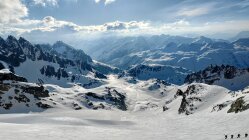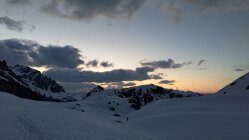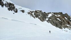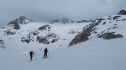 Aufstieg: Start beim Hotel Tiefenbach um 05:00. Es hat über Nacht gut abgestrahlt, die Schneedecke ist hart, aber recht griffig. Wir sind zu Beginn östlich des Tiefenbachs geblieben. Unterhalb der Albert-Heim-Hütte gab es genug Licht, so dass wir sehen konnten, dass es überraschend wolkig war. Auch der Wind blies phasenweise kräftig, so dass es überraschend kalt war. Der weitere Aufstieg über den Tiefengletscher ist problemlos, wobei für den steilen Bereich zwischen 2.500m und 2.600m Harscheisen empfehleswert waren. Aufgrund der Wolken liessen wir uns ab hier Zeit und kamen gegen 09:00 bei immer noch dichten Wolken und einer Wolkenuntergrenze um die 3.400m beim Bergschrund unterhalb des Couloirs an. Skidepot wurde unterhalb diesem gemacht. Wir kamen zu unserer Überraschung als erste an, eine zweite Gruppe ging zum weiter östlich gelegenen Steig.