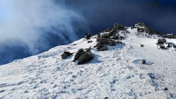 Am Gipfelgrat selbst haben die Wolken endlich aufgemacht, und es wurde wärmer. Bei dann guter Sicht bis zum Gipfel, Ankunft um etwa 10:30. Die Verhältnisse am Gipfelgrat waren gut, weitestgehend guter Trittschnee. Steigeisen und Pickel sind aus meiner Sicht obligatorisch. Kurz nach uns kam die Gruppe an, die den östlicheren Aufstieg genutzt hatte. In diesem waren die Verhältnisse wohl zumindest im Aufstieg einfacher.