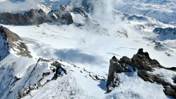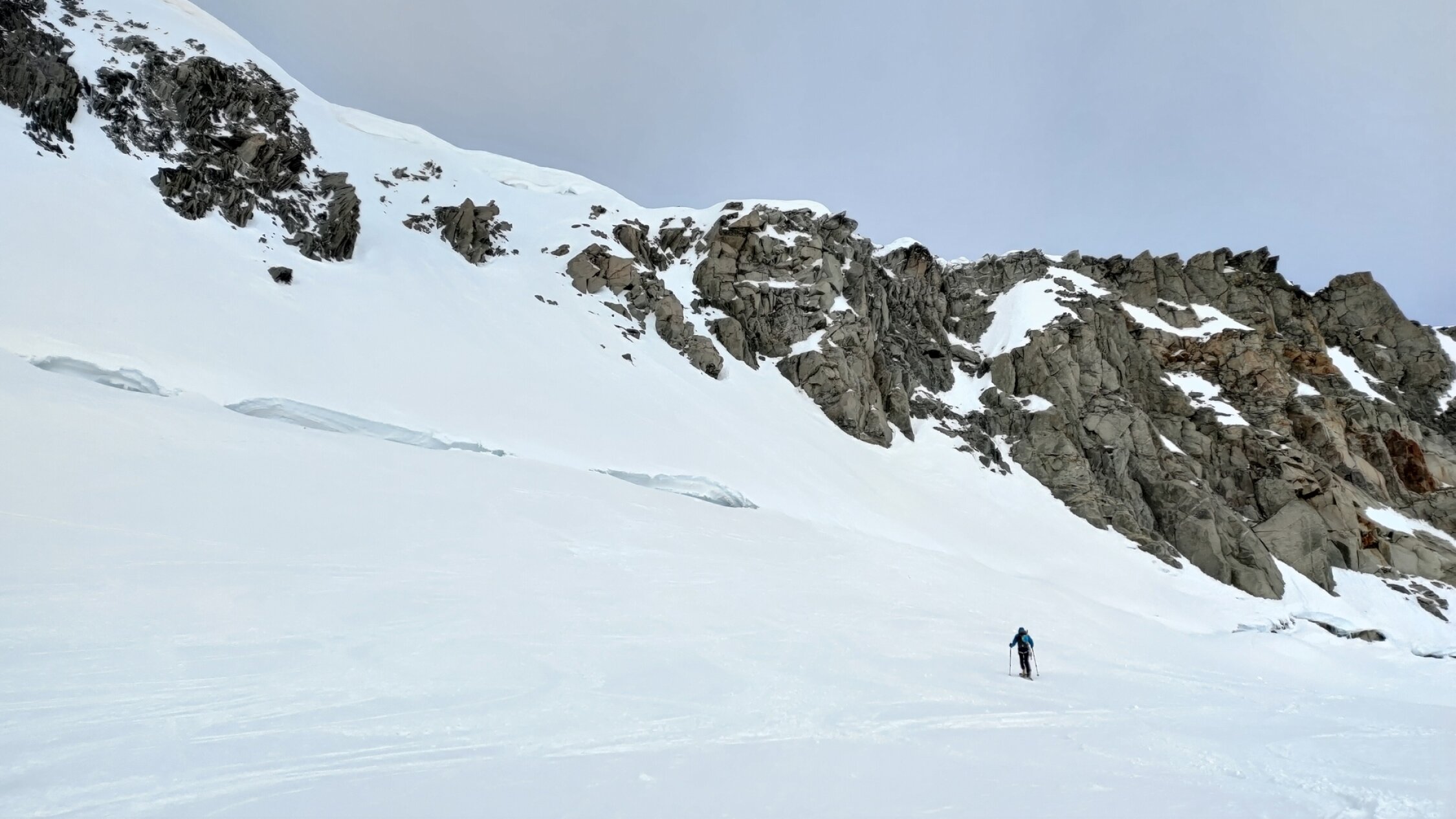 Der Bergschrund selbst war gut zu überwinden. Der Aufstieg durchs Couloir war anspruchsvoller als erwartet, da es keine Tritte gab, der Firn aber sehr hart war. Im steilsten Stück habe ich daher Tritte geschlagen, bis ca. 20m unter dem Grat ein Bergführer mit zwei Kundinnen an uns vorbeizog. Dessen Spuren habe ich dann gerne genutzt.