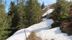 Die Route war durchweg trocken. Schneekontakt gab es keinen. Nördlich vom Gipfel in der Flanke liegt noch einiges an Schnee. Der Rundweg oberhalb der Nordflanke liegt noch unter Schnee und ist derzeit nicht empfehlenswert ohne entsprechende Ausrüstung. Die Route ist bei Verhältnissen wie heute einfach. Eine schmale, felsige Stelle im oberen Teil noch vor dem Hohkelchsattel könnte bei Vereisung etwas Vorsicht erfordern.