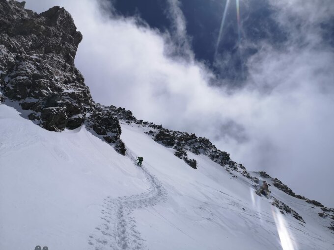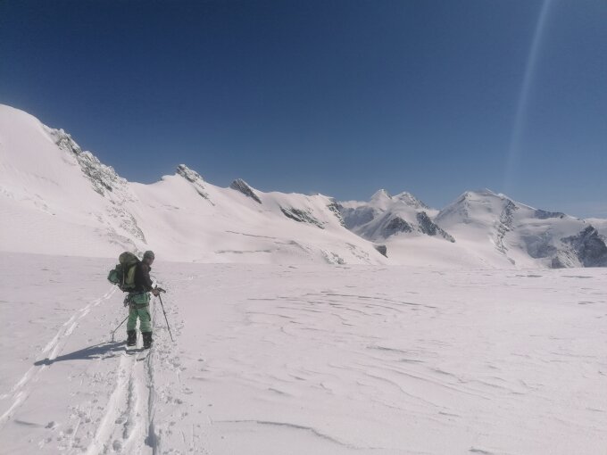 Start um ca. 10:30 von der Bahnstation, um ca. 12 beim roccia nera. Inzwischen hatten sich die Wolken verzogen und ca. 3 Seilschaften spurten den Pollux hinauf. Daher liessen wir uns auch verleiten, um 2 am Gipfel. Bis auf die etwas eisigen Ketten gings tiptop. Am Gipfel Grat ca. 40cm tiefe Spur. Abfahrt über Schwarztor super 20-40cm Pulver, allerdings wird es auf den letzten 100-150hm steinig, Riding on Eggs. In ca. 2h auf Skitouren Spur zur Monte Rosa Hütte, am Gornergletscher unten wenig schnee, der gerade so die Steine überdeckt, Hüttenaufstieg hat eine gute Spur. Zustieg über Schwarztor wahrscheinlioch derzeit der angenehmste.