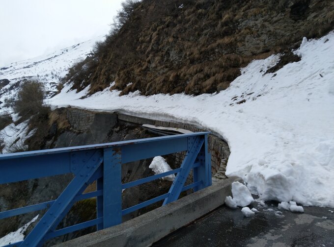 Ab Brücke noch viel Schnee am Weg mit nur einer kurzen Tragestelle.