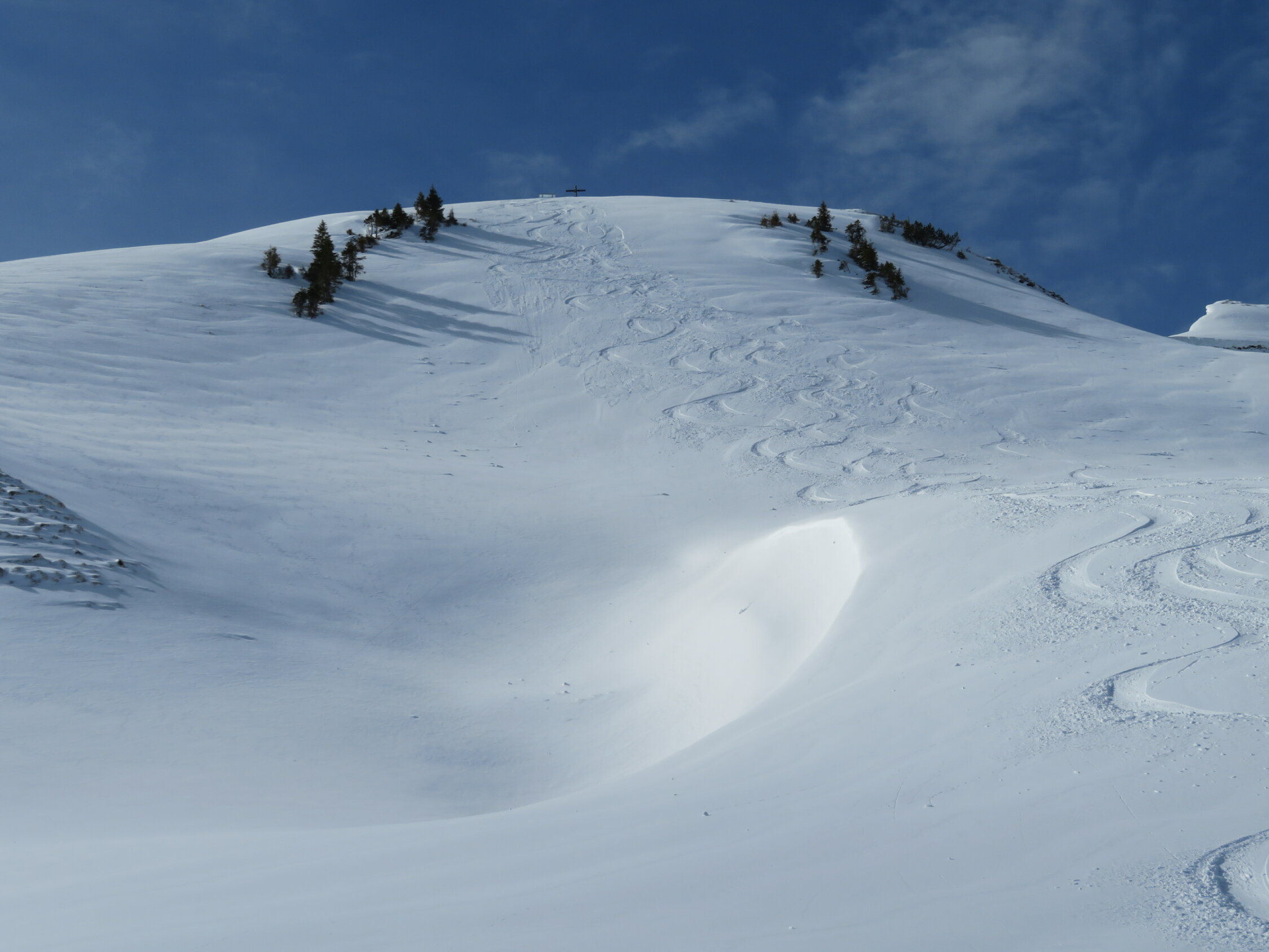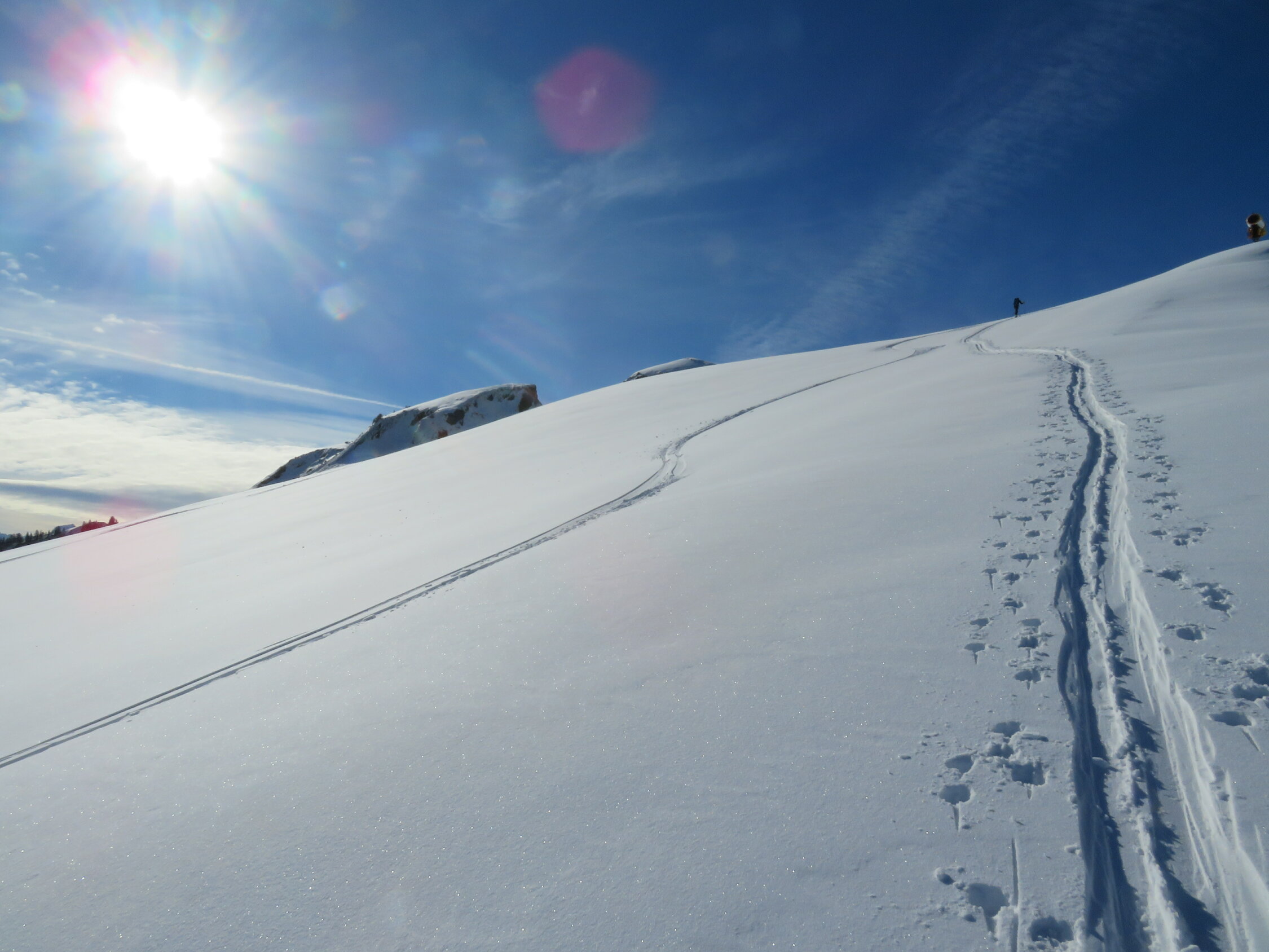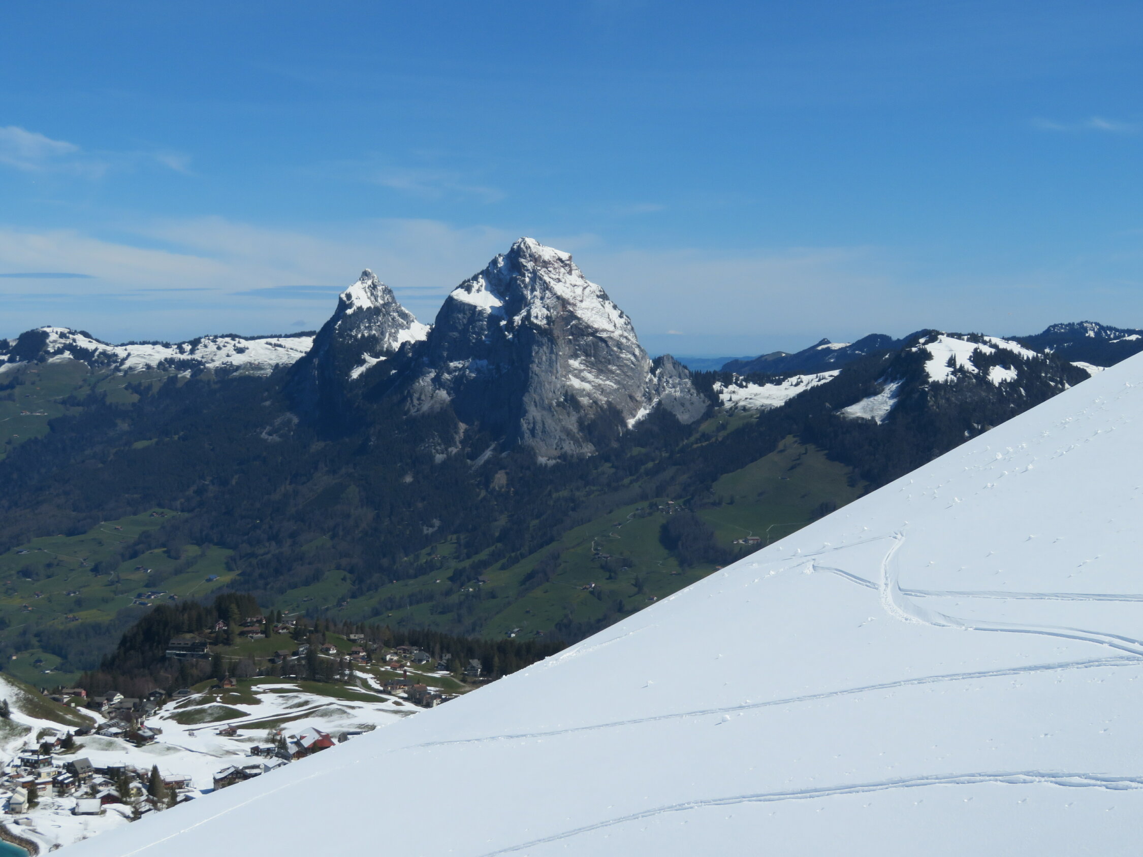 Pulverschnee im Mai, nicht immer so. Von der Bergstation Stoos her auf guter Unterlage mit feinem Powder zum Gipfel. Die Abfahrt, besonders der steile Gipfelhang war fantastisch, so, dass ich gleich nochmals die Felle montierte und zum Firnboden aufstieg. So um 11.00 Uhr wurde der Schnee klebrig und blieb an den Fellen hängen. Aber nochmals eine schöne Abfahrt via Unterbäch zum Stoos.