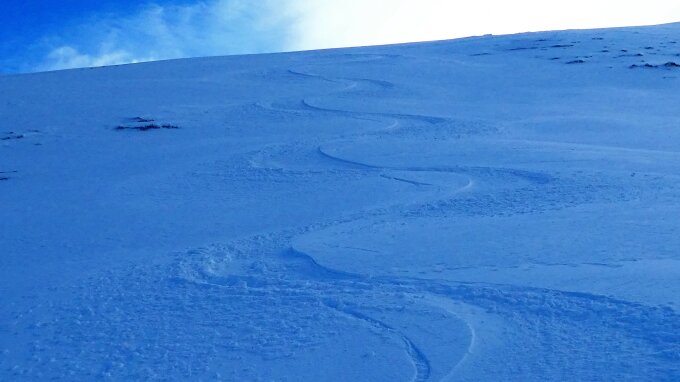 Start um 0620 Uhr im Hinterste Chirel beim Schiessplatz. Aufstieg bis auf den Grat beim "Gipfelaufbau" (~2400müM)des Hohniesen, Ankunft 0740 Uhr. Prächtige Stimmung und bereits war der Südostwind zu spüren. Erste Abfahrt bis oberhalb Sennhütte und Wiederaufstieg bis zum Grat. Oben bis ca. 1900m 20cm Pulver vom feinsten; weiter unten wenige Zentimeter und die letzten ca. 200HM gefroren und griffig. Zurück beim Fahrzeug um 0915 Uhr. Das Timing hat heute perfekt gepasst.
