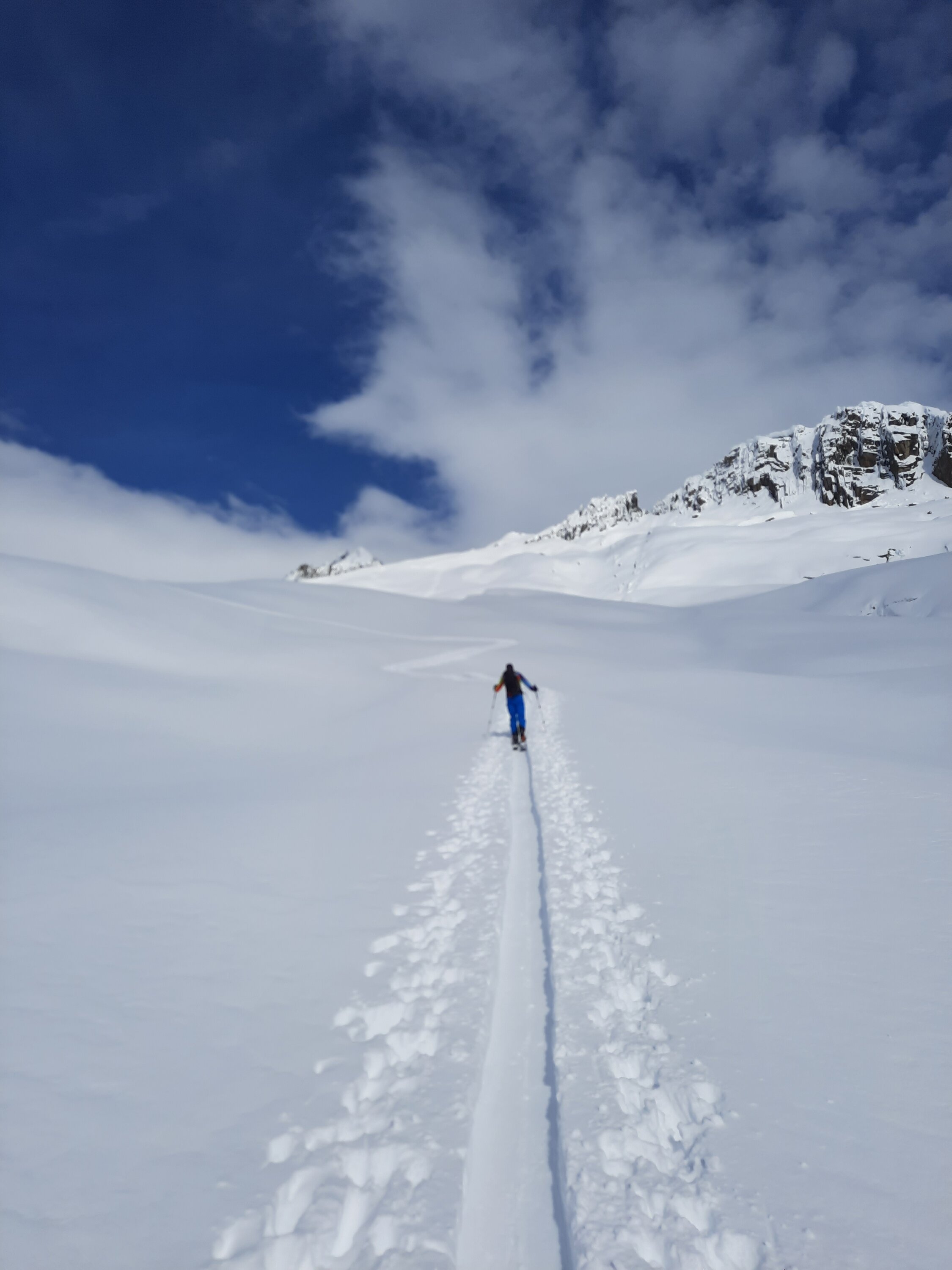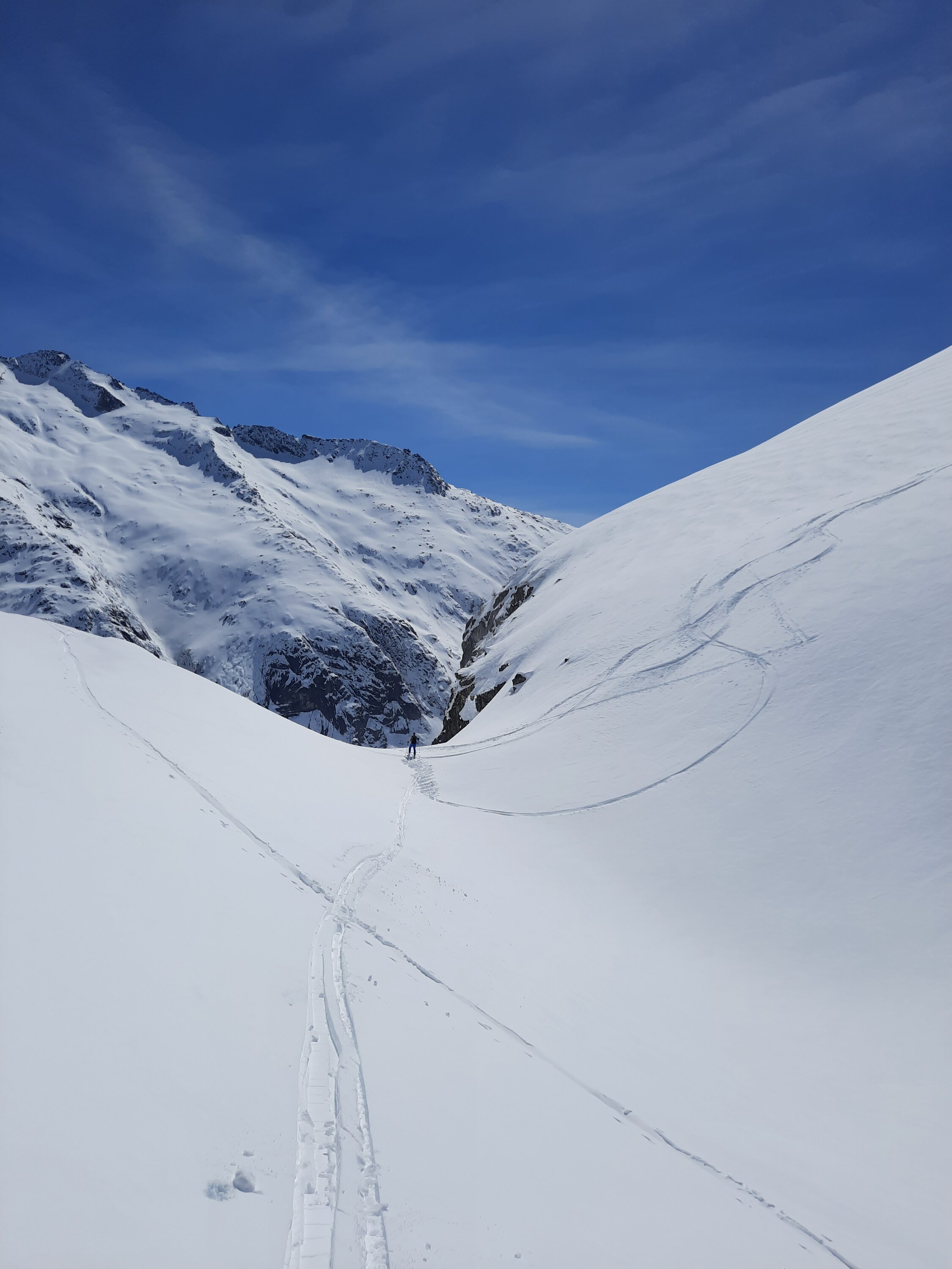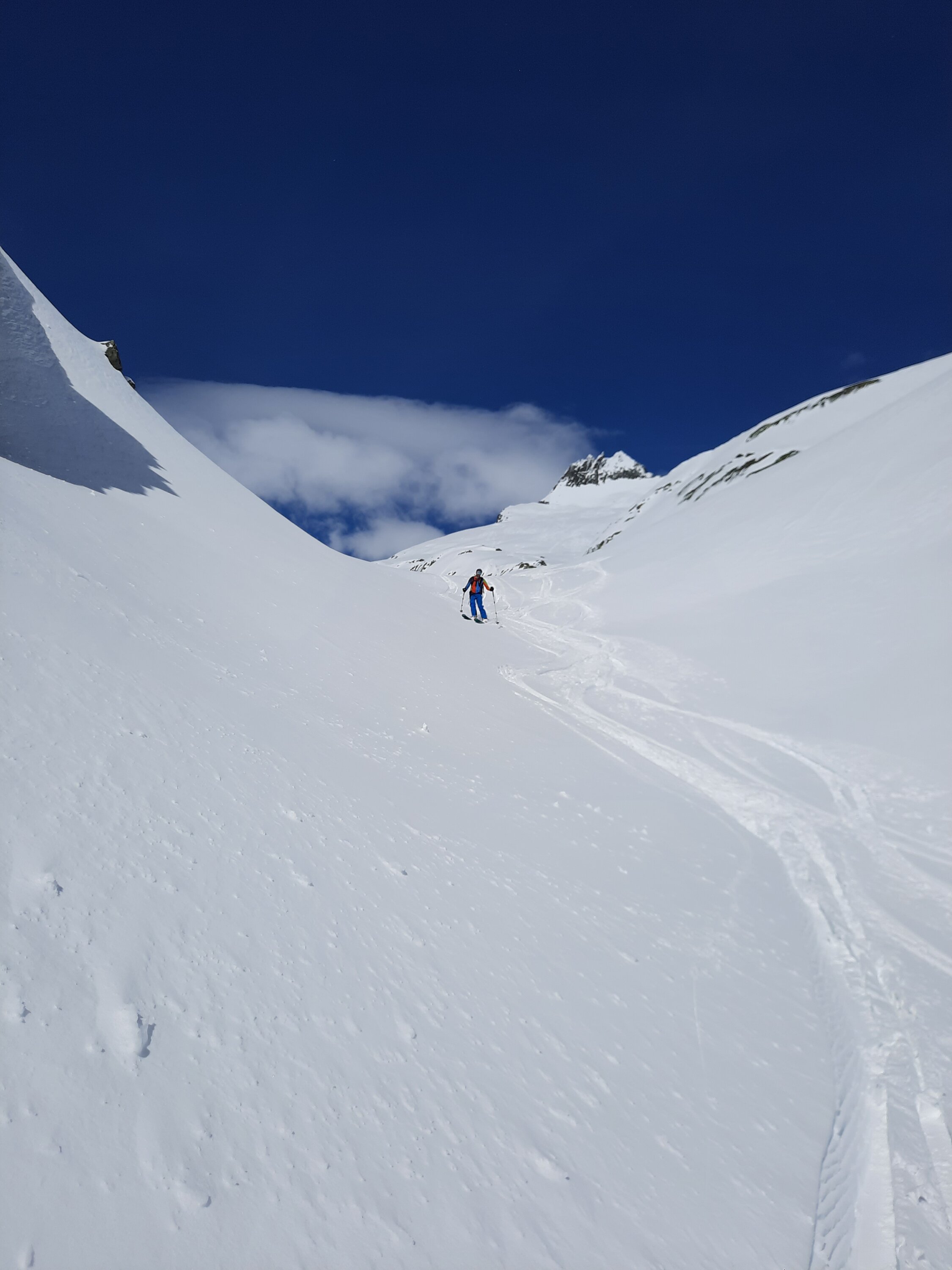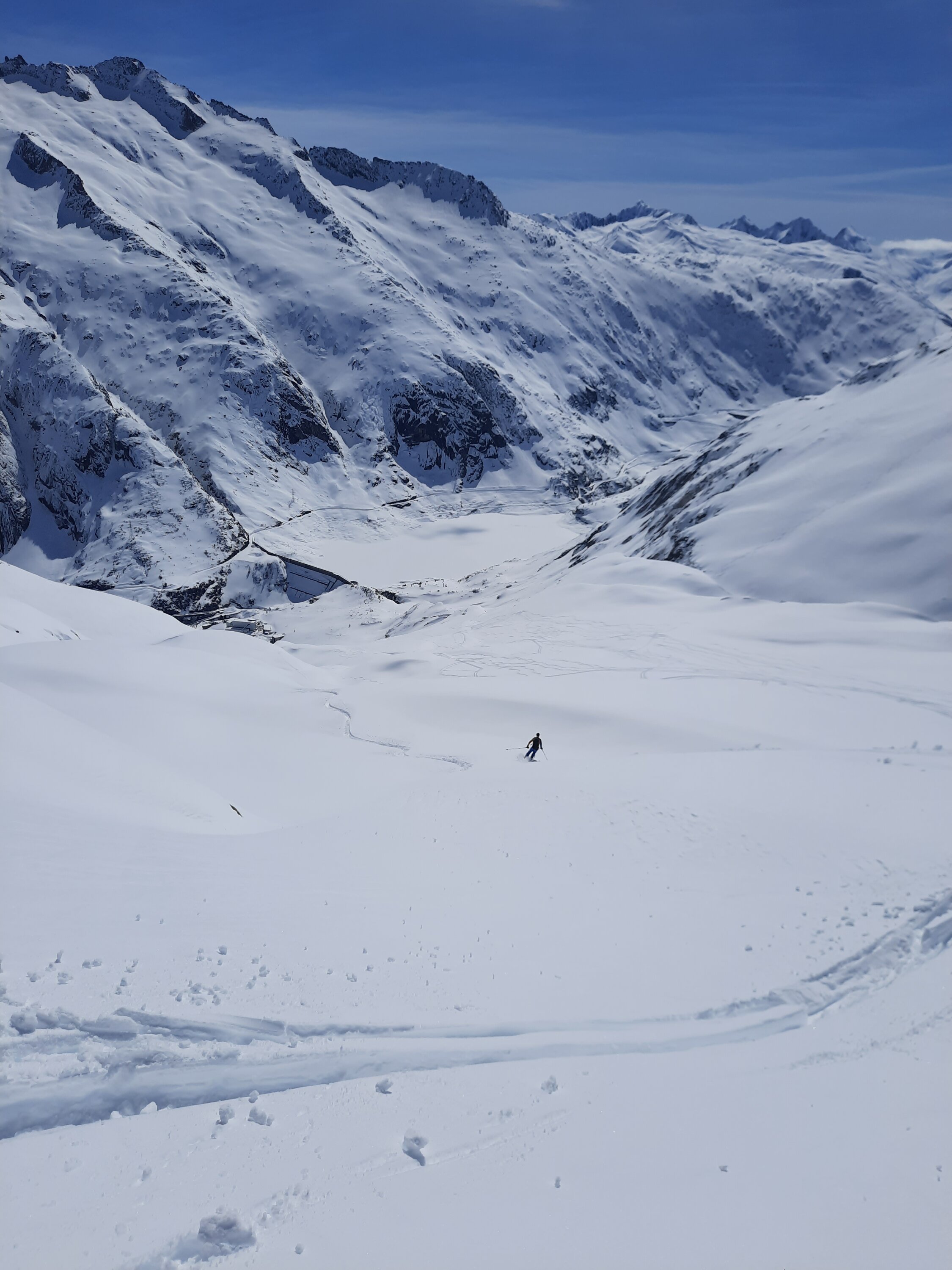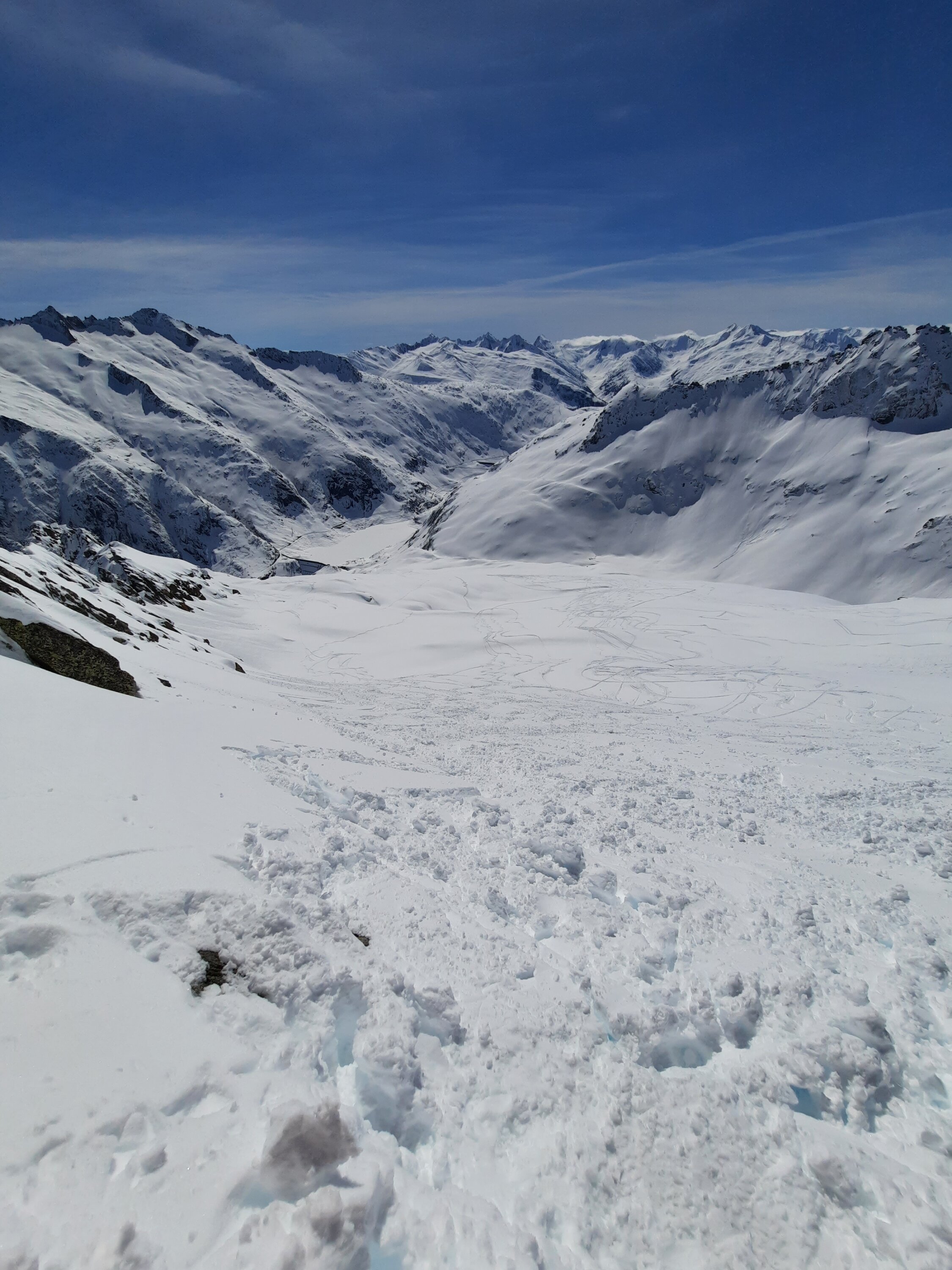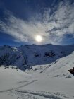 start chuenzentennlen nach tunnel(+200hm).rest dito route.gut 30 cm. neuschnee etwas feucht und mit windeinfluss.waren mit abfahrt kurz vor 10.30 gute stunde zu späht-sehr warm und windstill,desshalb schnee schon recht feucht aber noch recht gut fahrbar.sah bei den frühaufstehern noch besser aus...(und es waren einige..).