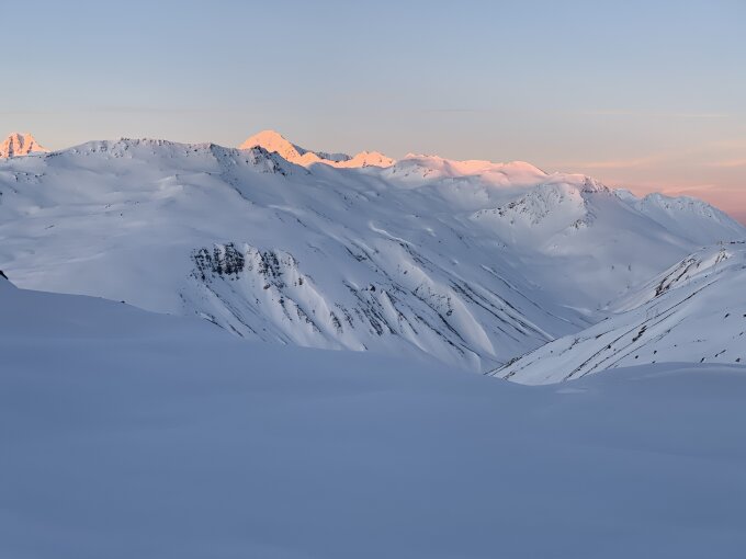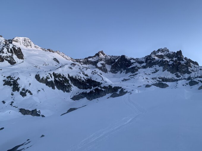 Früher Start um 4:00 bei 6 Grad. Schwacher Föhn. Gute, teils glasige Spur Richtung Tiefengletscher. Ostseitig teils grosse Schneebrettabgänge (Bild). Süd-/westseitig einige Nasschneeabgänge vom Samstag. Skidepot bei 2960 m am Fuss eines Nasschneeabgangs vermutlich vom Vortag. SW-Flanke gut durchgefroren, stabile Verhältnisse. Im Lawinenschnee z.T. noch knietief gespurt, ab 3150 m dann perfekter Trittschnee.