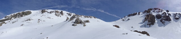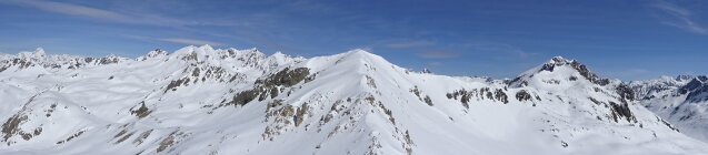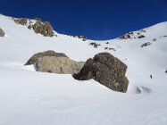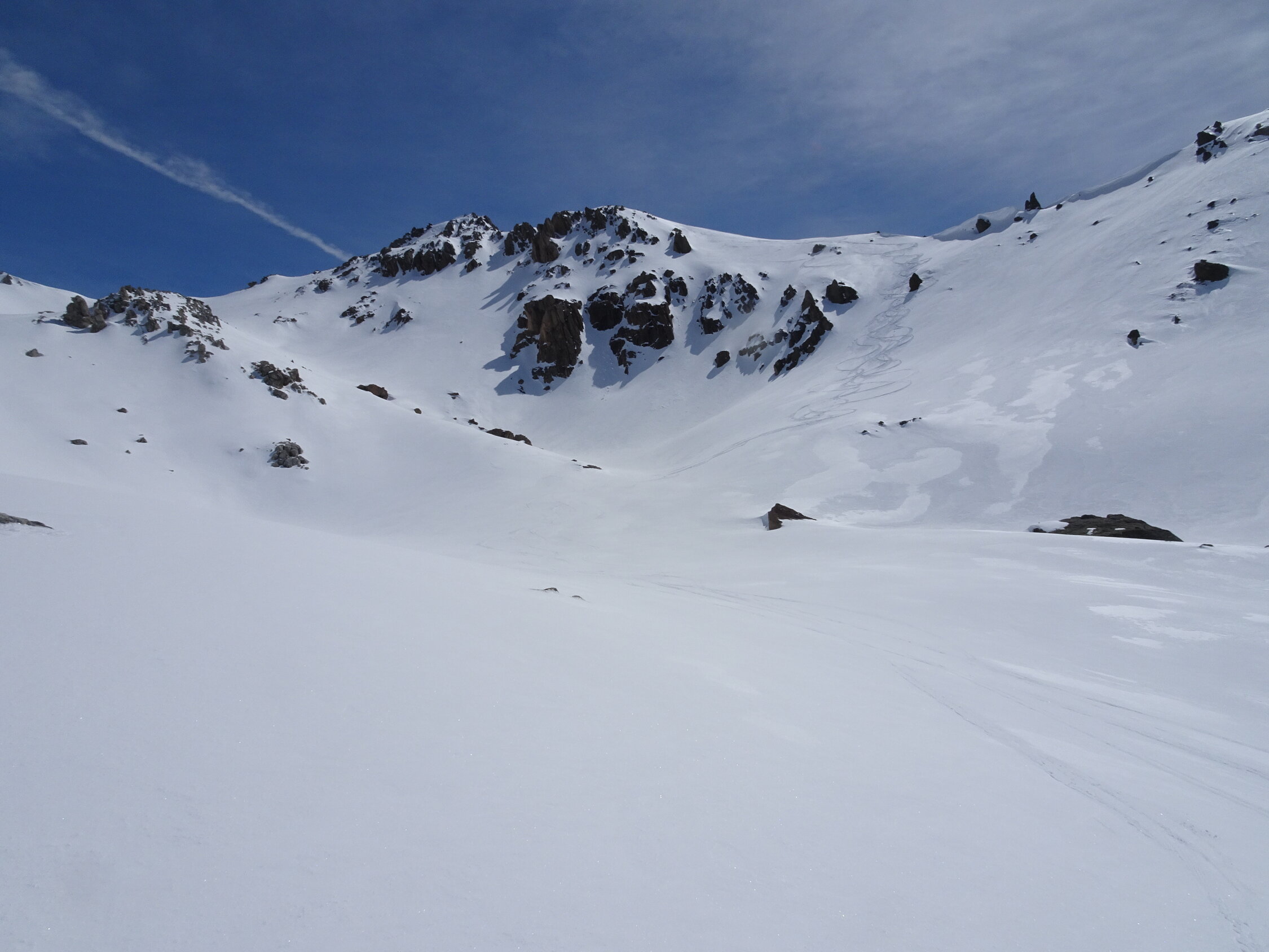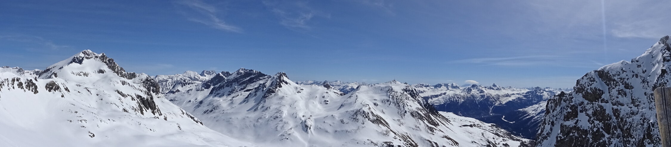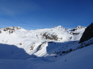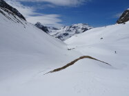 Abfahrt nordseitig vom Chamuotsch gegen das Corn da Suvretta rüber. Oberster Hang noch schön im Pulver. Dann tragender Schnee mit feiner Sulzschicht bis zum Parkplatz zurück.
