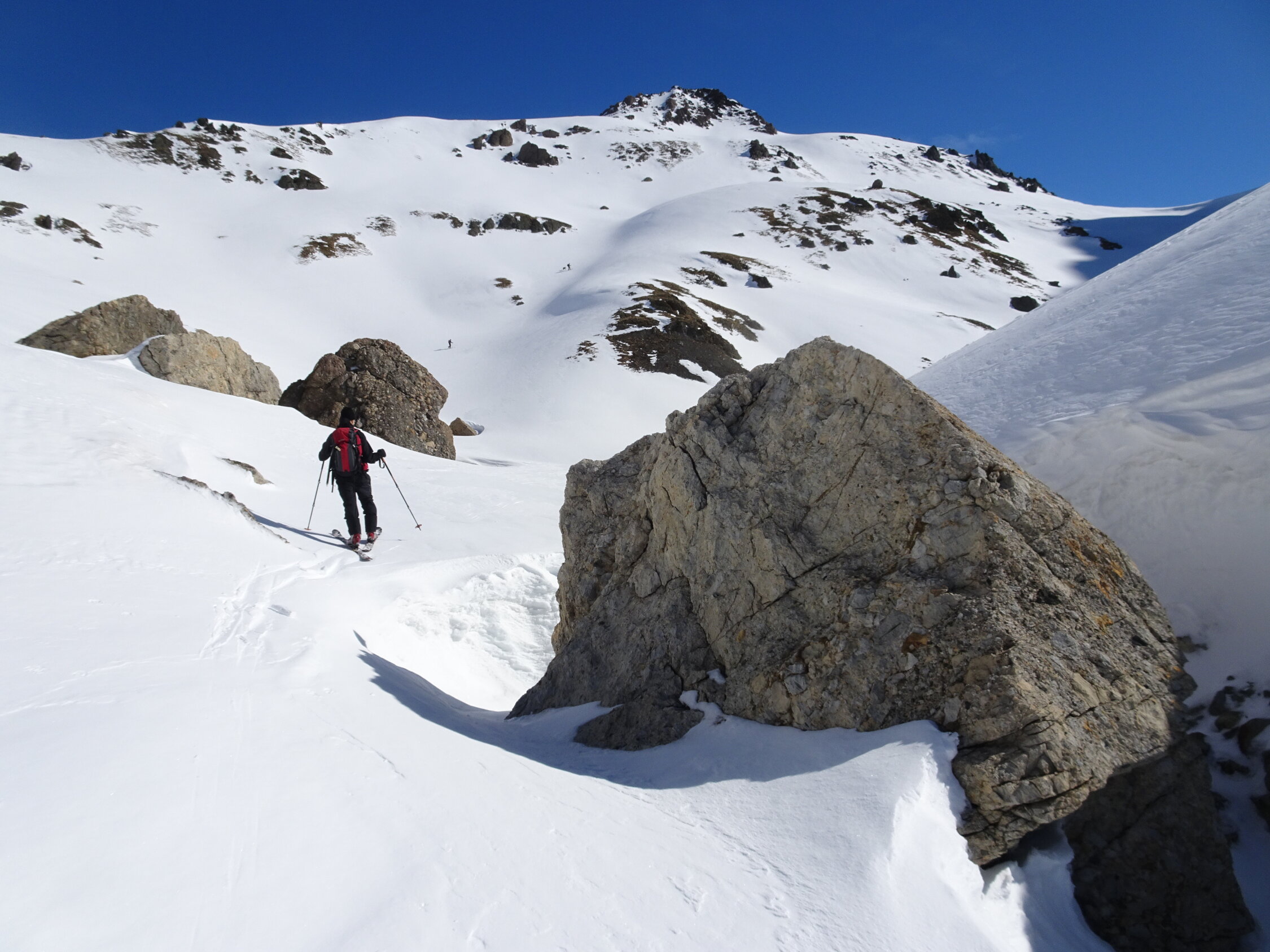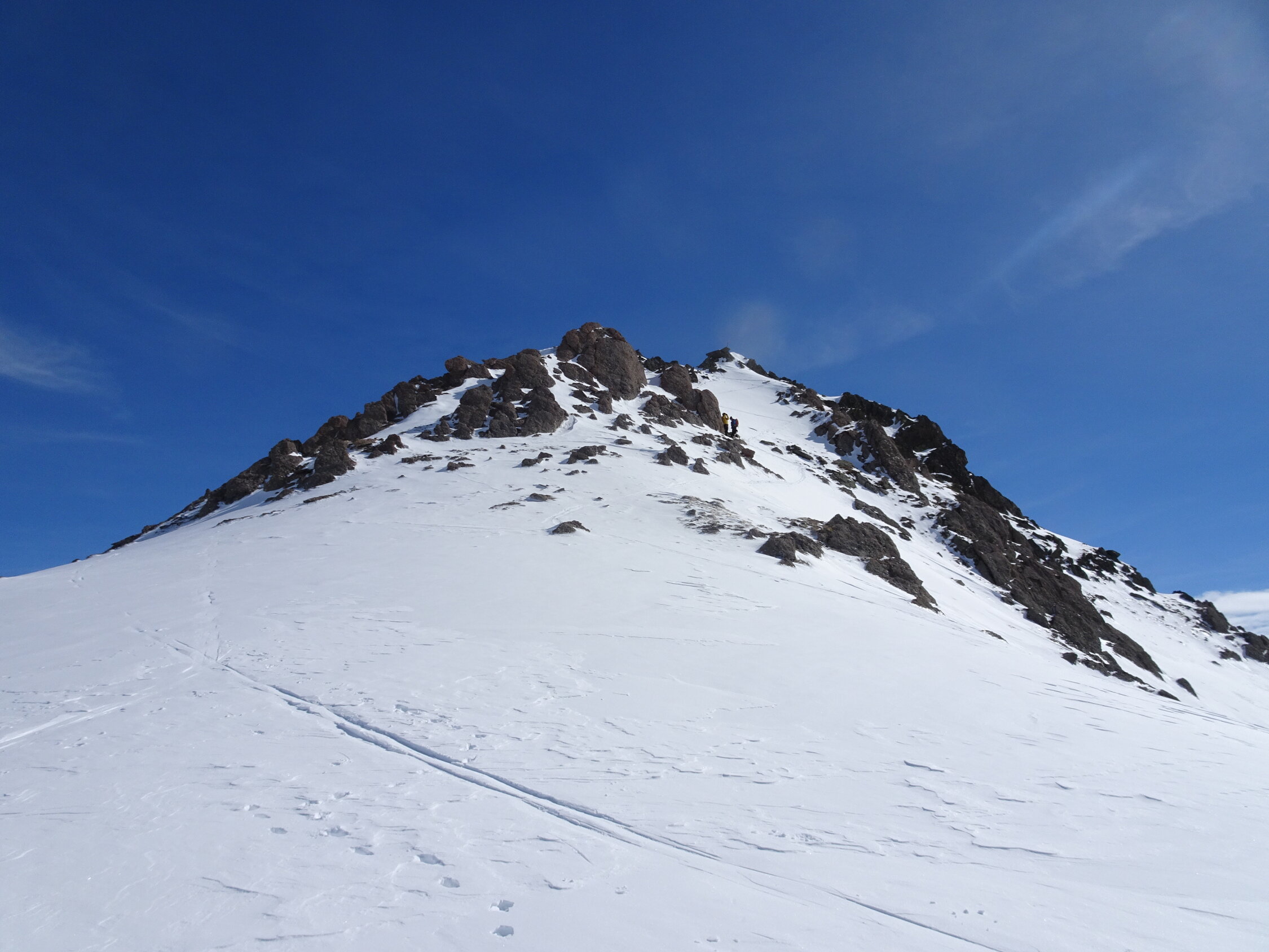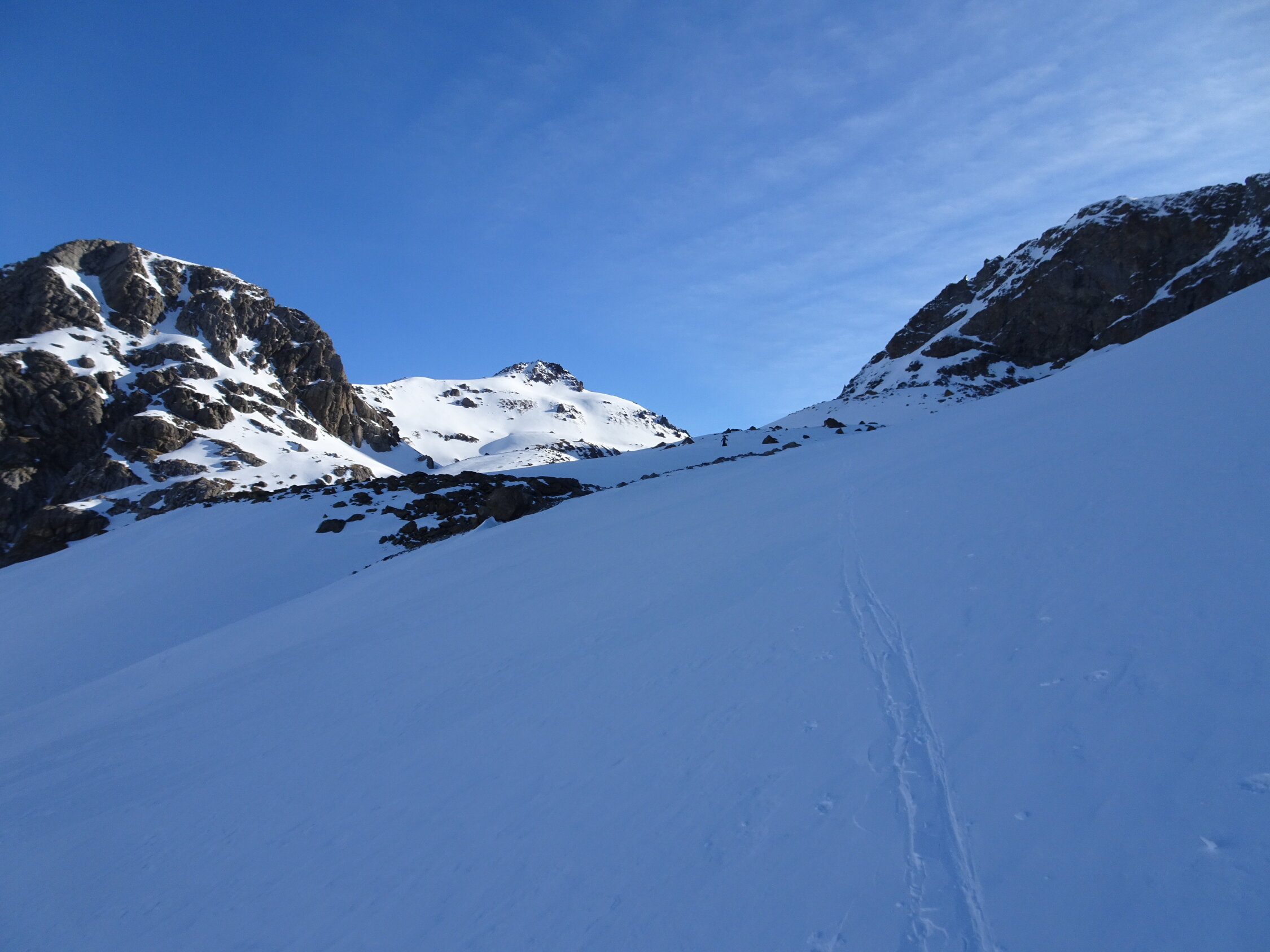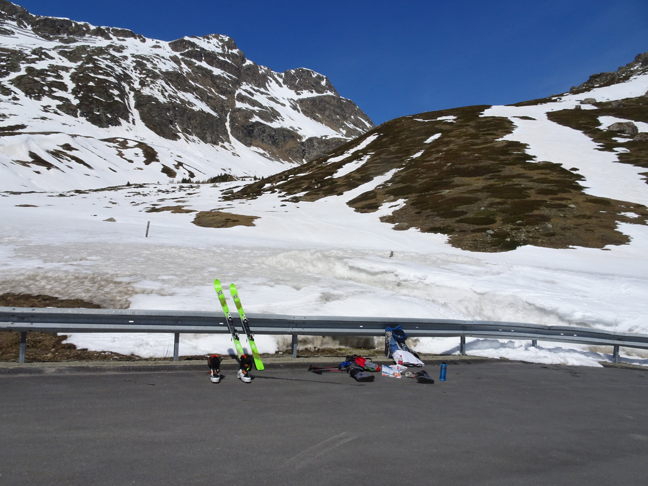 Noch zwischen Bivio und dem Ospiz waren die Südhänge am Julier bereits schneefrei. Ab dem Val d'Agnel war dann aber doch noch der Schnee da. In den Nordhängen (südlich der Strasse) war noch Hochwinter. Die Valletta dal Güglia hat noch Schnee bis zum Parkplatz. Phasenweise war der Aufstieg ohne Harscheisen etwas rutschig, aber es ging. Bis die Sonne eintraf, waren wir am Gipfelhang (Gemütlicher Abmarsch ab ca. 6:30).