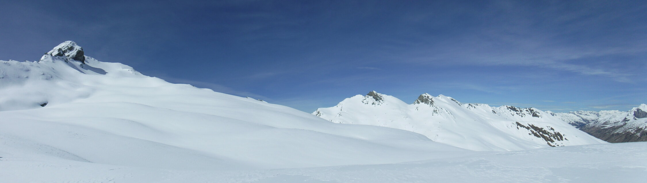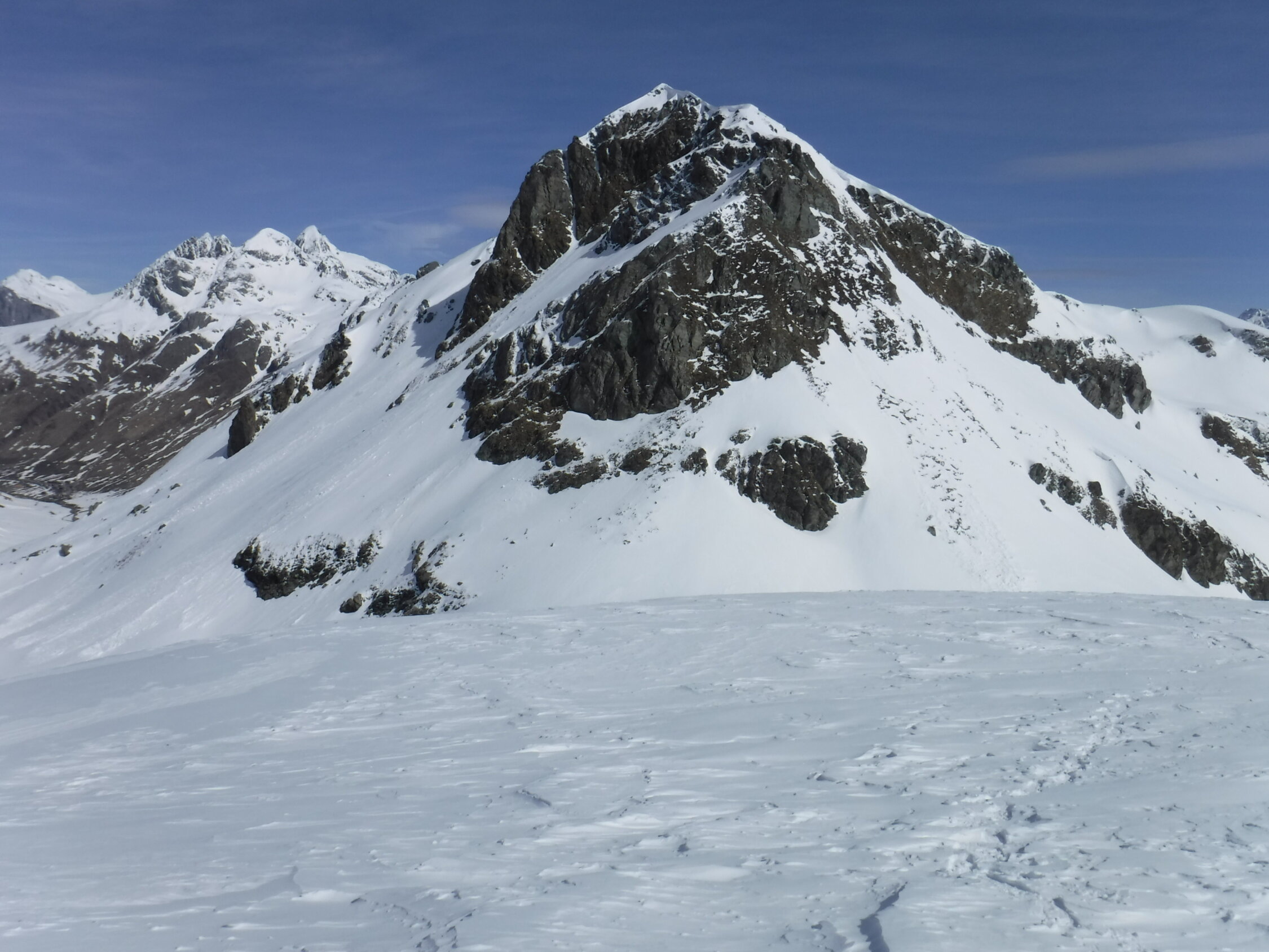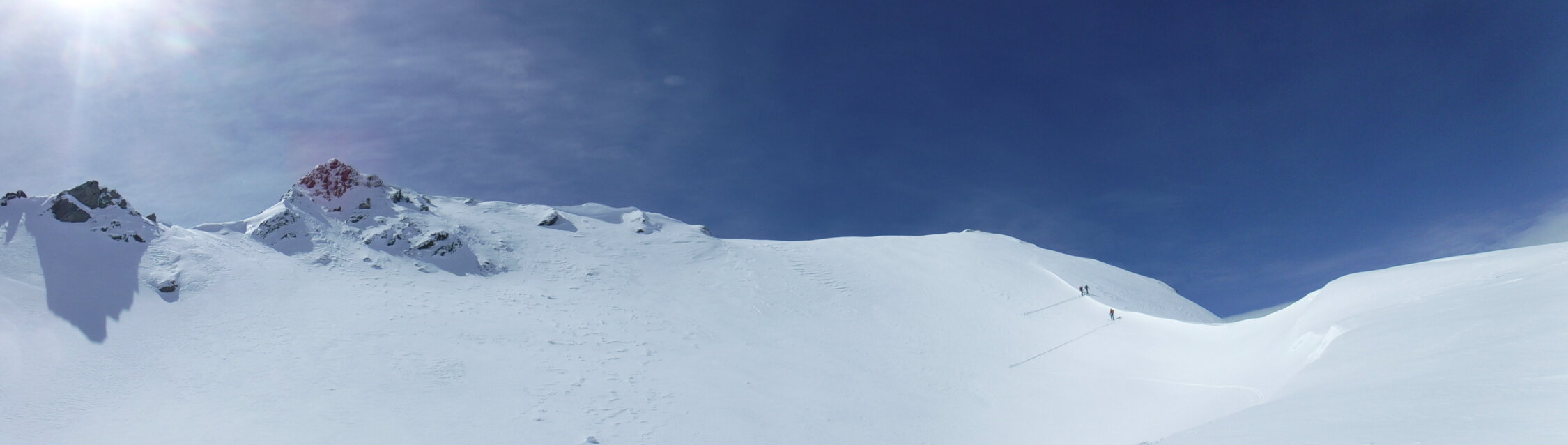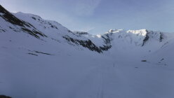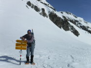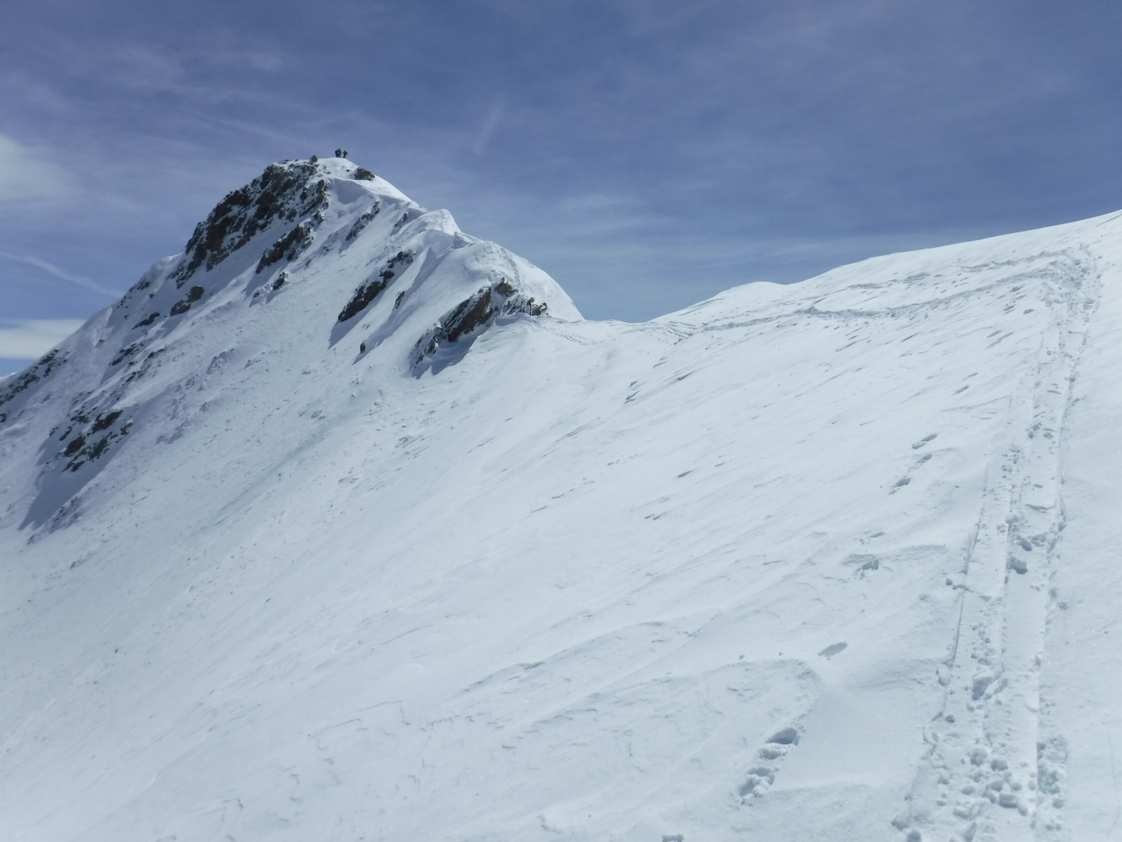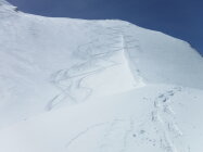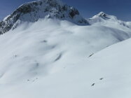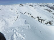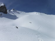Über den Bergrücken P 2780 und P 2847 war eine alte Skispur teilweise noch sichtbar. Rückweg dann allerdings über den Sommerweg (Westtraverse) unterhalb deren Wandschrägen, da so sämtlicher Gleitschnee inzwischen unten war.