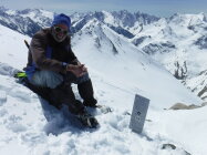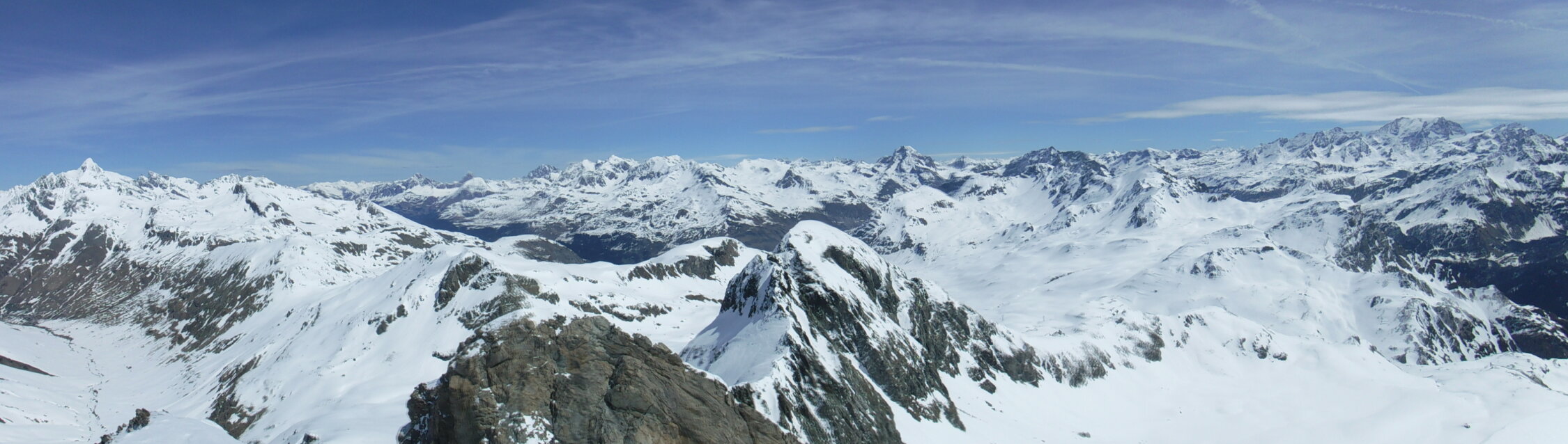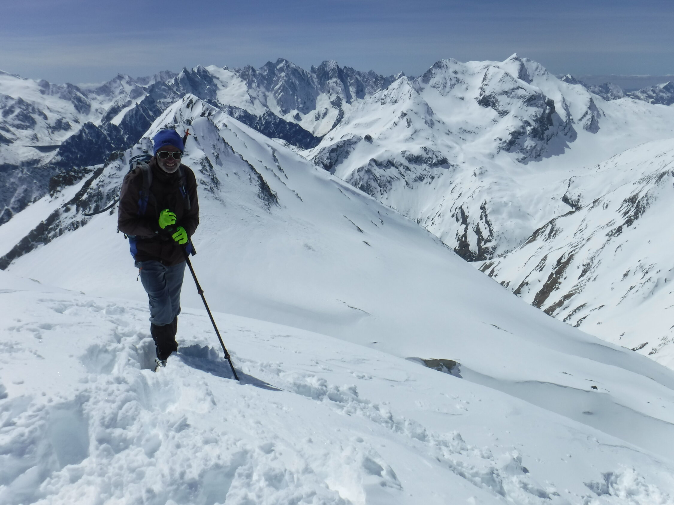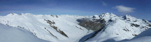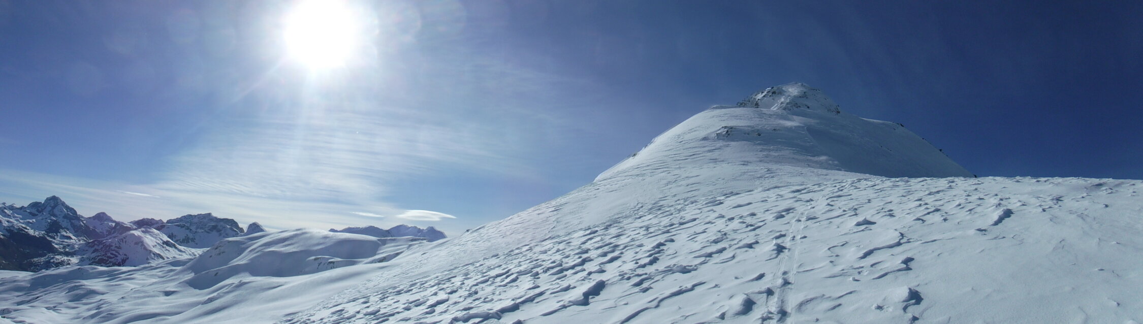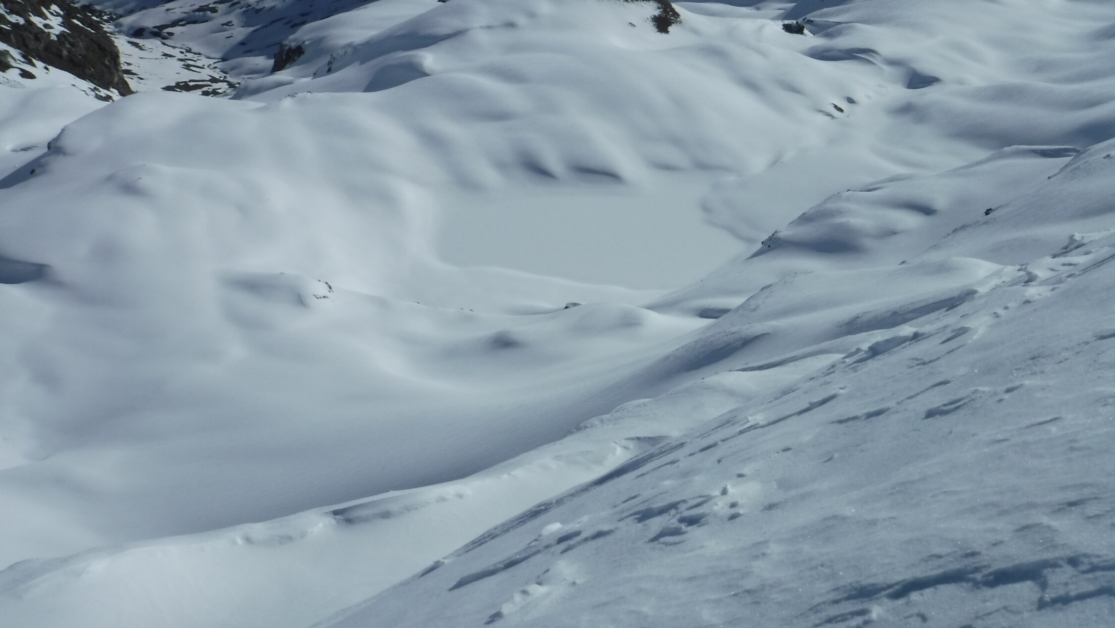 Über den Bergrücken P 2780 und P 2847 war eine alte Skispur teilweise noch sichtbar. Rückweg dann allerdings über den Sommerweg (Westtraverse) unterhalb deren Wandschrägen, da so sämtlicher Gleitschnee inzwischen unten war.
