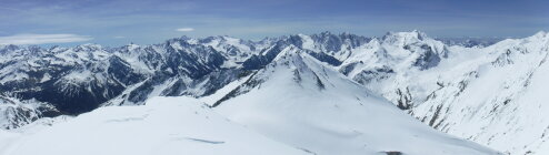 Panoramaberg mit Blicken über das Bergell im Süden. Im Norden überragt der Piz Platta die Gipfel.