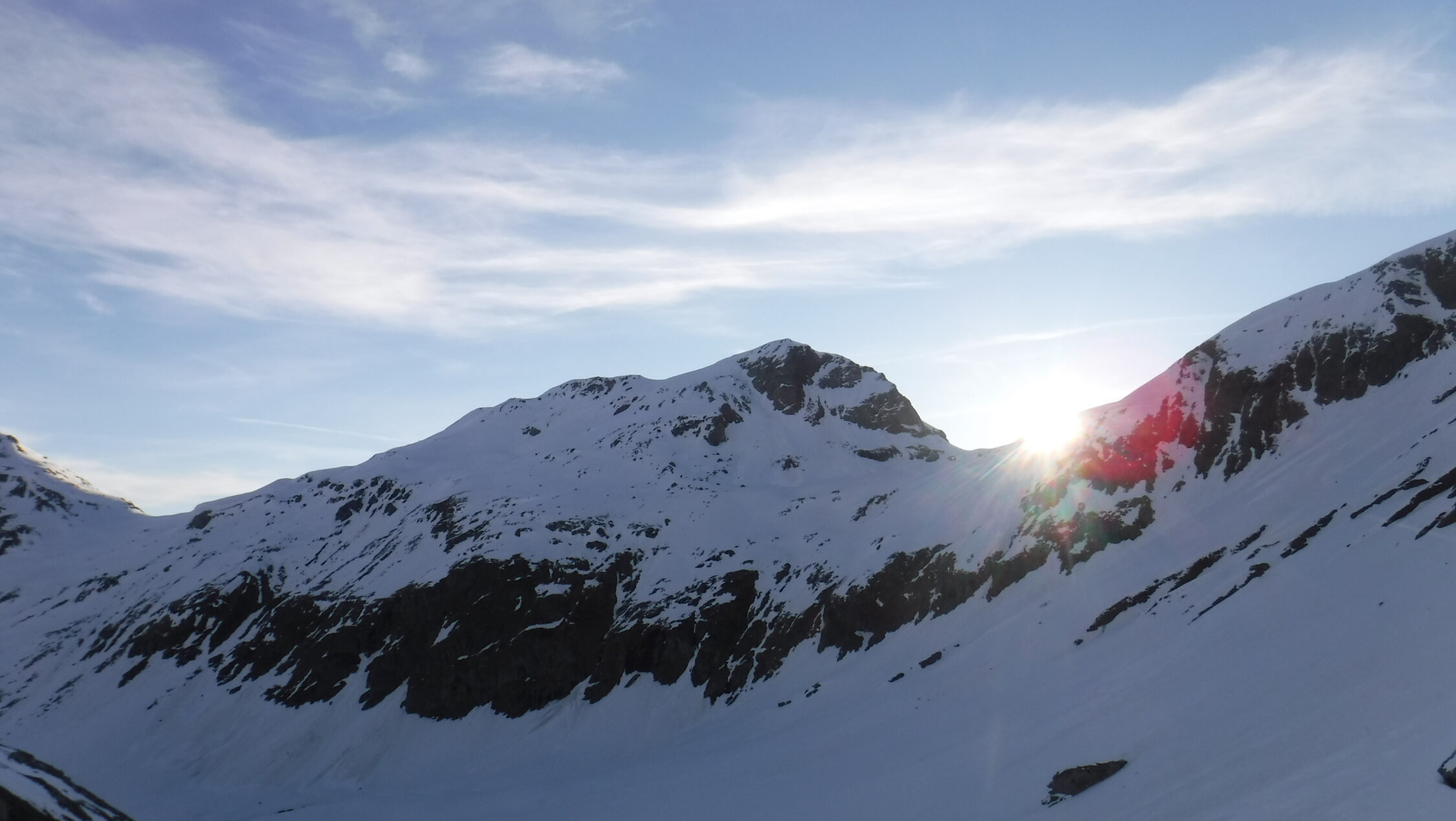 Tourenbeginn um 05:15 Uhr bei 1°C unter klarem Himmel jedoch mit böigem Südföhn. Auf dem Rückweg meiner Tour am Vortag über die Westtraverse von der Forcellina nach Juf konnte ich mir komplett die Szenerie zwischen Juferjoch und Piotjoch im Südwesten anschauen. Die Spuren der Skitourengänger zum Juferjoch, (welche über den Verbindungsgrat liefen), sowie 3 Abfahrtspuren über den Nordhang des P 3037 waren sichtbar. So hatte ich guten Überblick. Zum Juferjoch lief ich über den Moränenrücken hinauf, auf dem stellenweise Bruchharst herrschte, der jedoch nicht tief ging.