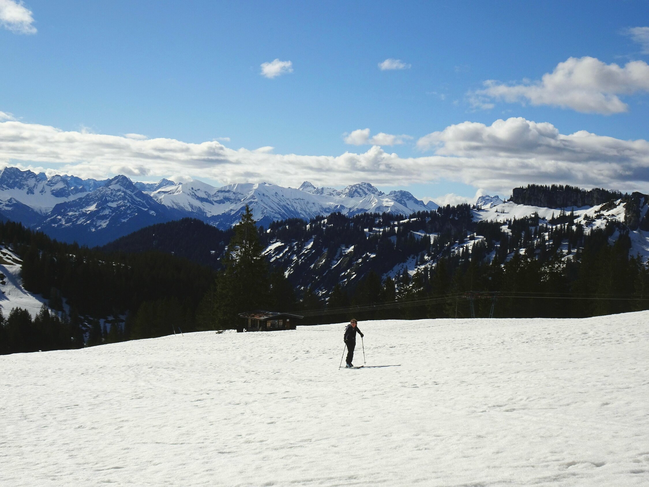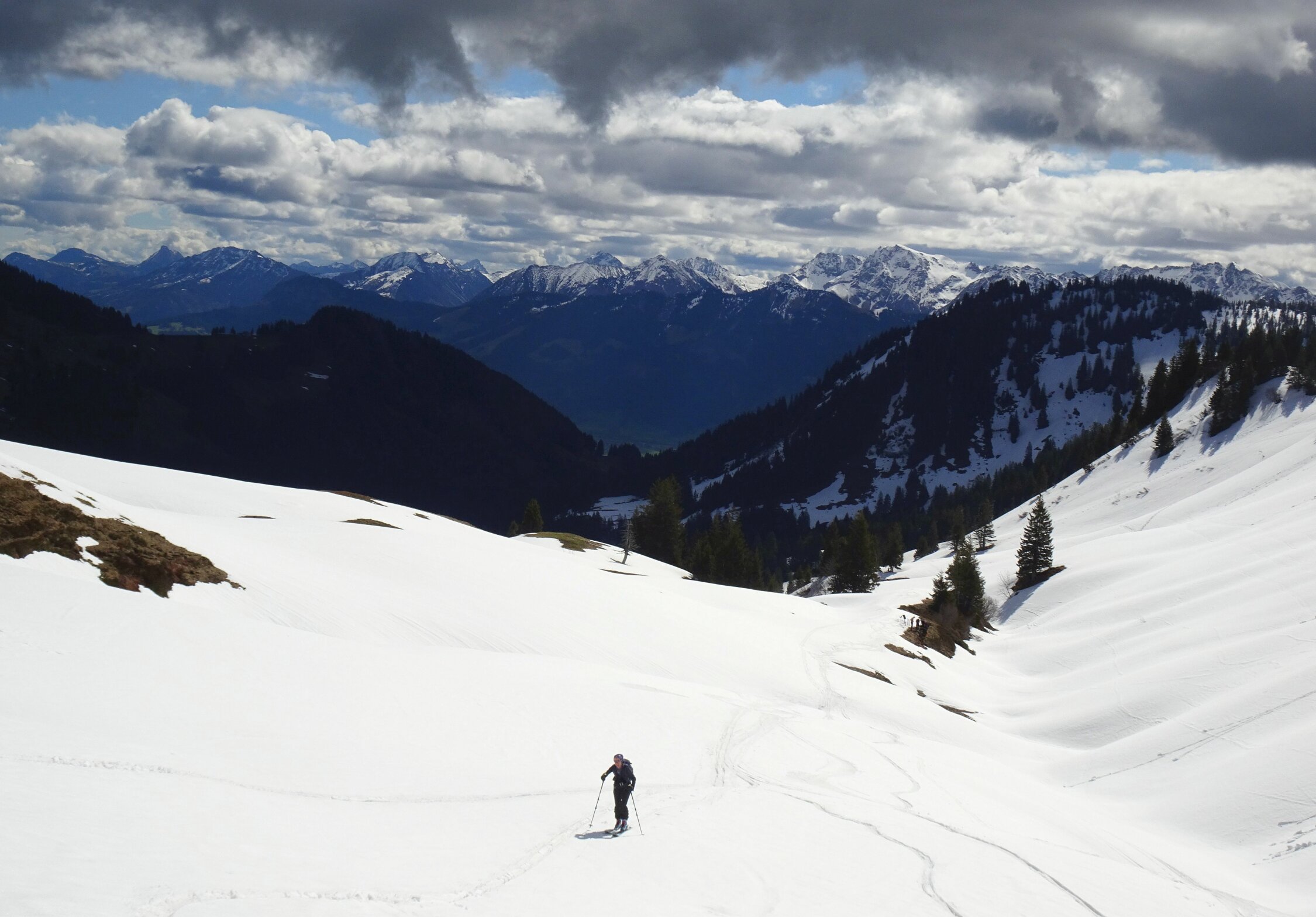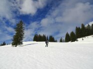 Abfahrt sowohl in´s Bolgental als auch nach Grasgehren sommerschneemässig in weichem Schnee auf fester Grundlage (ca. 11.00 h wieder unten). Wetter warm und sonnig mit Quellwolken, oben etwas windig. Früh nur wenige Skitourengeher, später kamen noch ein paar Wanderer dazu.