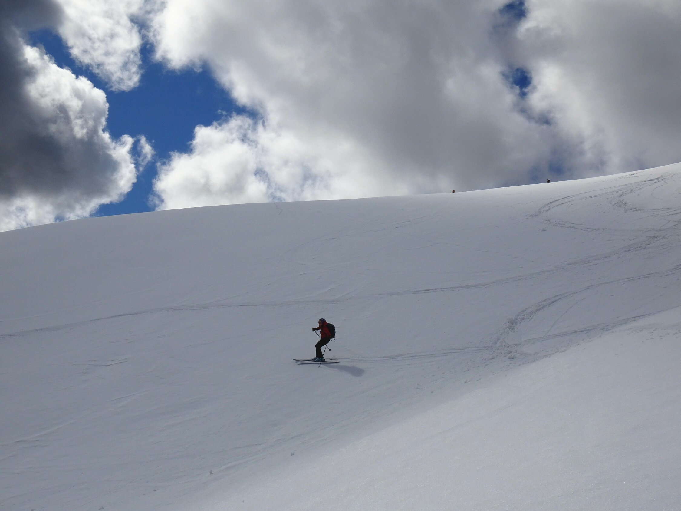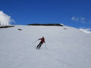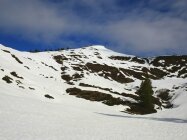Aufstieg über Ostflanke und Südrücken. Hier noch erstaunlich viel und kompakter Schnee. Richtung Ostgrat sah es schon etwas lückenhaft aus, dürfte aber mit kleinen Unterbrechungen auch noch gehen. Schneedecke morgens gefroren, ostseitig jedoch schon aufgefirnt und ohne Harscheisen begehbar.