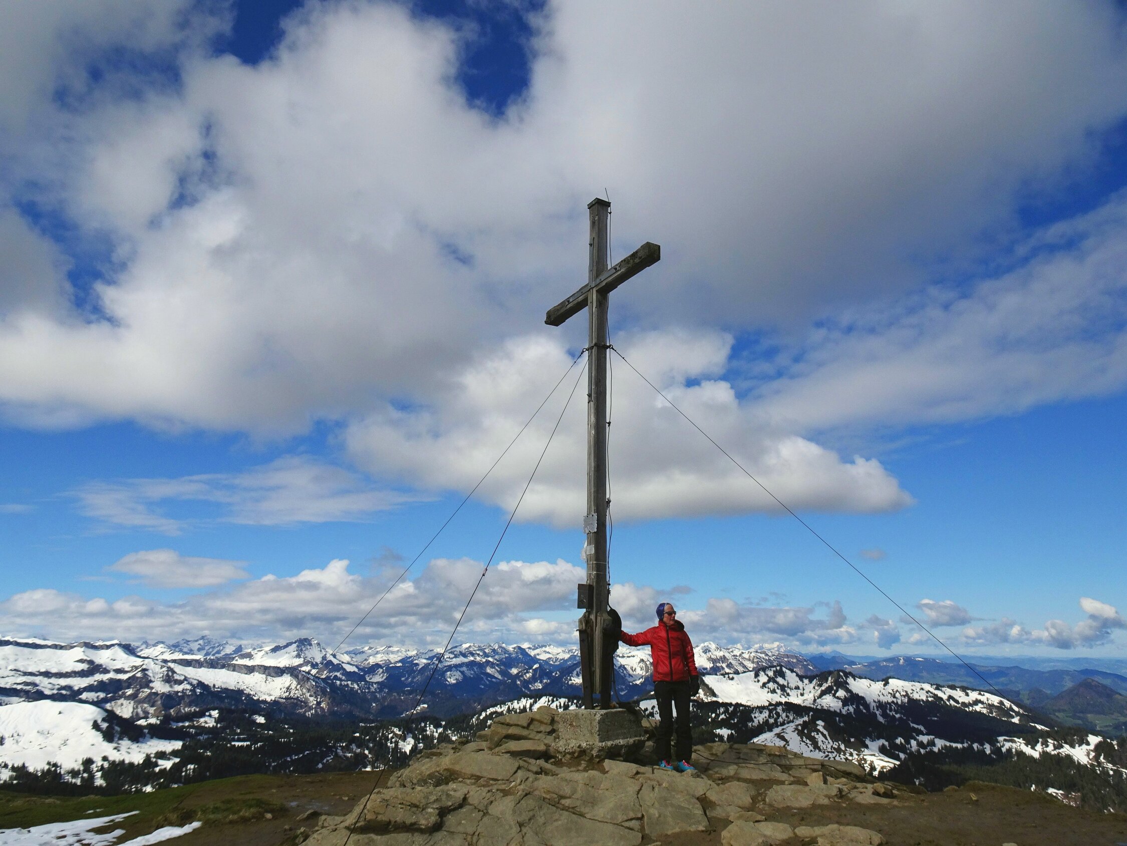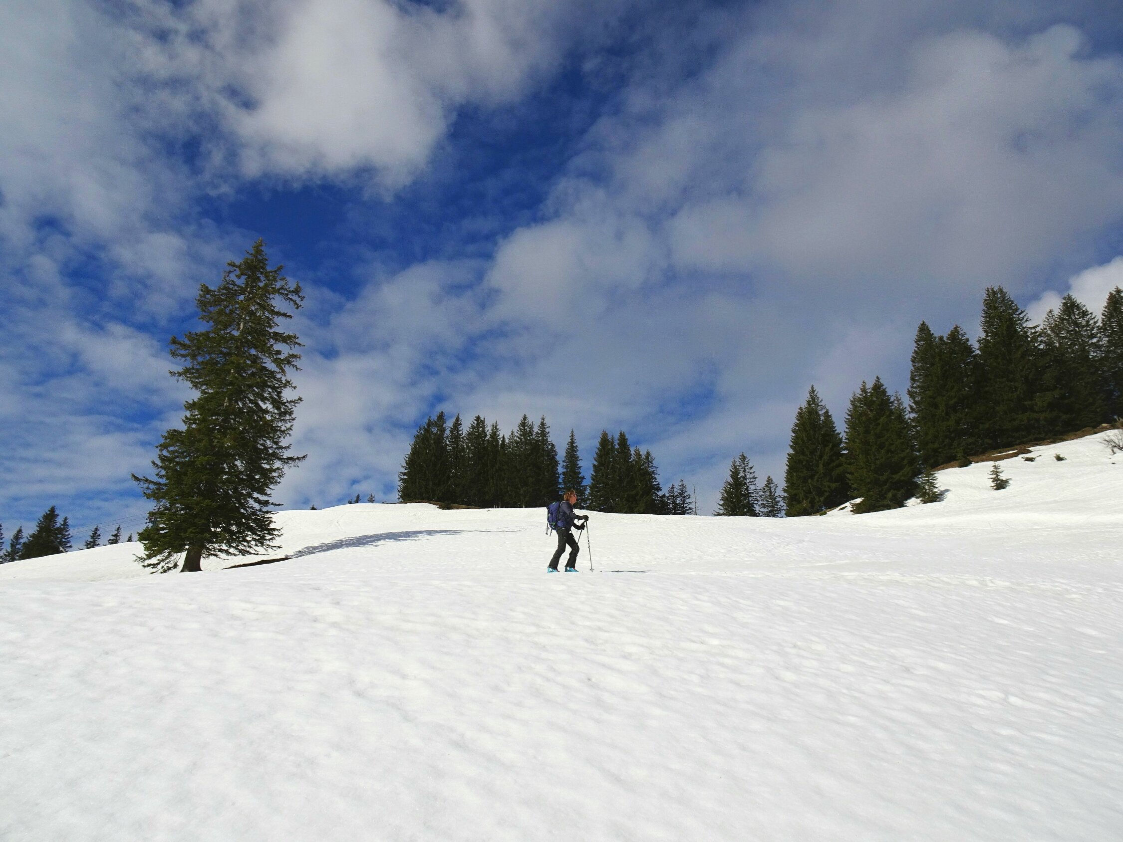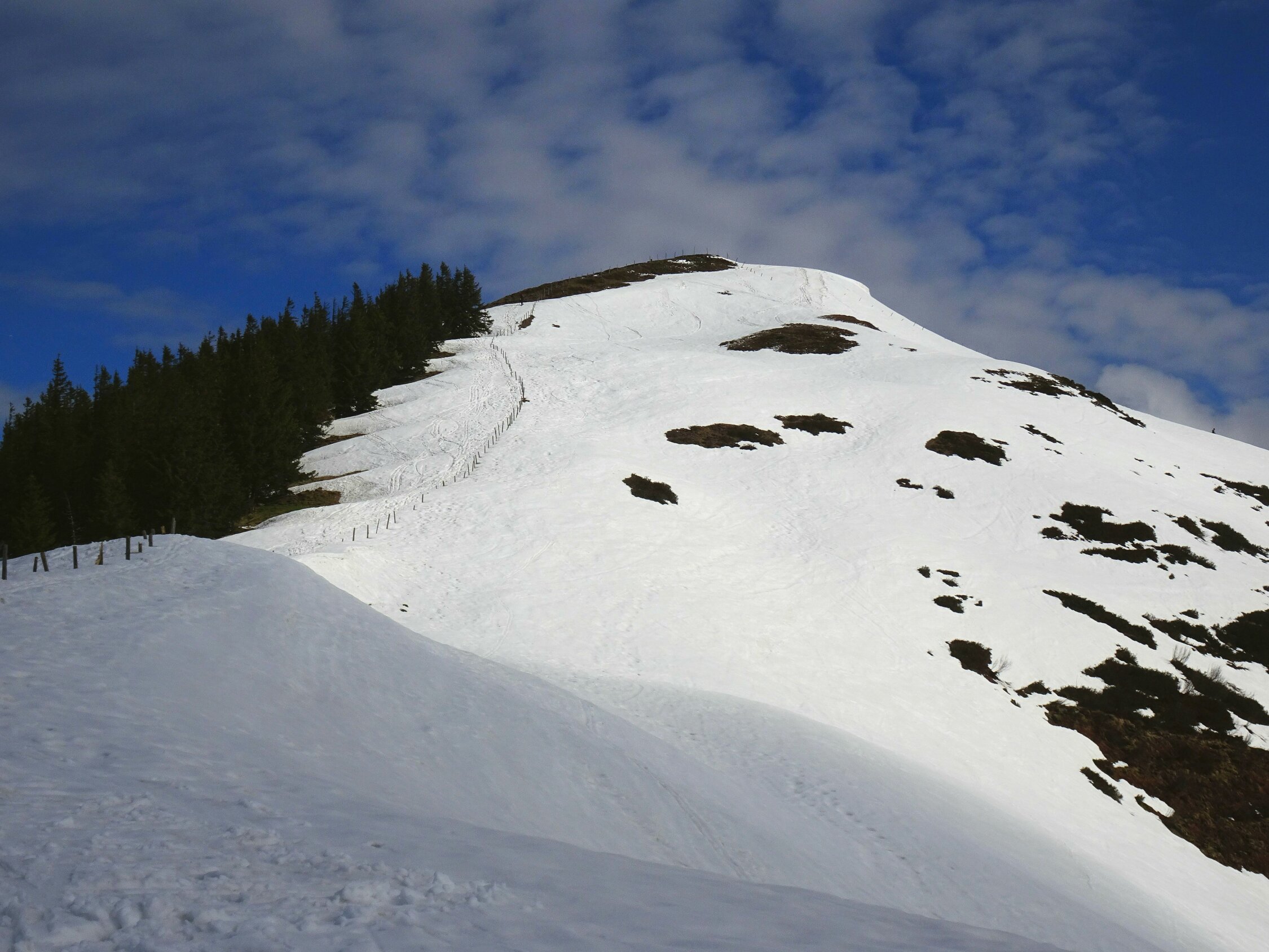 Für eine Spritztour im Schnee als Kontrast zu den Löwenzahnwiesen im Tal noch einige Tage geeignet. Der kompakte Schnee wird sich noch eine Weile halten.