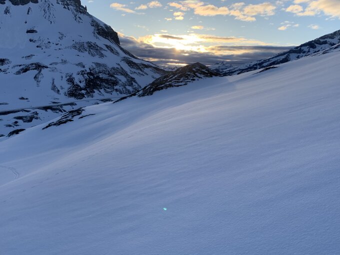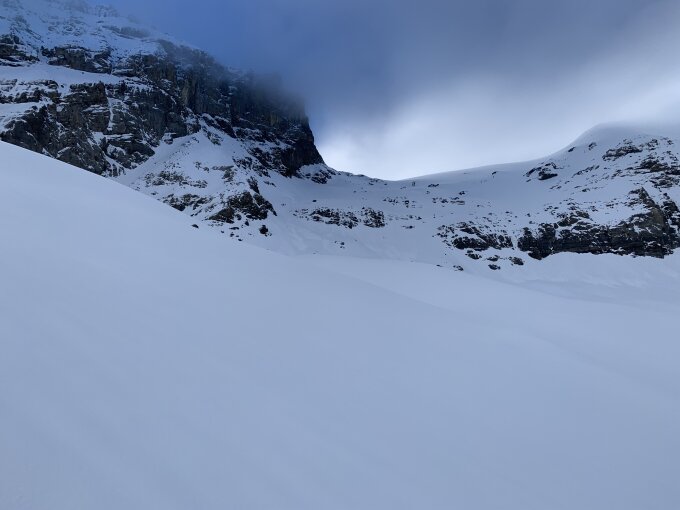 Wir hatten ursprünglich nit dem Chammliberg via SW Flanke geplant. Die Erkenntnis, dass die etwa 50° steile Flanke diesen Winter noch nicht abgegangen ist liess uns dann auf Schärhorn umplanen. Die etwa 100 Höhenmeter hoch reichende Flanke, welche nach unten von einem ca. 30 m senkrechten Felsriegel begrenzt ist, erschien uns schneerutsch/schneebretttechnisch zu heikel (Bild). Dafür konnten wir das Schärhorn ohne Stress geniessen und uns auf die sensationelle Abfahrt im Glitzerpow freuen.