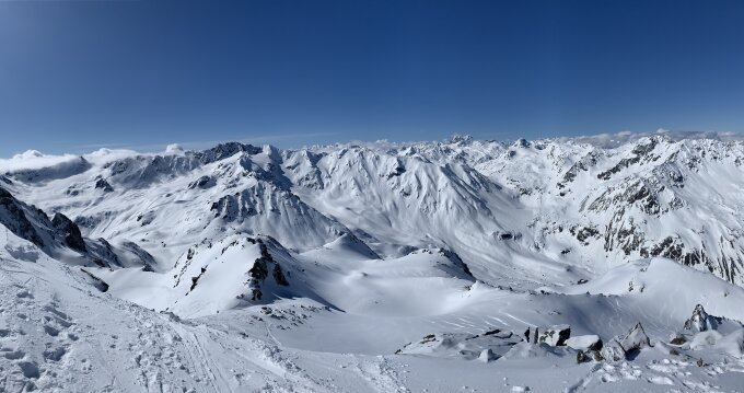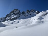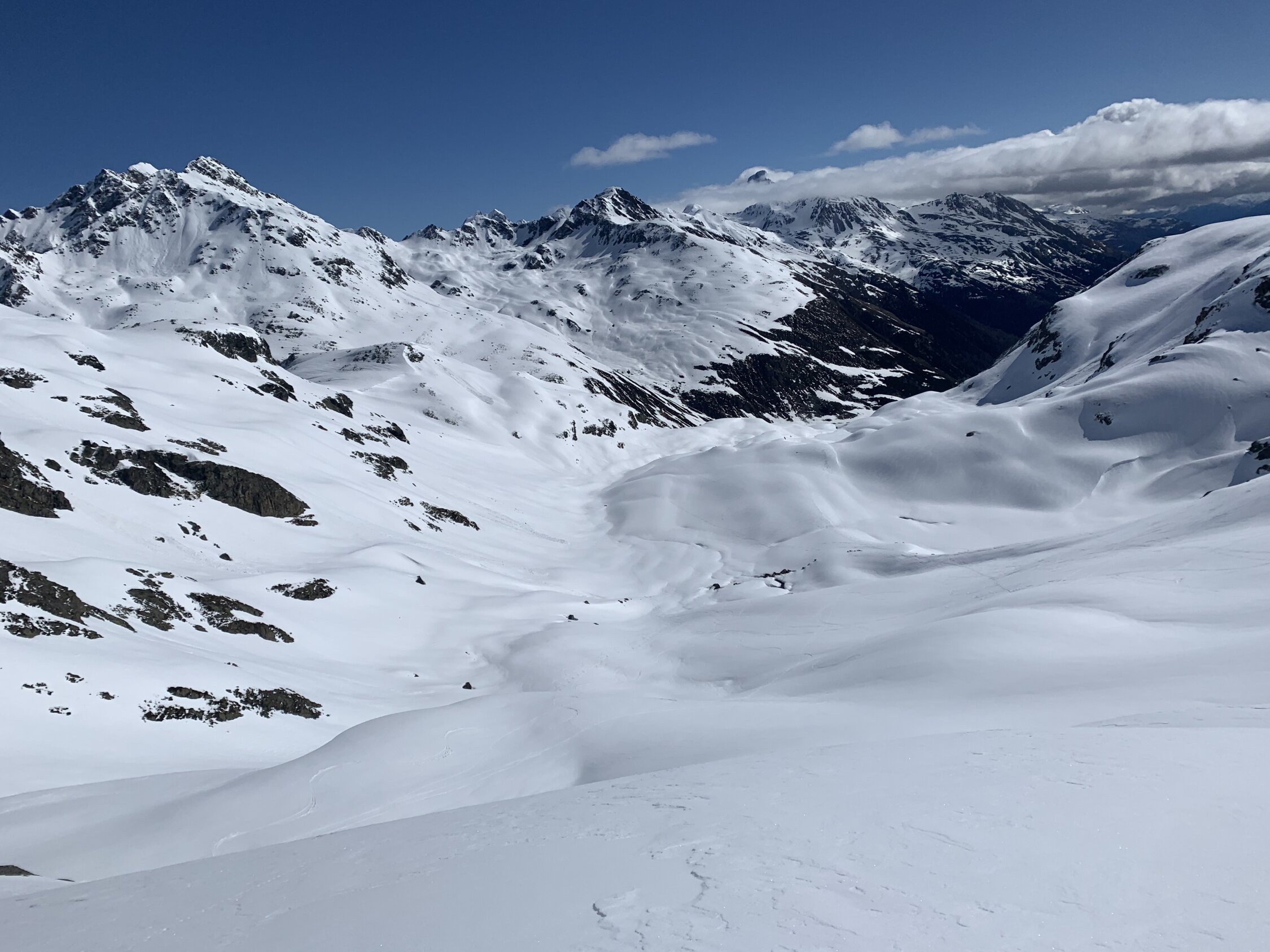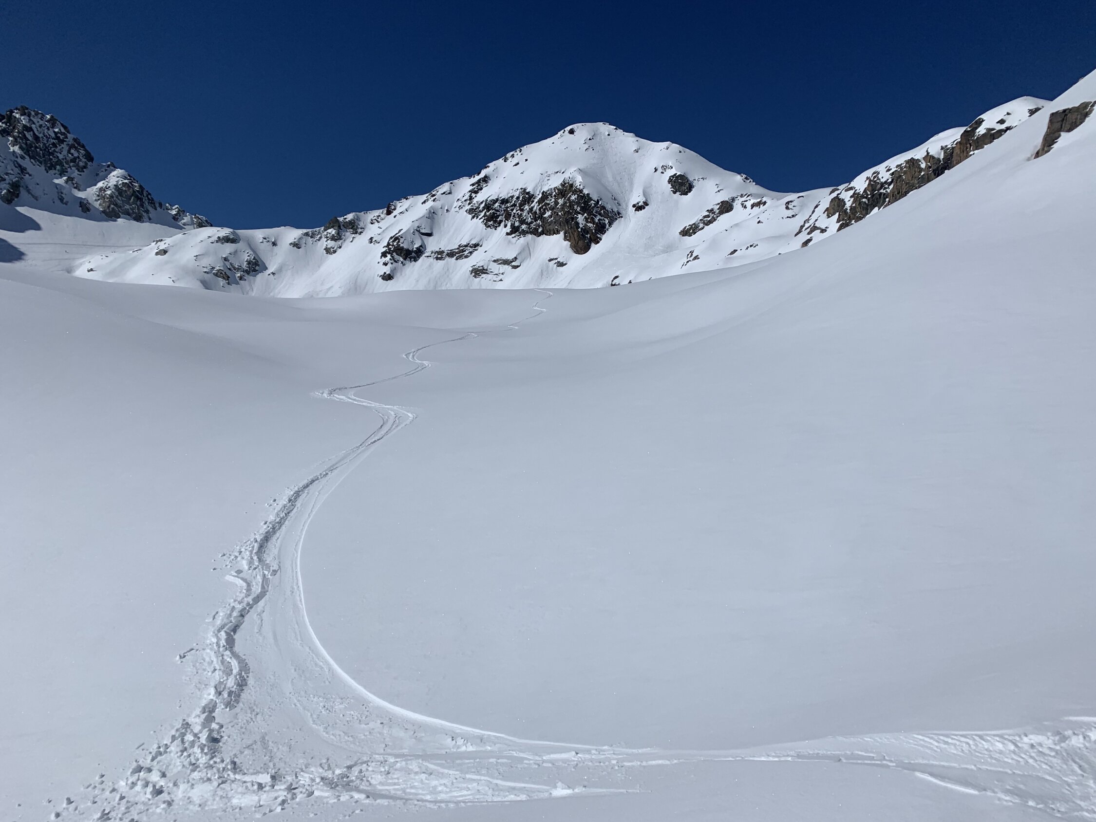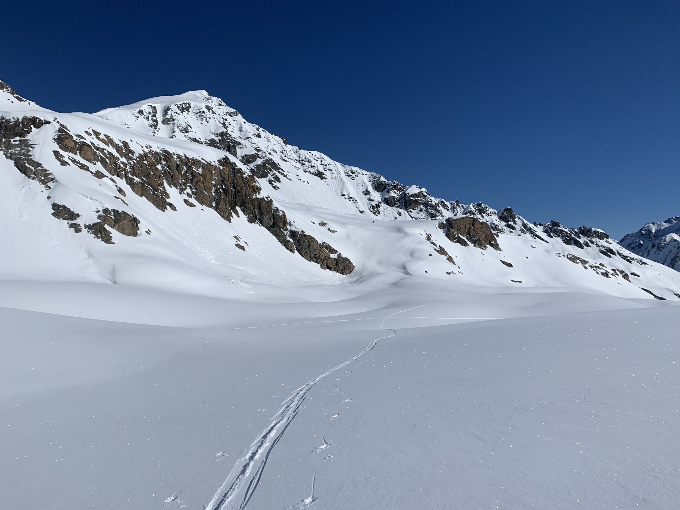 Start der Tour ca. 6.00 Uhr auf der Engadiner Seite mit wenigen frei geräumten Parkplätze . Noch sehr viel Schnee im Gebiet . Tragender Deckel mit 2-8 cm Pulver . Schlüsselstelle bei Schwarzhornfurgga gut überdeckt im Aufstieg am Morgen ein wenig mehlig , Vermutlich später aufsultzte und weich wurde . Abfahrt bis P. 2739 ein Genuss Carving . Aufstieg zum Radüner Rothorn gute Spur . Abfahrt der Aufstiegsroute entlang , der SE Gipfelhang um 9.40 Uhr schon langsam weich wurde.