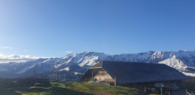 Immer noch überraschend gute Verhältnisse. Ski kann man ca. 15 min nach Alp Schlund anziehen und losfellen.