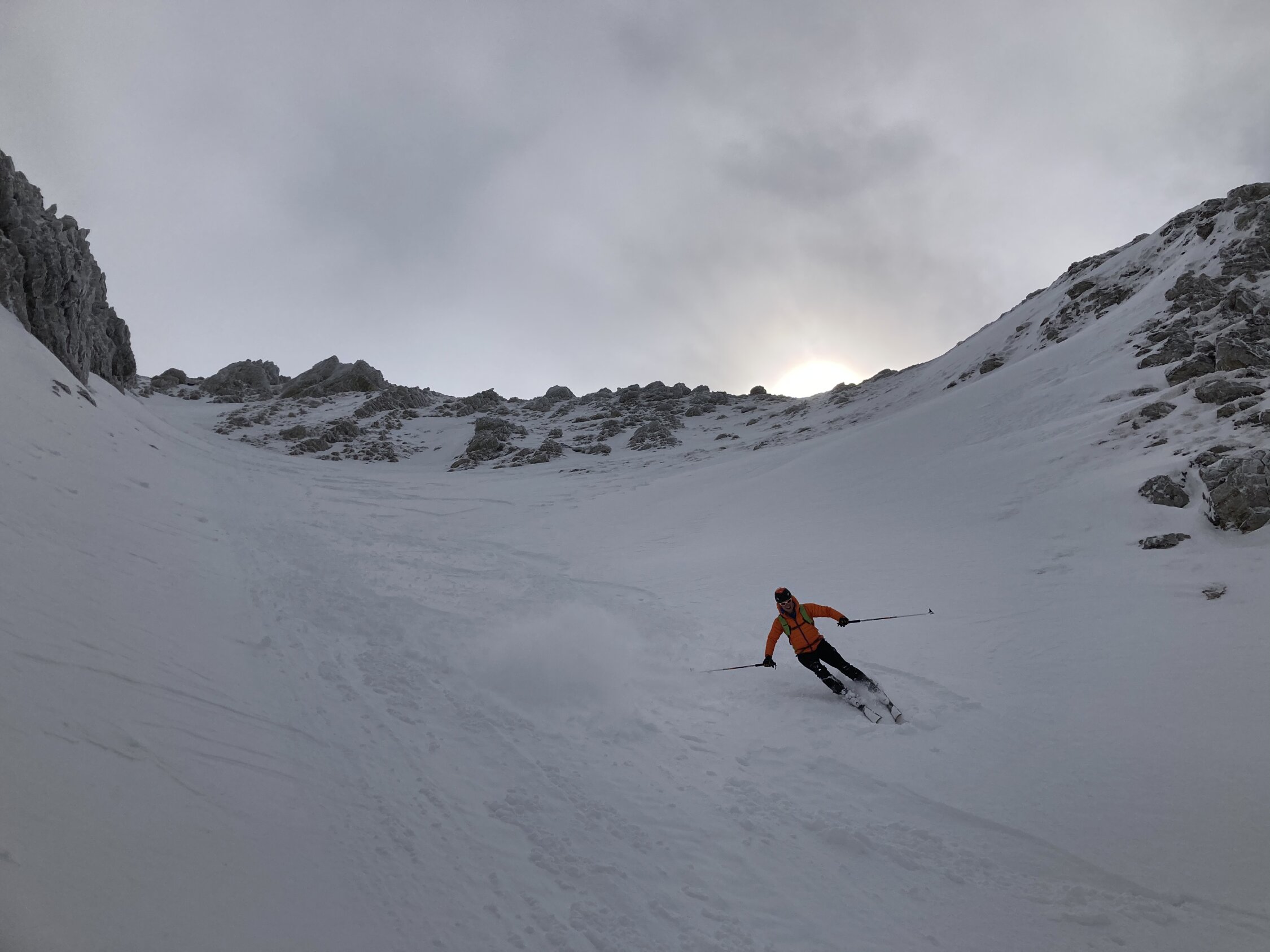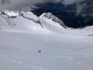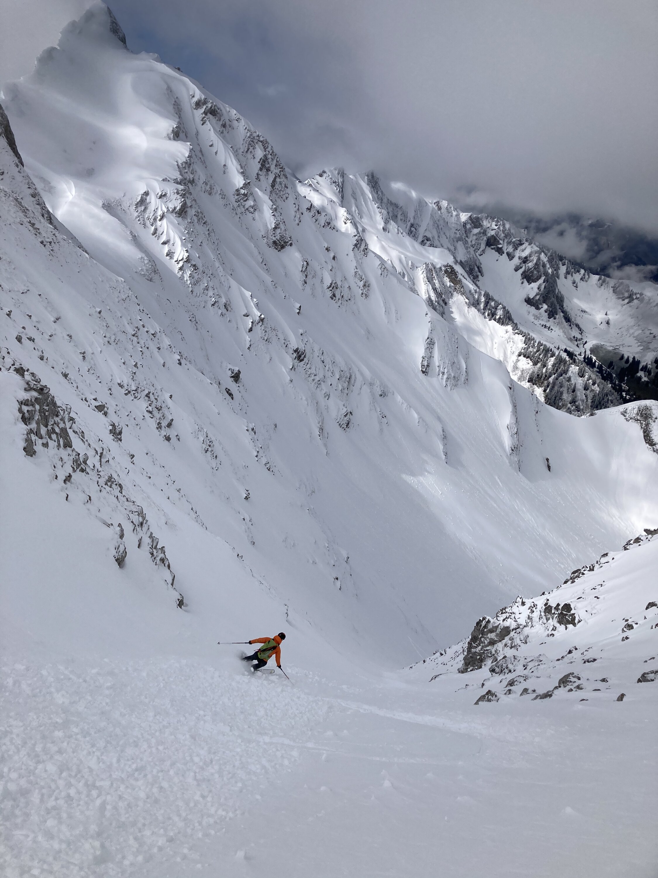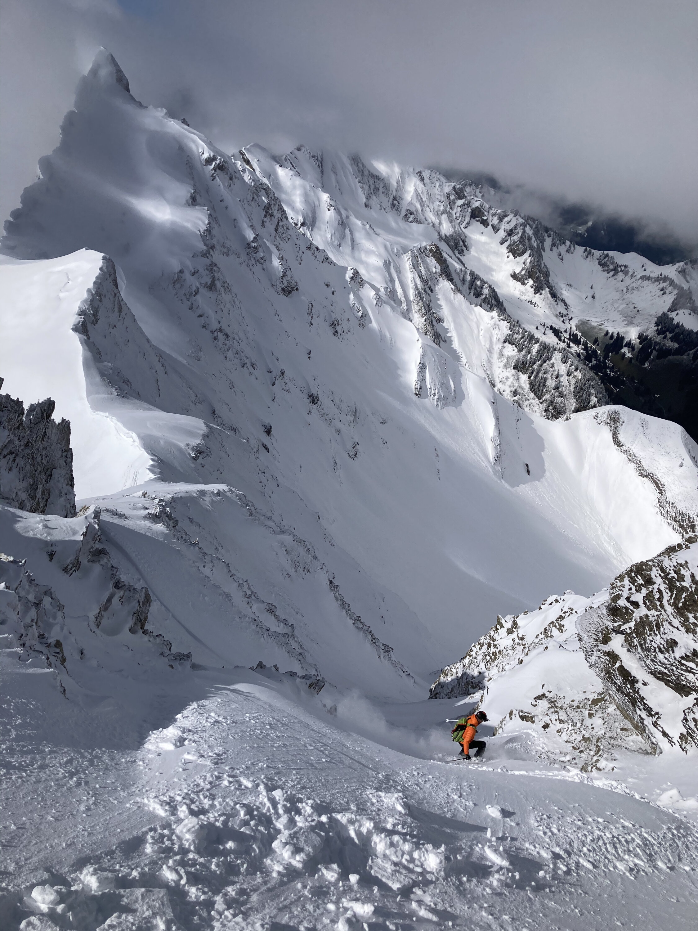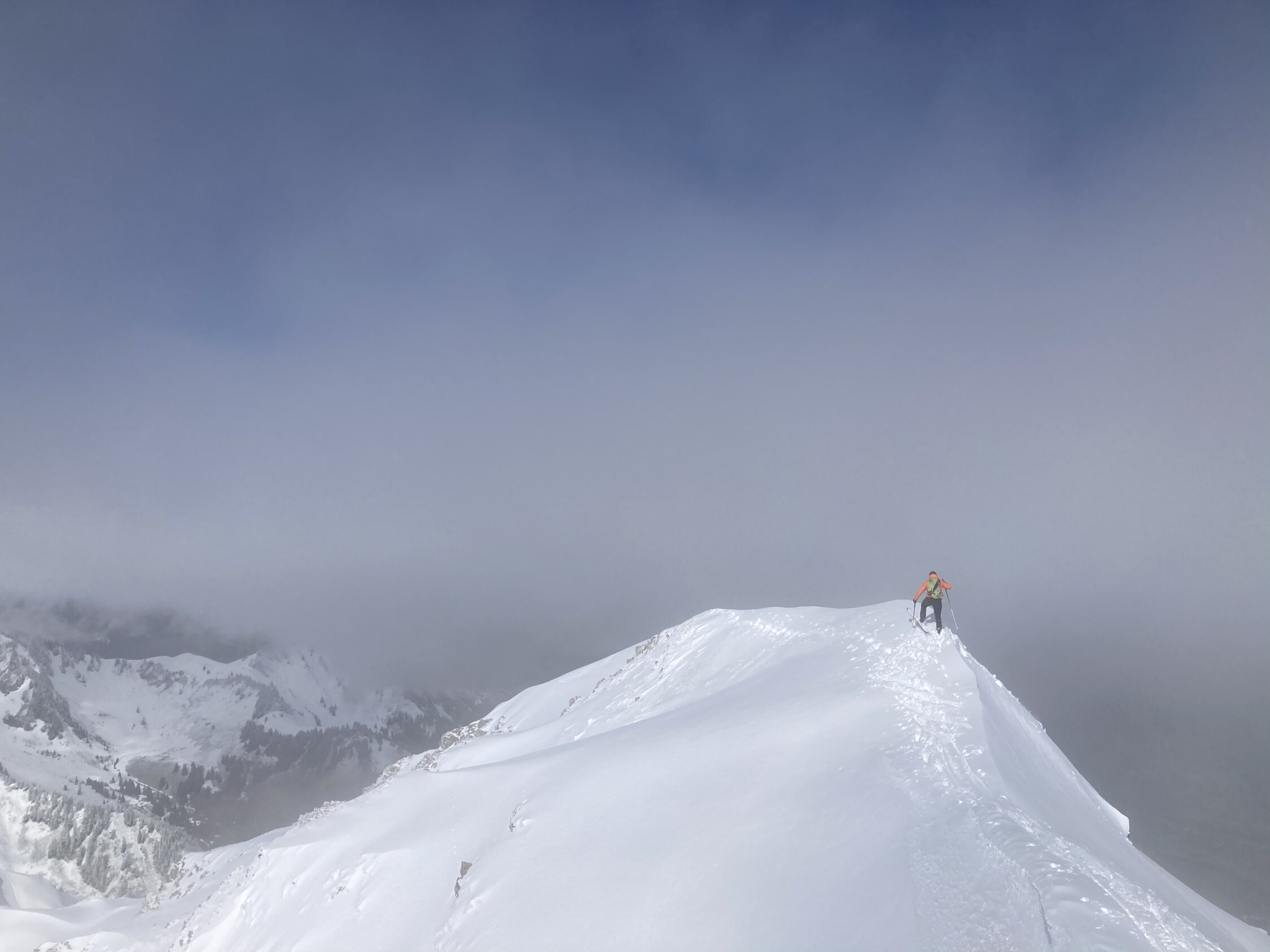 Schnee durchgehend ab 1600m. Couloir 10-20cm Pulver auf kompaktem Nassschnee. Unterhalb 1800m schnell schwer aber angenehm cremig zu fahren (Double-crème de la Gruyère, what else?). Ganzer Aufstieg in den Wolken dann Sonne ab Gipfel - parfait!