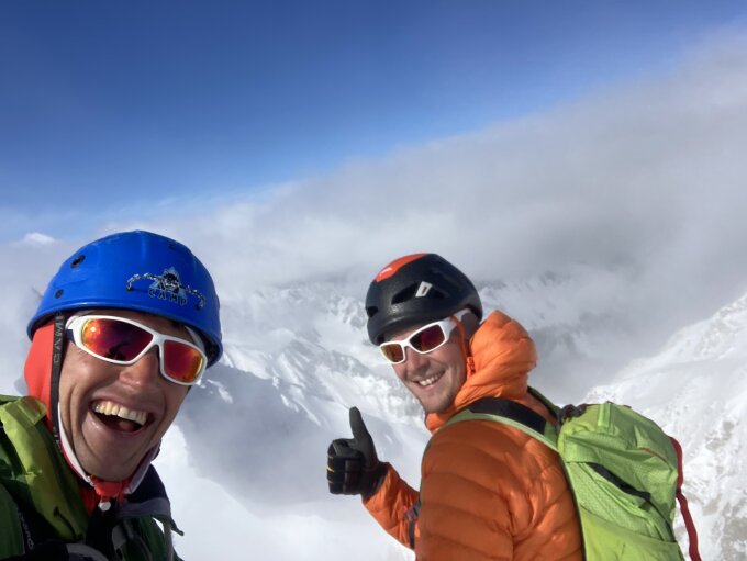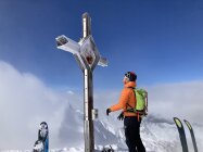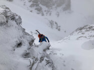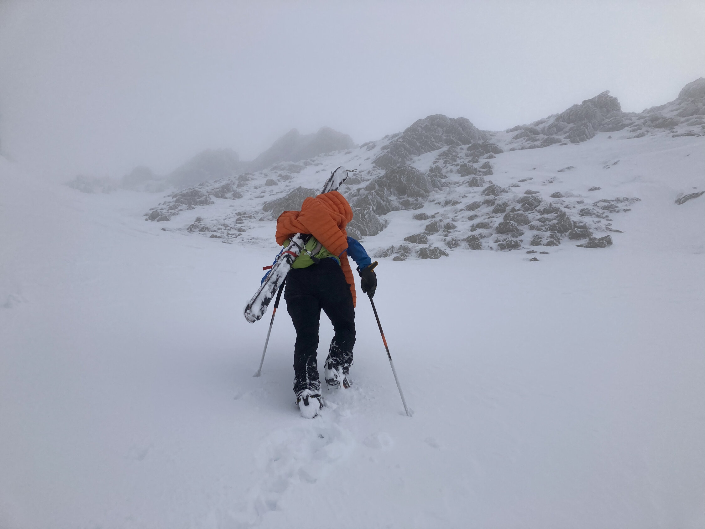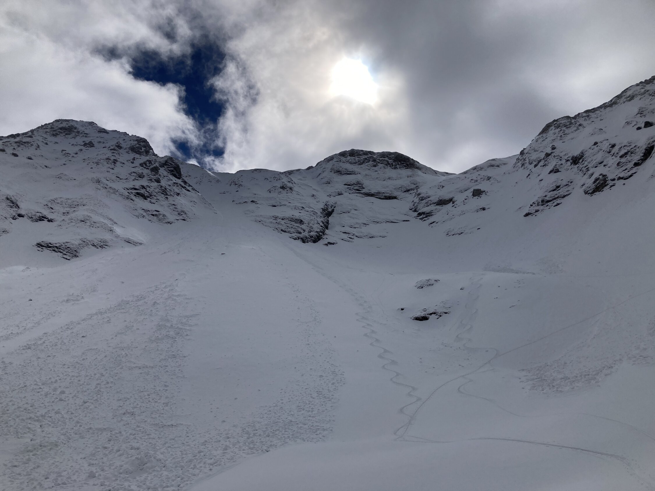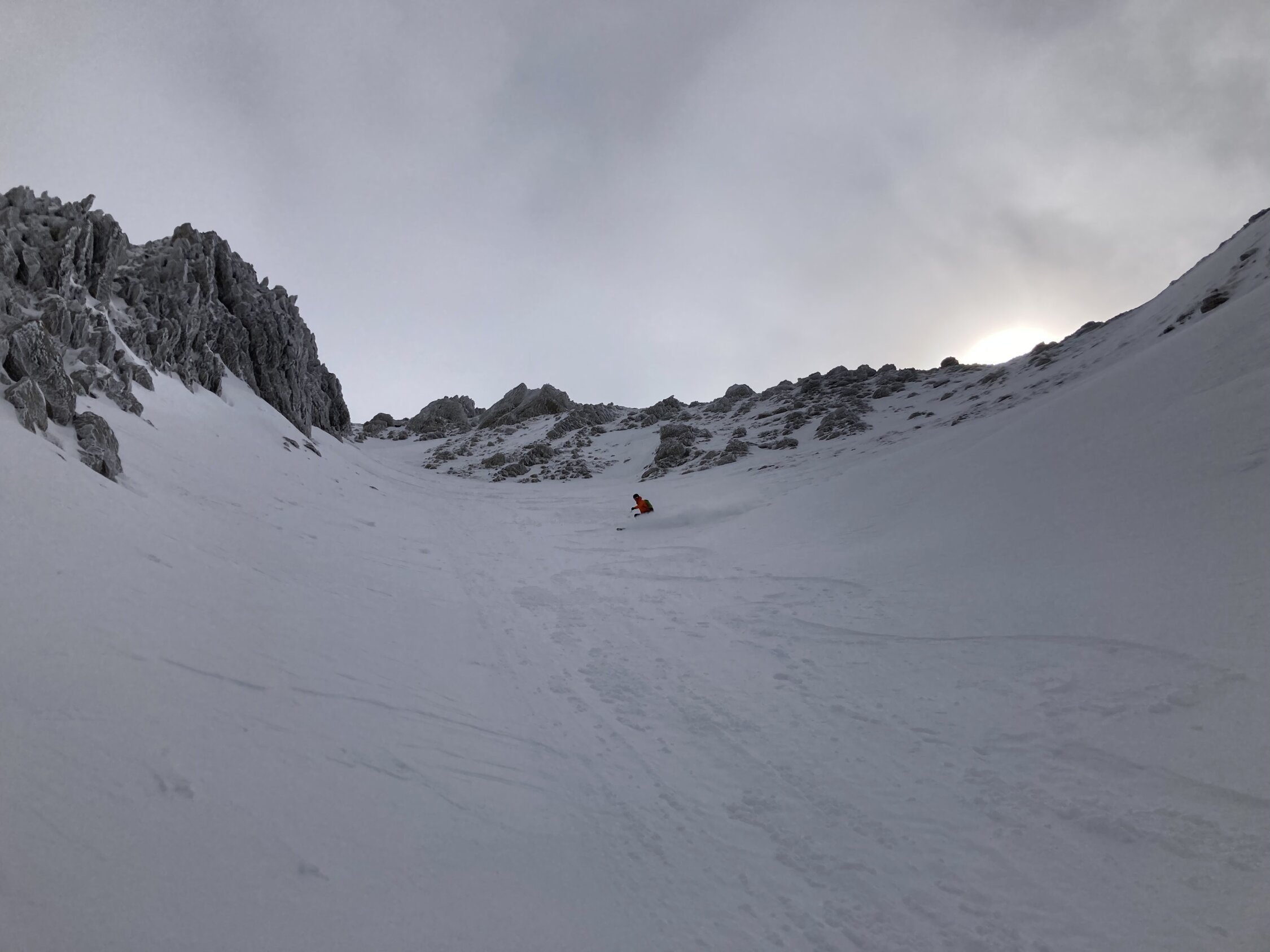 Schnee durchgehend ab 1600m. Couloir 10-20cm Pulver auf kompaktem Nassschnee. Unterhalb 1800m schnell schwer aber angenehm cremig zu fahren (Double-crème de la Gruyère, what else?). Ganzer Aufstieg in den Wolken dann Sonne ab Gipfel - parfait!