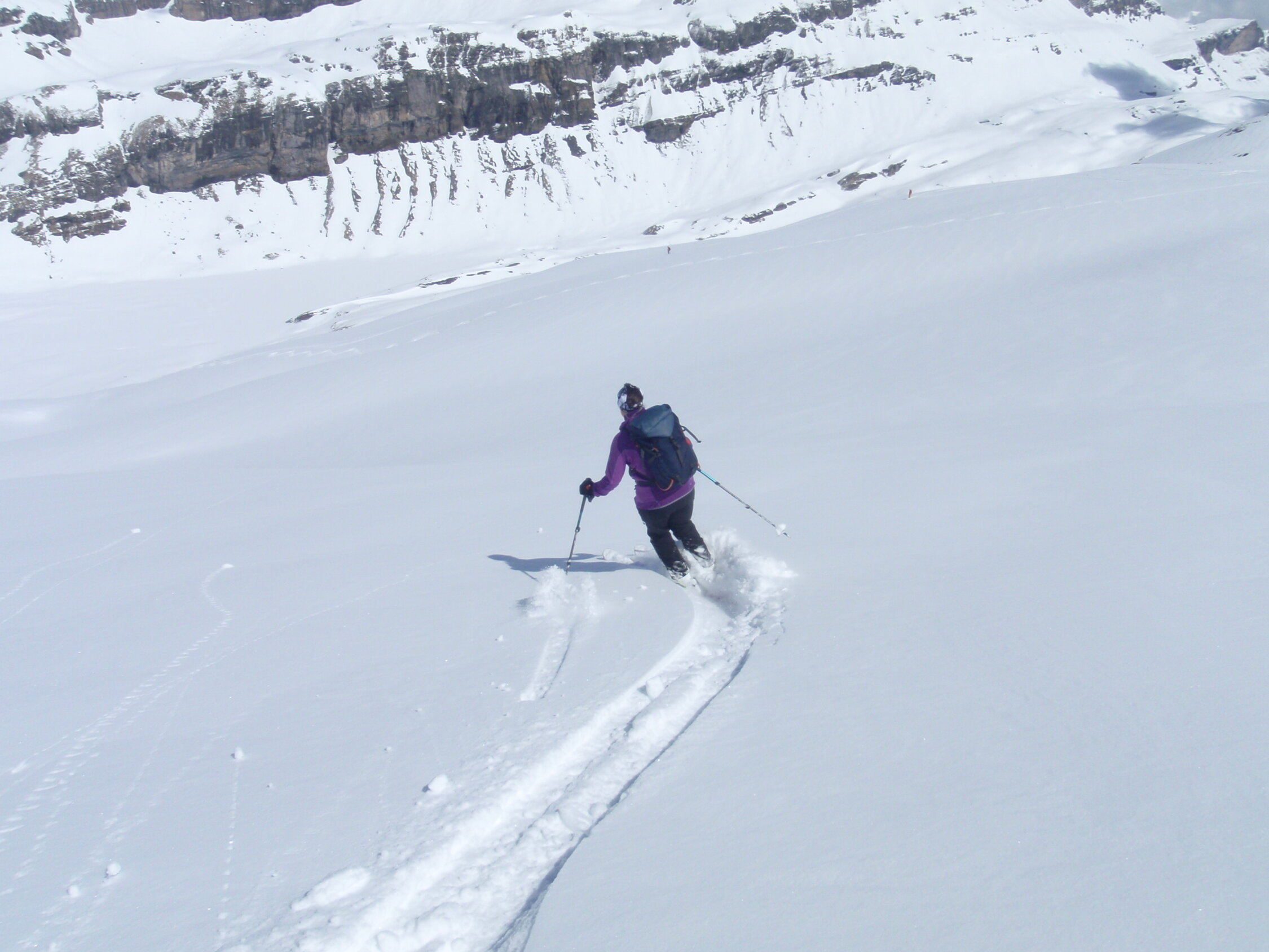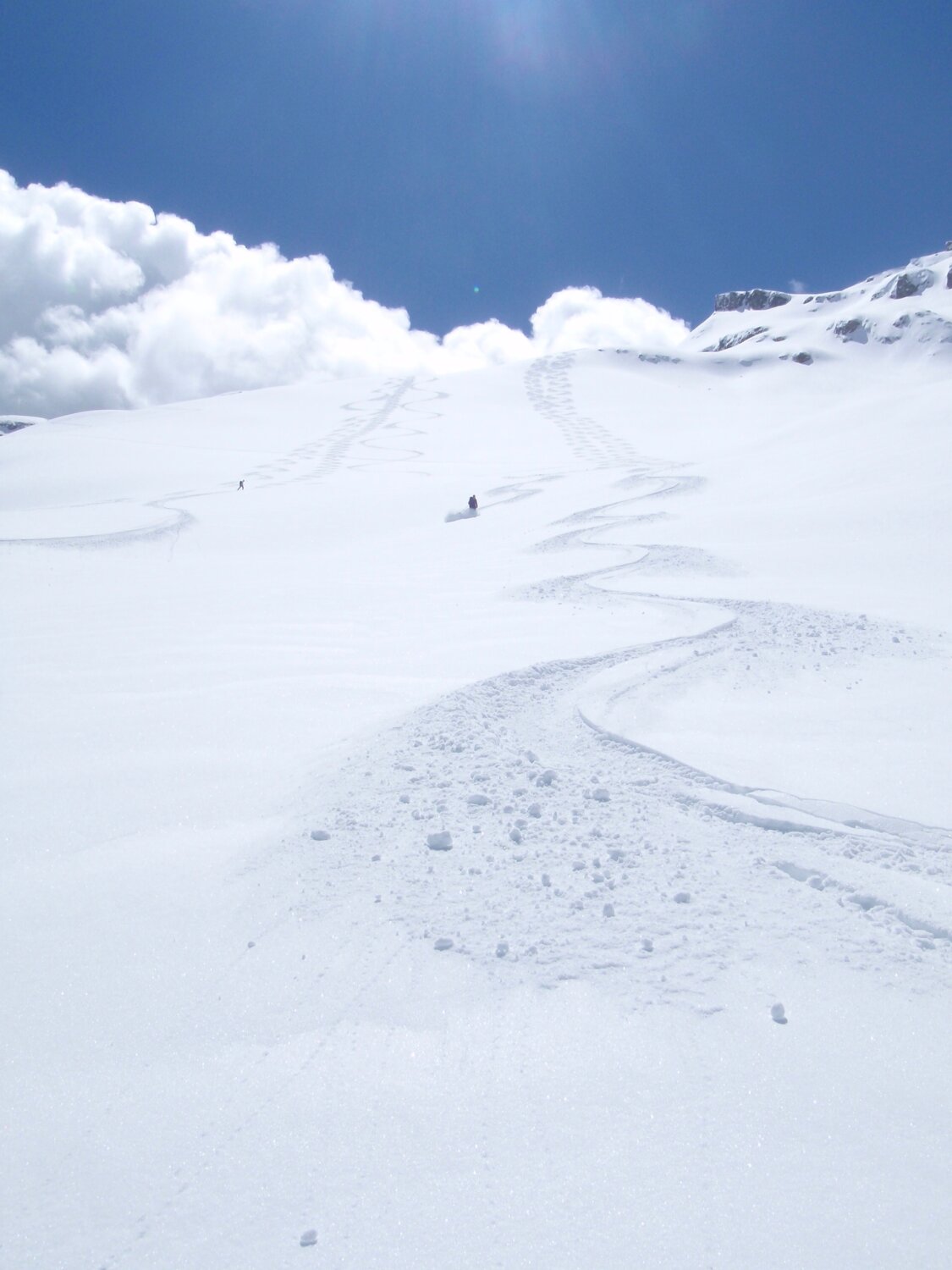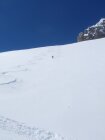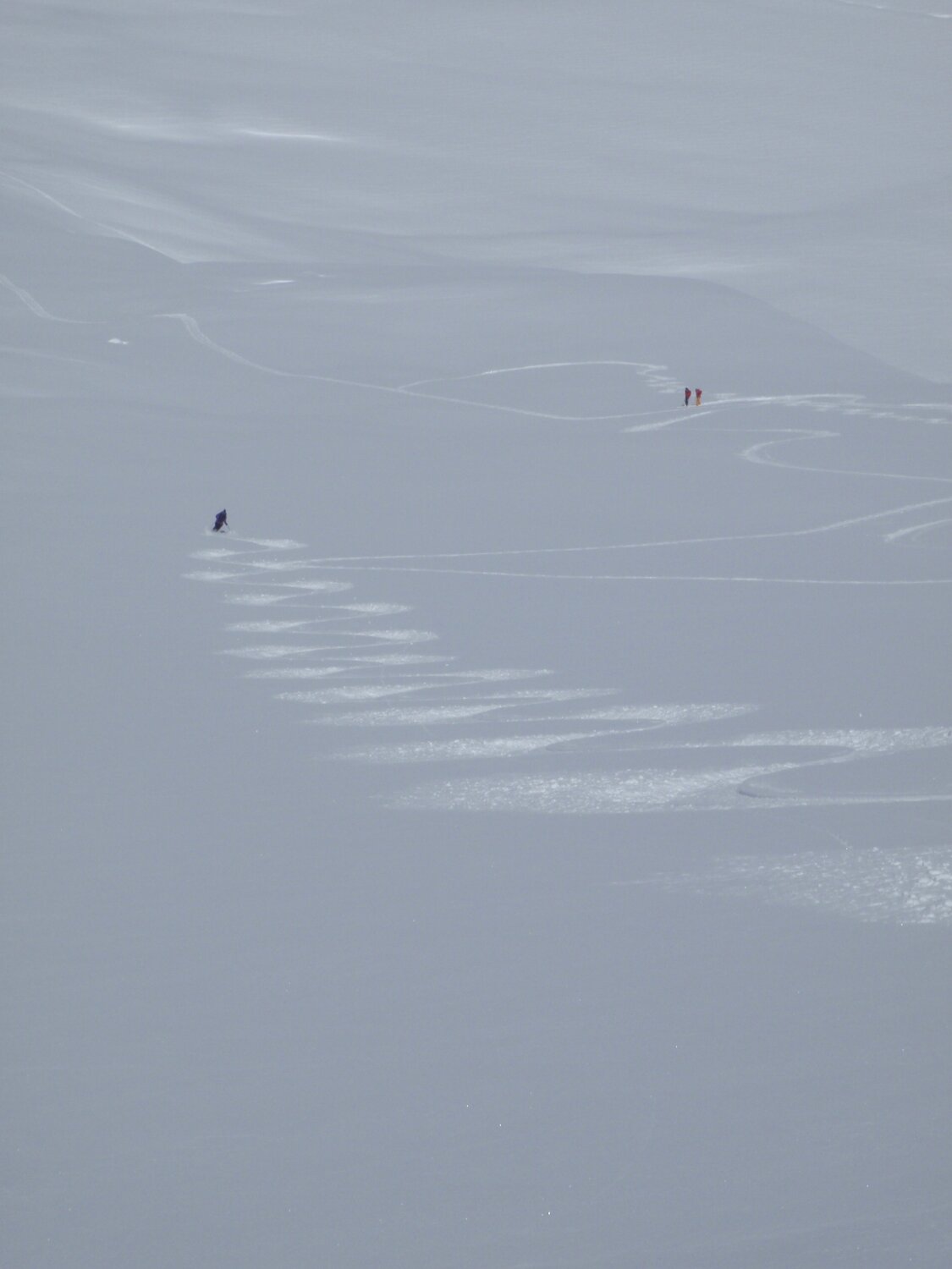 Anstatt wie geplant von der Gemmi auf den Wildstrubel sind wir der schattigeren Exposition wegen auf dem Lämmernboden links abgebogen. Wir sind dann nicht auf den Gipfel des Daubenhorns, sondern rechts hinauf zum Daubenjoch. Dies ergab ein paar zusätzliche Schwünge im perfekten Pulverschnee bis ganz hinunter auf den Lämmernboden..