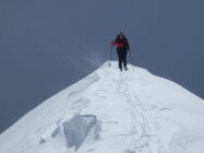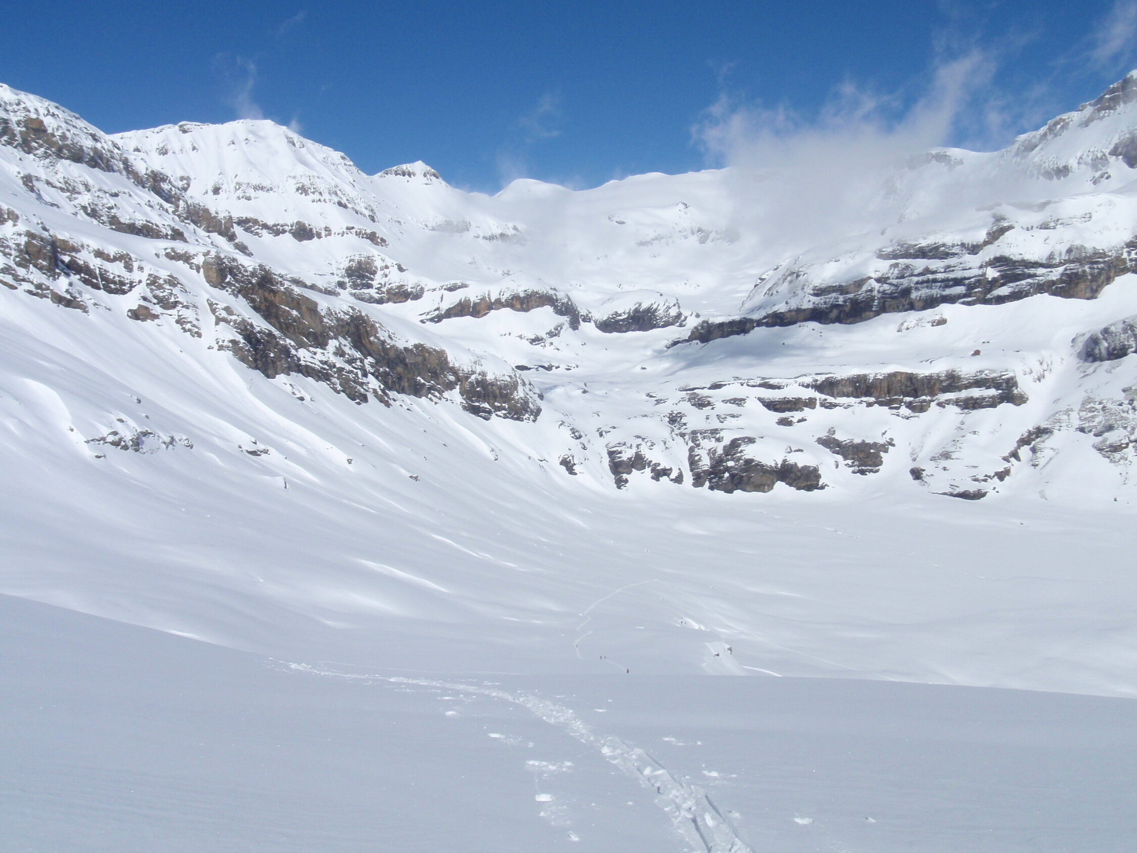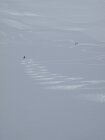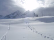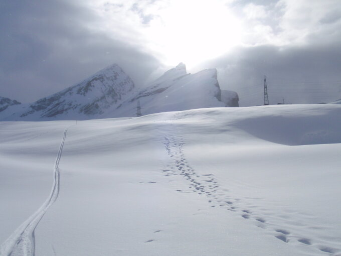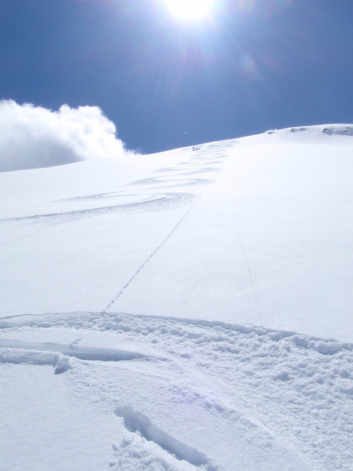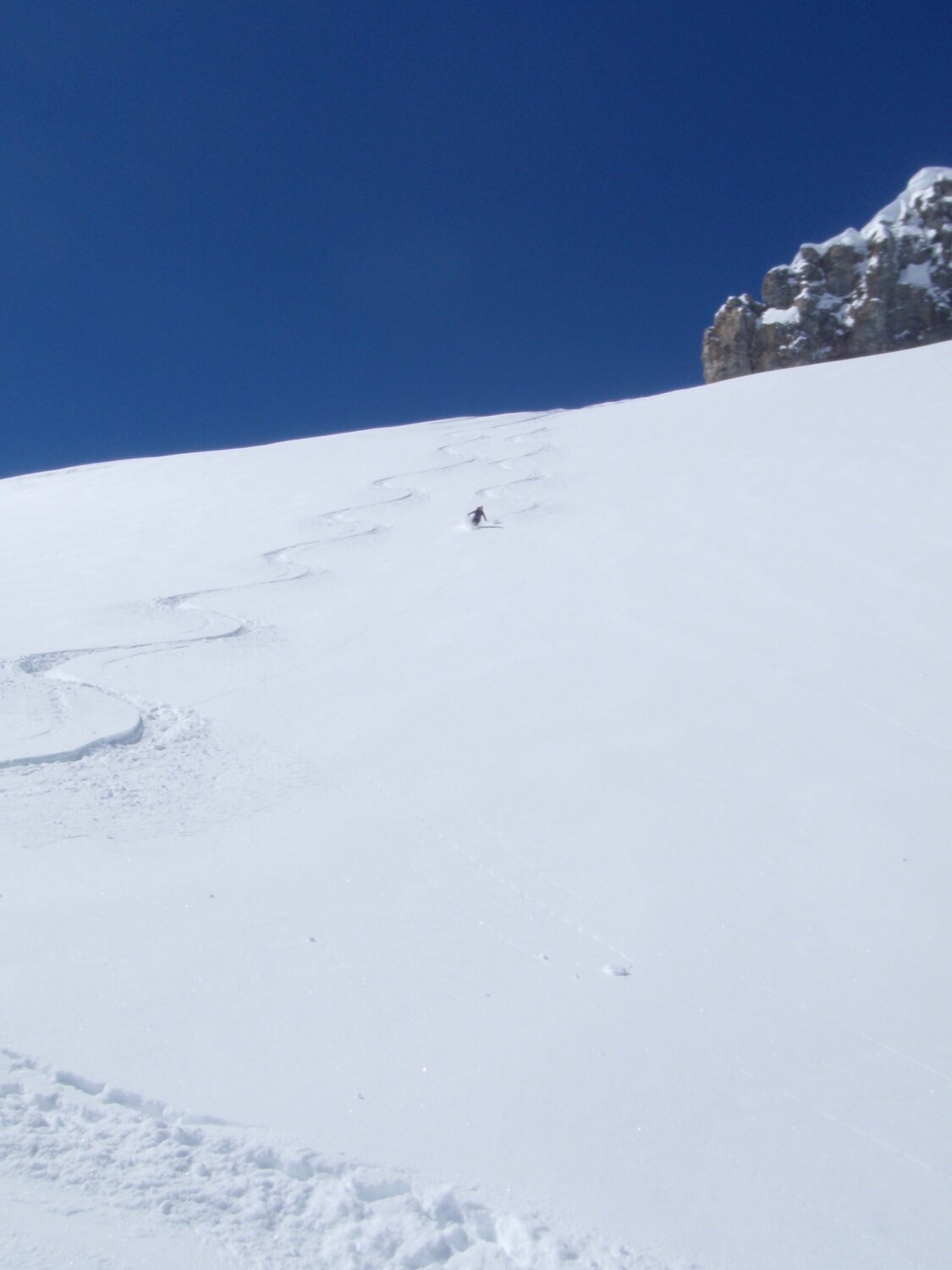 Anstatt wie geplant von der Gemmi auf den Wildstrubel sind wir der schattigeren Exposition wegen auf dem Lämmernboden links abgebogen. Wir sind dann nicht auf den Gipfel des Daubenhorns, sondern rechts hinauf zum Daubenjoch. Dies ergab ein paar zusätzliche Schwünge im perfekten Pulverschnee bis ganz hinunter auf den Lämmernboden..