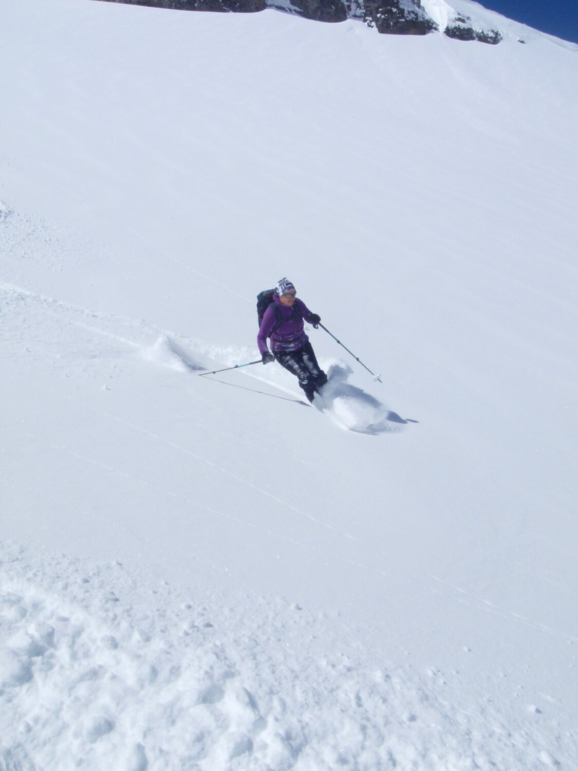 Der in der Nacht gefallene Pulverschnee war am vormittag perfekt zu fahren. In der Nachmittagswärme wird er gelitten haben. Die Unterlage unter dem Pulver war tragend gefroren, darunter war die Schneedecke durchfeuchtet.