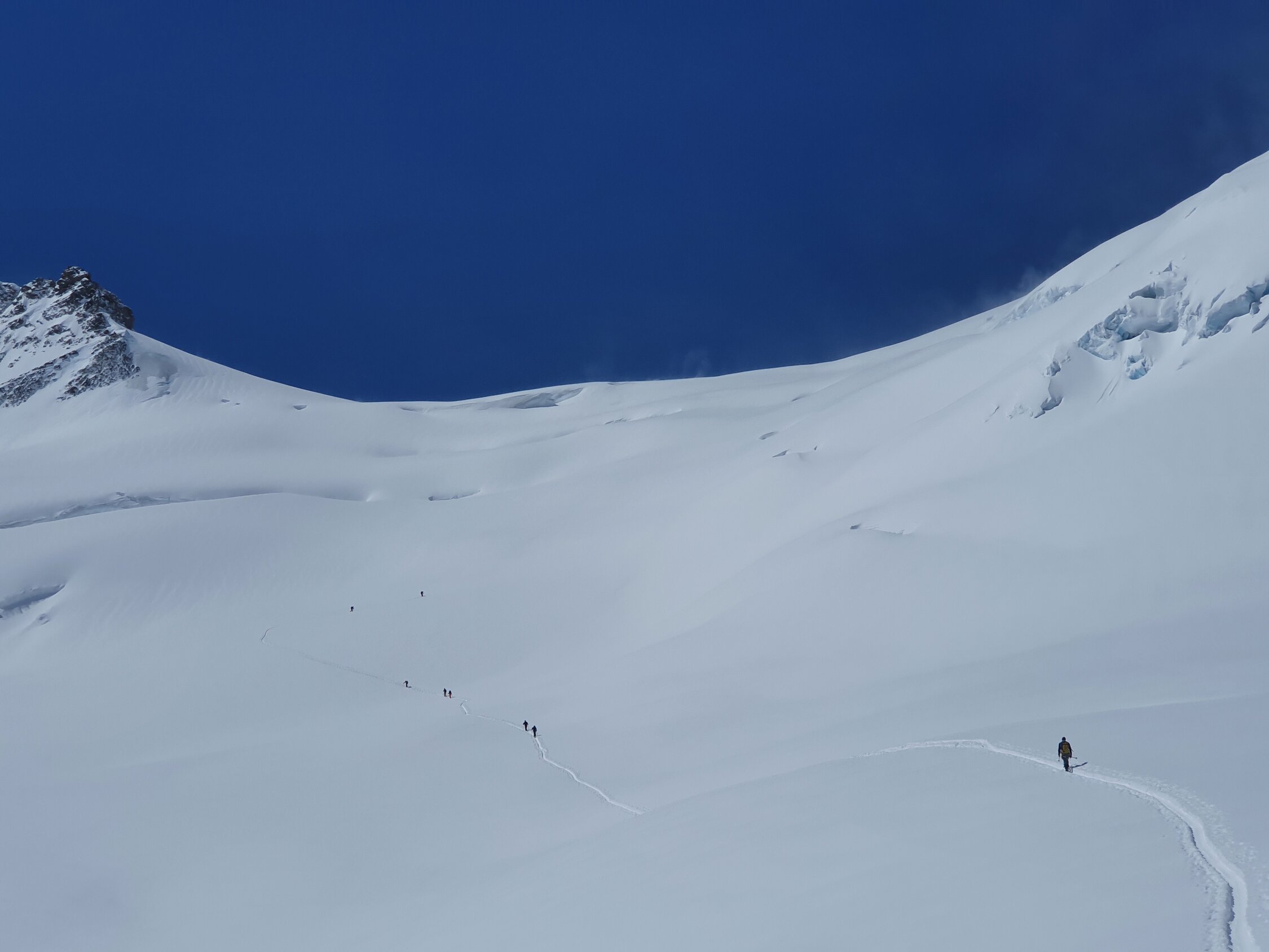 Ausgezeichnet bezieht sich auf den oberen Teil bis Lötschenlücke. Dort hat es noch sehr viel Schnee und eine fluffige Pulverauflage von ca. 20 cm. Unterhalb der Lötschenlücke wurde es dann zunehmend schwerer und ab unterem Teil Langgletscher matschig.