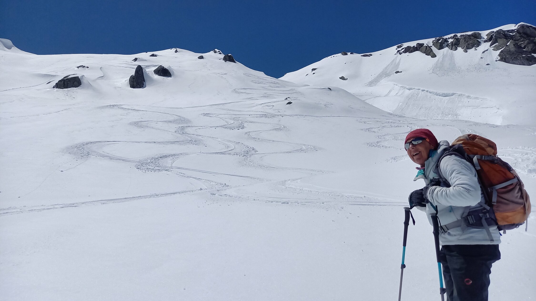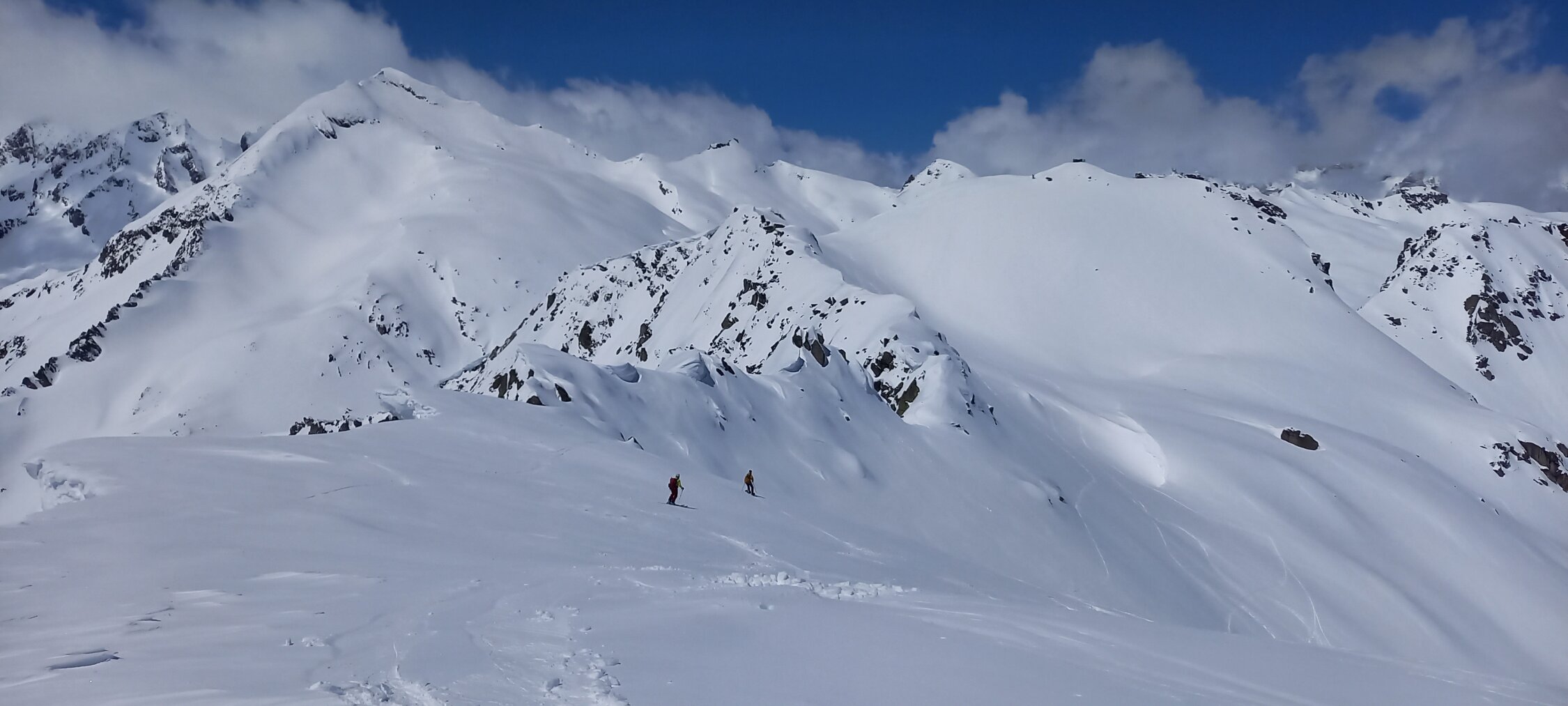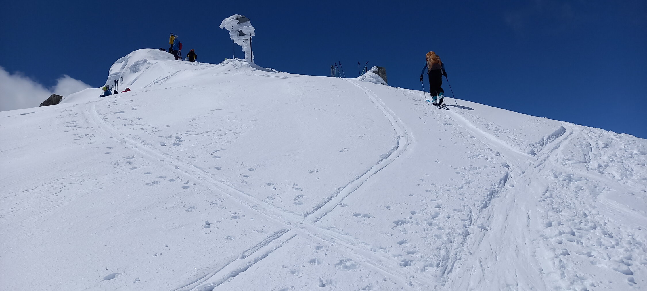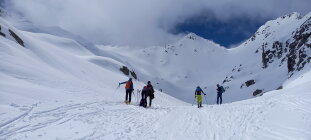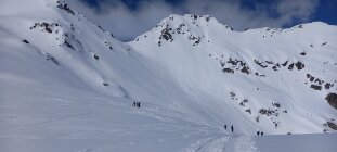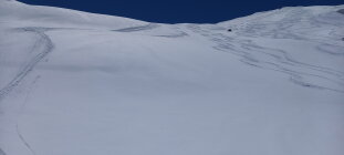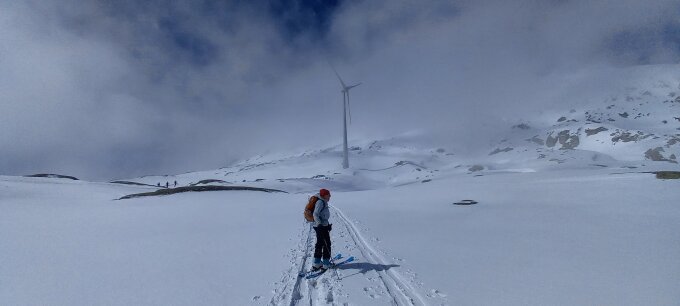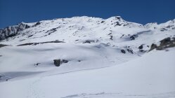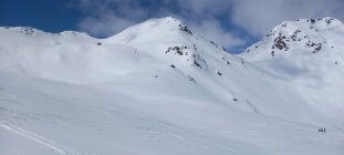 Diesmal wählten wir die Abfahrt leicht unterhalb des Gipfels rechts haltend in den Nordost Hang, relativ direkt Richtung Passhöhe. Nicht hinten herum der Aufstiegsspur entlang. Bei üppig Schnee ist das eine interessante, wenig befahrene Variante. Bei schlechter Sicht jedoch, Hände weg. Das coupierte Gelände mit Ecken und Kanten erfordert "Weitsicht".