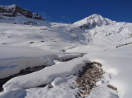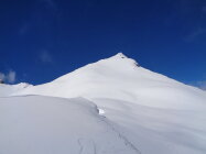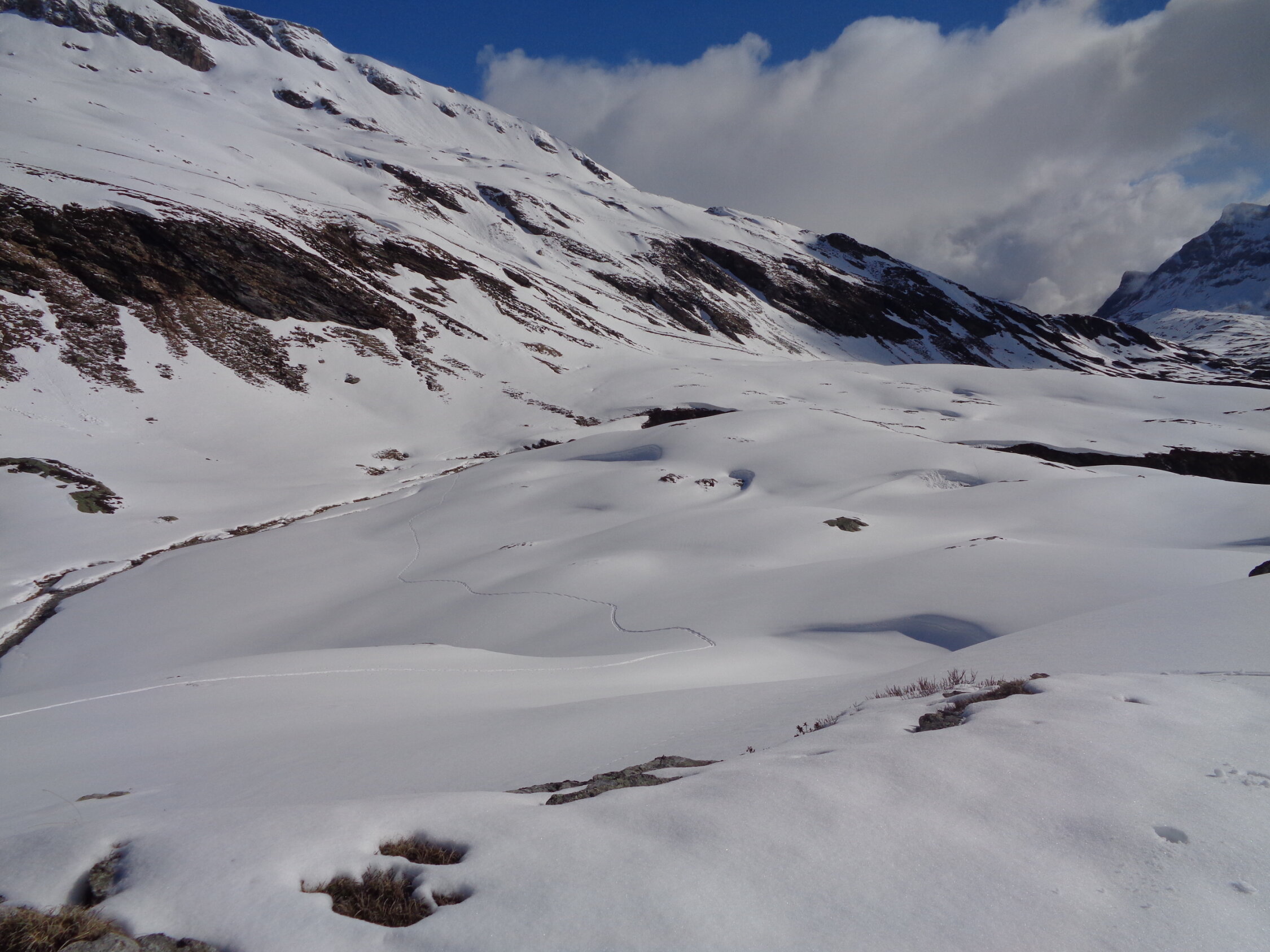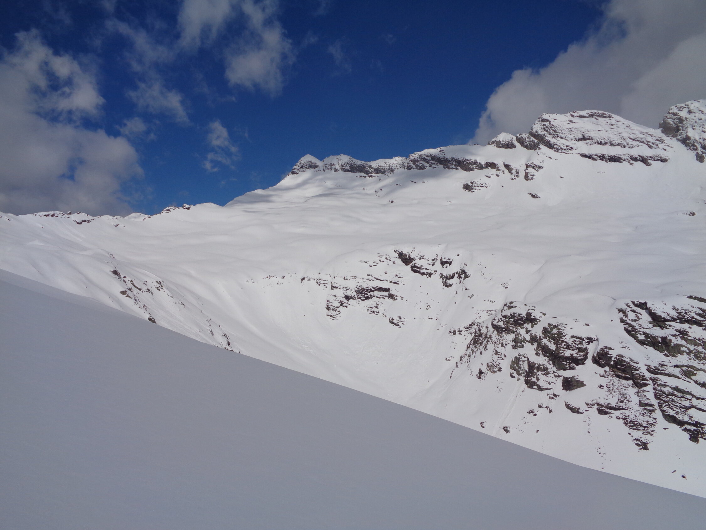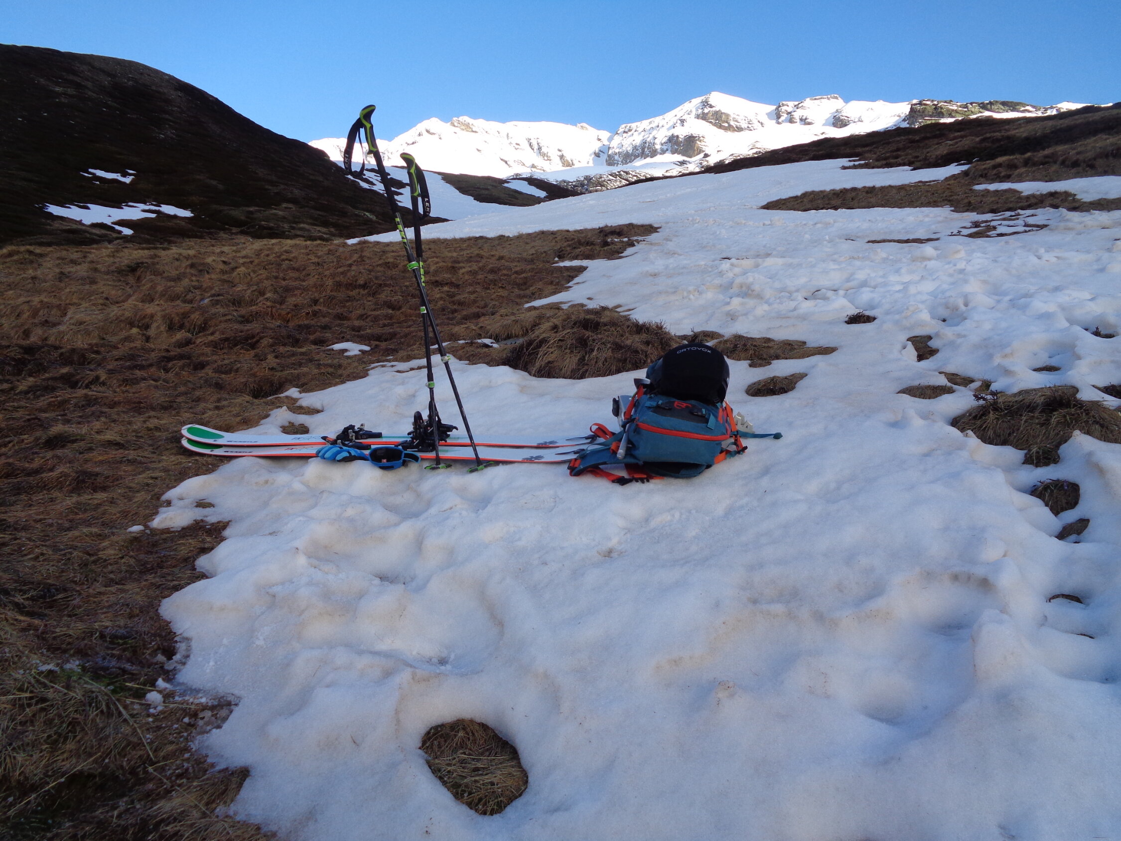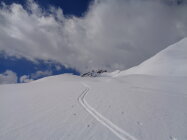 Von der Strassenkurve nach Ca de Mucia müssen die Skis 20 Min. getragen werden, zwei Bäche sind zu traversieren. Vom ersten Schnee dann bis zu "La Leca" und dann etwas hinunter zum Bach, wo man sich eine geeignete Schneebrücke suchen muss. Von dort dann Querung unter der Cima del Vigon bis zum Punkt 2586m. Dort war heute Ende, da das Wetter zumachte und Nebelschwaden aufzogen. Der Hauptgrund für die Umkehr waren aber die winterlichen Schneeverhältnisse. Eigentlich denkt man Ende Mai an Firn, aber ab 2200m lag viel Neuschnee, zuerst nass und schwer, weiter oben kompakter Pulver. Es muss stark geschneit haben (deswegen wohl auch die Lawinenstufe 3). Die Fortsetzung bis auf den Gipfel war mir zu heikel. In der Abfahrt die ersten 200Hm tragender, schön drehender Schnee, anschliessend nasser Schnee mit weichem Deckel, sehr unangenehm zu fahren.