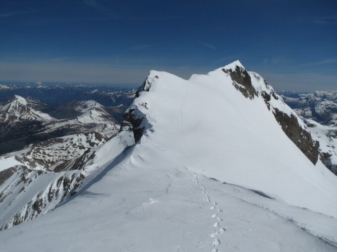 Ski anlegen bei der Brücke 1545m. Ganze Tour bester Firn. Über die Flanke direkt zum Hauptgipfel nicht empfehlenswert, besser über den Ostgipfel zum Hauptgipfel - easy! Pickel nicht notwendig aber auf Wächten achten.