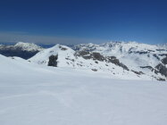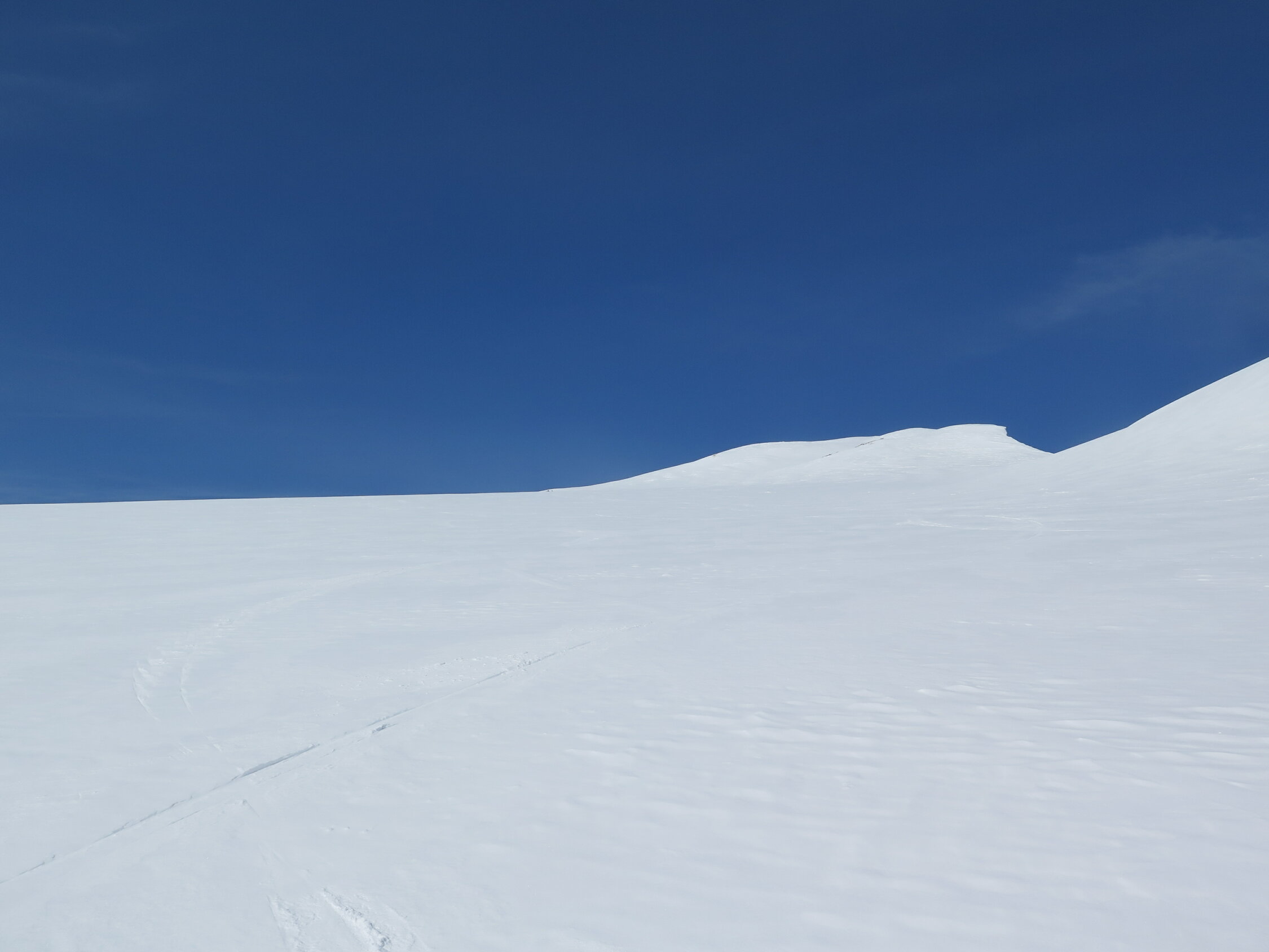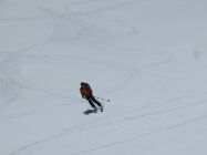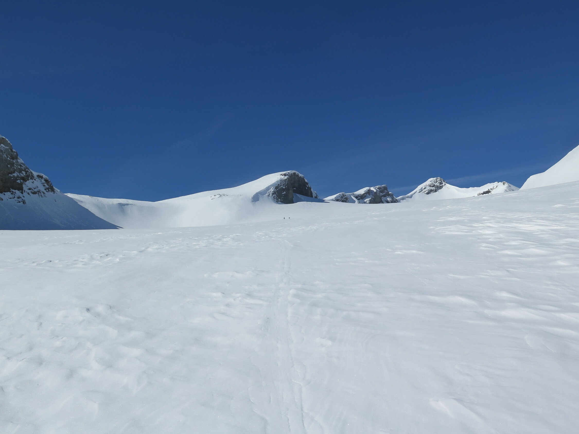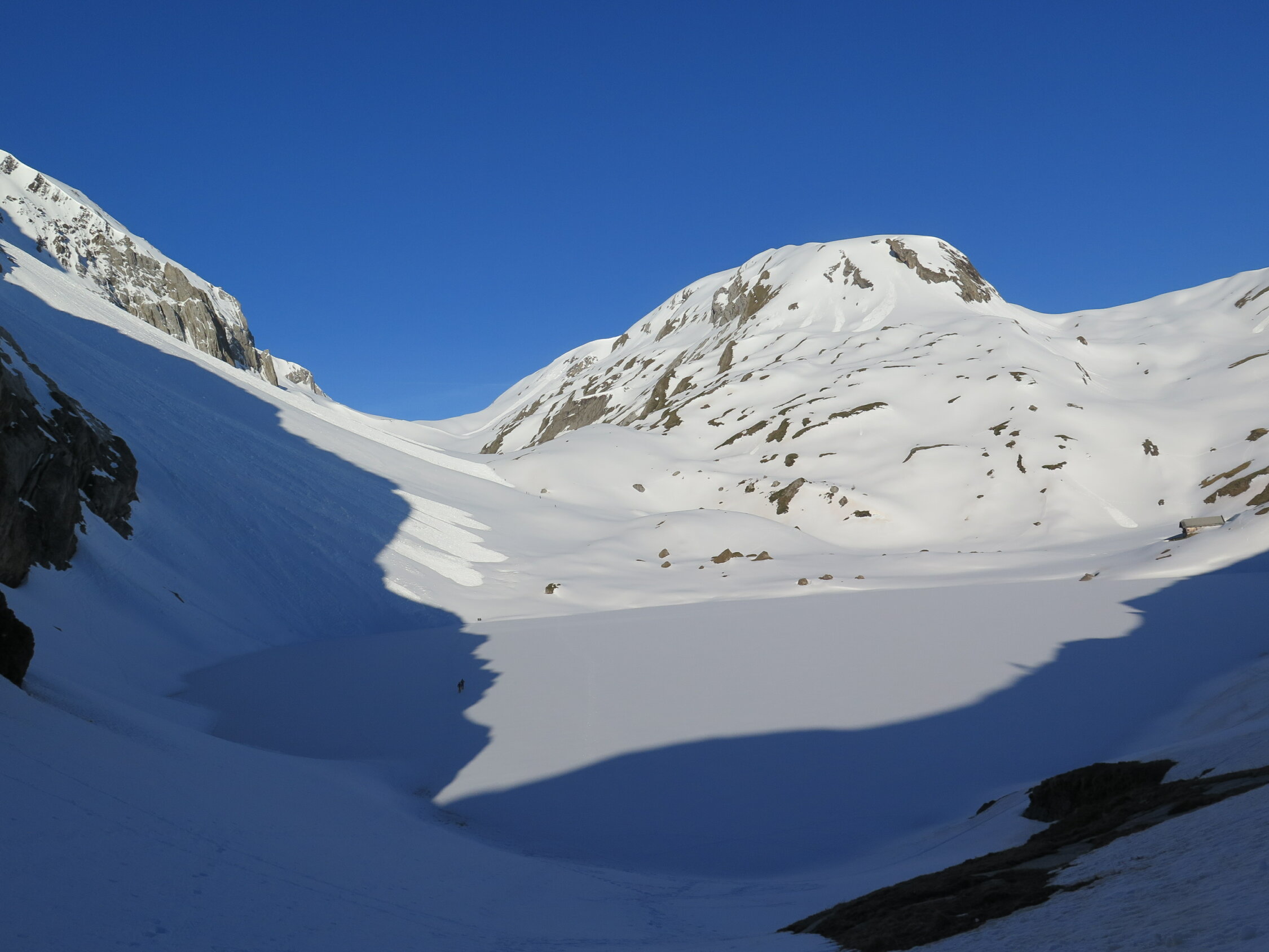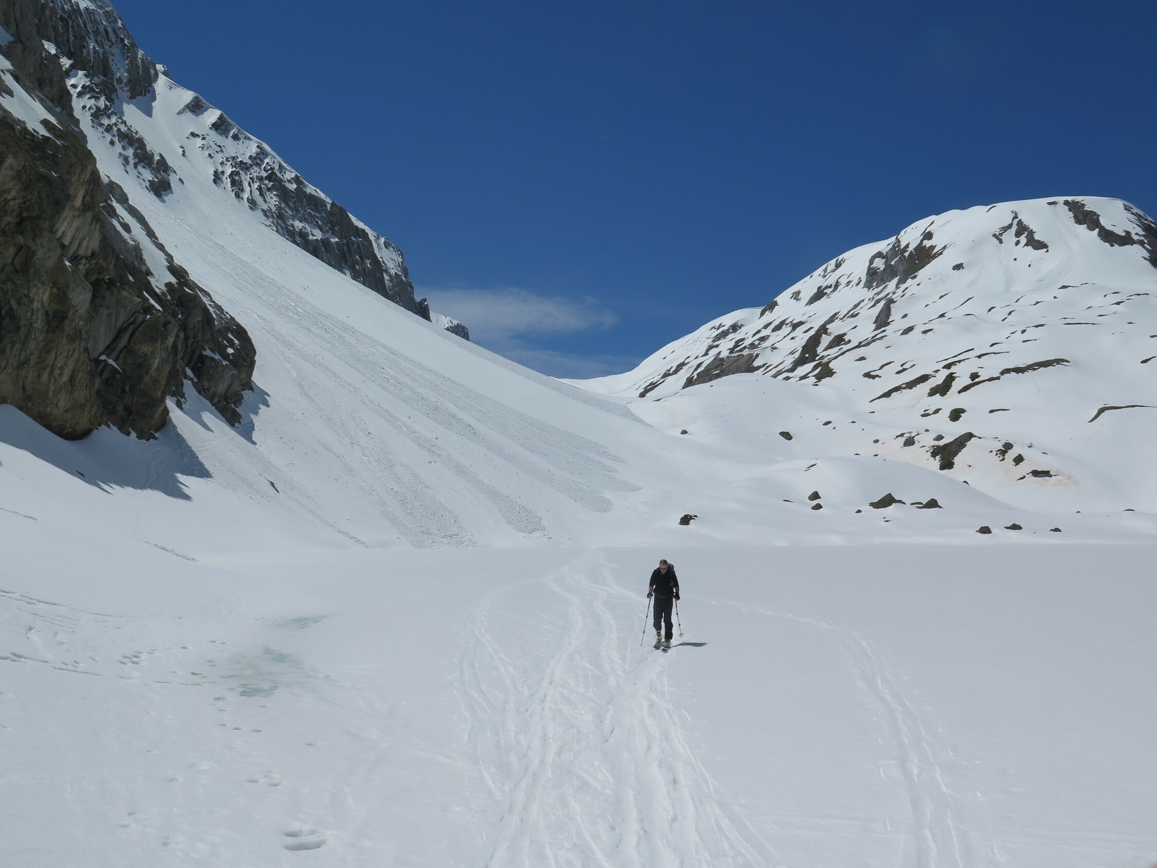 Abfahrt um 12.40 war etwas spät. Wobei bis zur Wildhornhütte sehr gute Verhältnisse waren. Von Nassem Pulver Gipfelhang bis schöner Sulz. Je nach Hang Neigung und Richtung. Aber Ab Wildhornhütte War es schon sehr Tiefer und Nasser Schnee. Der See kann man noch mit Skis betreten. Aber Dies kann schnell ändern.