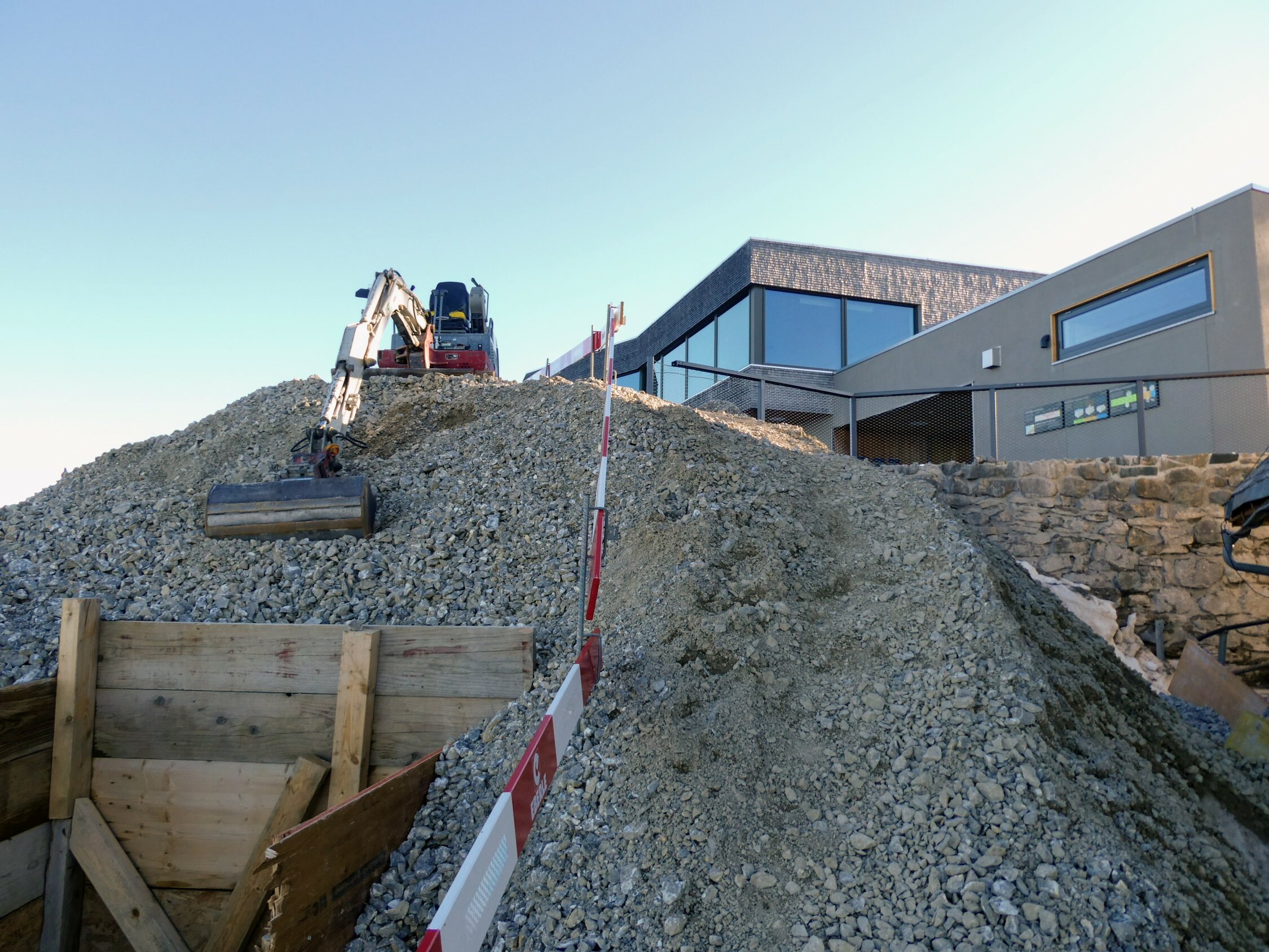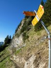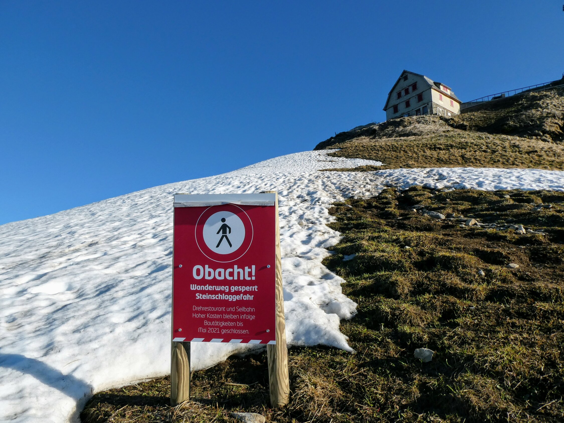 Die Warntafeln beim Kastensattel, auf denen steht, dass der Gipfelaufstieg gesperrt ist, wurden noch nicht entfernt. Die Bauarbeiten sind weitgehend abgeschlossen, bis auf eine kleine Baustelle beim alten Berggasthaus. Von dort aus könnten durchaus noch Steine runterdonnern.