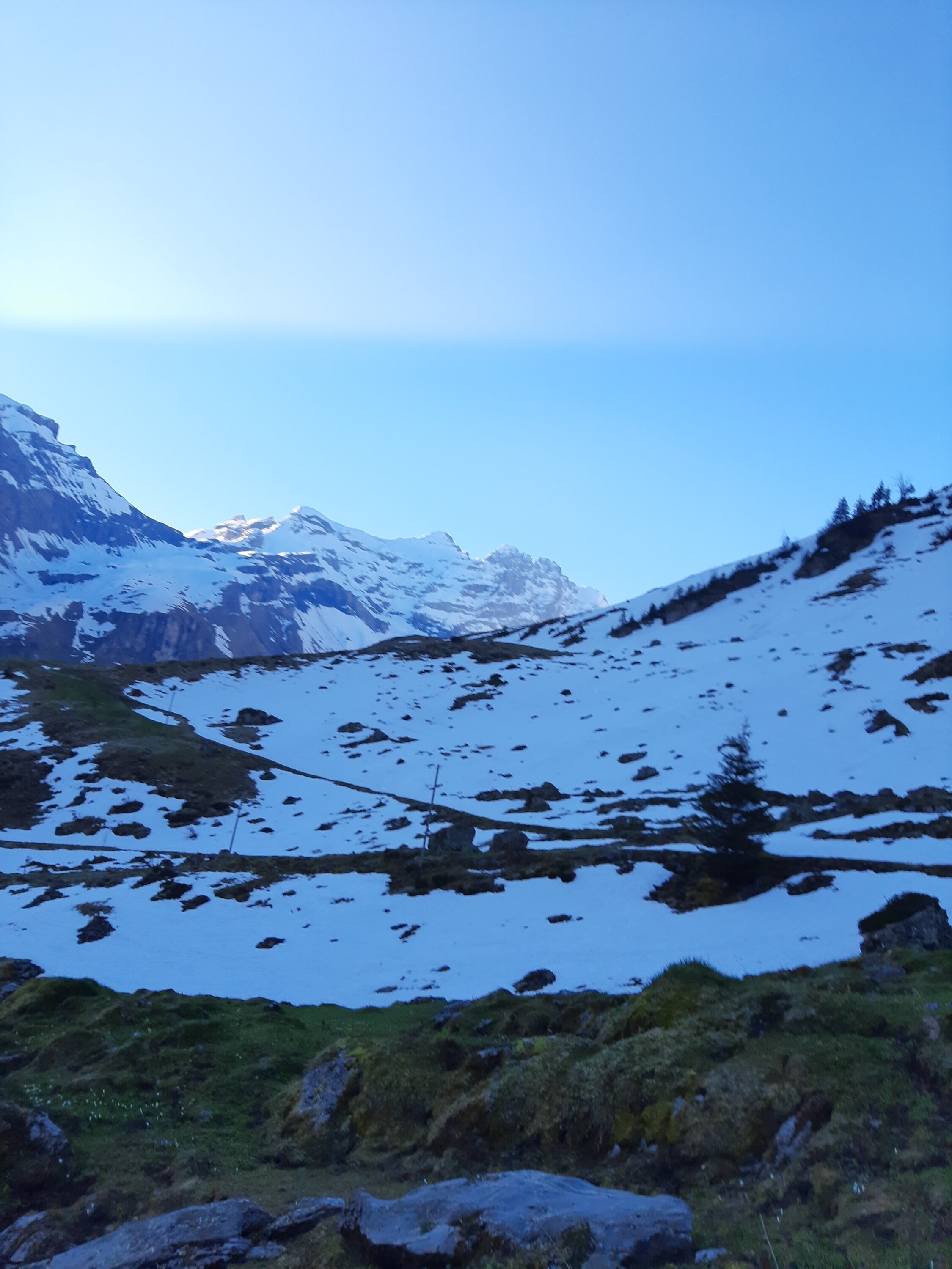 Der Schnee beginnt auf ca. 1750müM. Wir sind via Mittelberg/Dünden den Wanderweg mit aufgebunden Skis aufgestiegen. Super schöne Stimmung am Morgen.