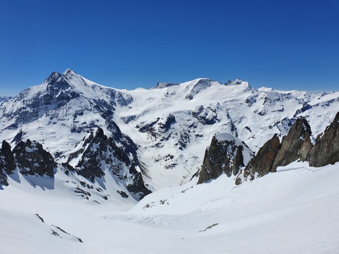 Bei der ersten Steilstufe müssen die Skis kurz getragen werden, sonst top Verhältnisse bis zum Gipfel.