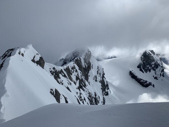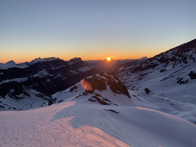 Start 4:30 am Klausenpass bei 4°C. Schneedecke tragend gefroren, sehr gute Abstrahlung in der Nacht. Glasige Spur, Harscheisen empfehlenswert. Griffiger Presspulver im Bereich Iswändli. Abfahrt Richtung Südfuss Chammlihoren auf fester, griffiger und ebener Unterlage. Engstelle im Couloir beginnt auszuapern, (noch) sehr wenig Wassereis, meist gute Firnauflage. Mit zusätzlichem Eisgerät problemlos. SW Flanke guter Trittschnee mit vorhandener Spur. NW Flanke windgepresst, ebenfalls gute Spur. Insgesamt problemlos zum Gipfel. Gegen 7:30 zogen rasch Wolken hinein (die gemäss Wettervorhersage nicht hätten existieren sollen), welche sich nach Rückmeldung auch bis zum frühen Nachmittag hielten. In der Abfahrt entsprechend wenig aufgefirnt. Bombo's Rat vom Vortag zur späteren Abfahrt wäre aber ohnehin nicht einzuhalten gewesen aufgrund zeitlicher Restriktionen. Offenbar gab es aber am Vortag auch sehr späte Abfahrer, davon zeugten einige bis zu 30 cm tiefe Spuren (hart, sehr hässlich...).