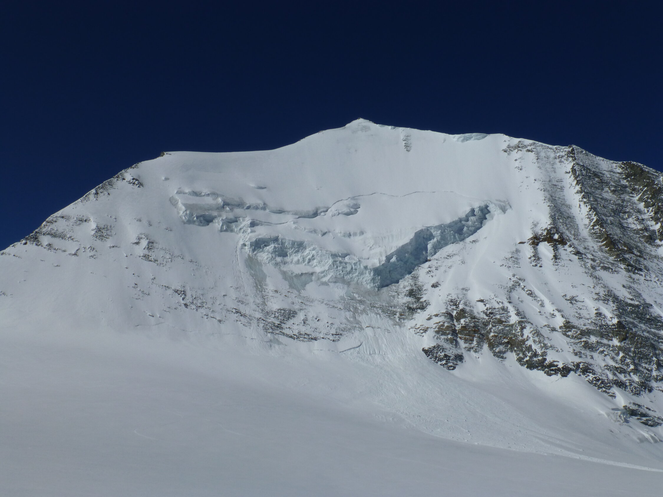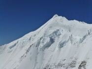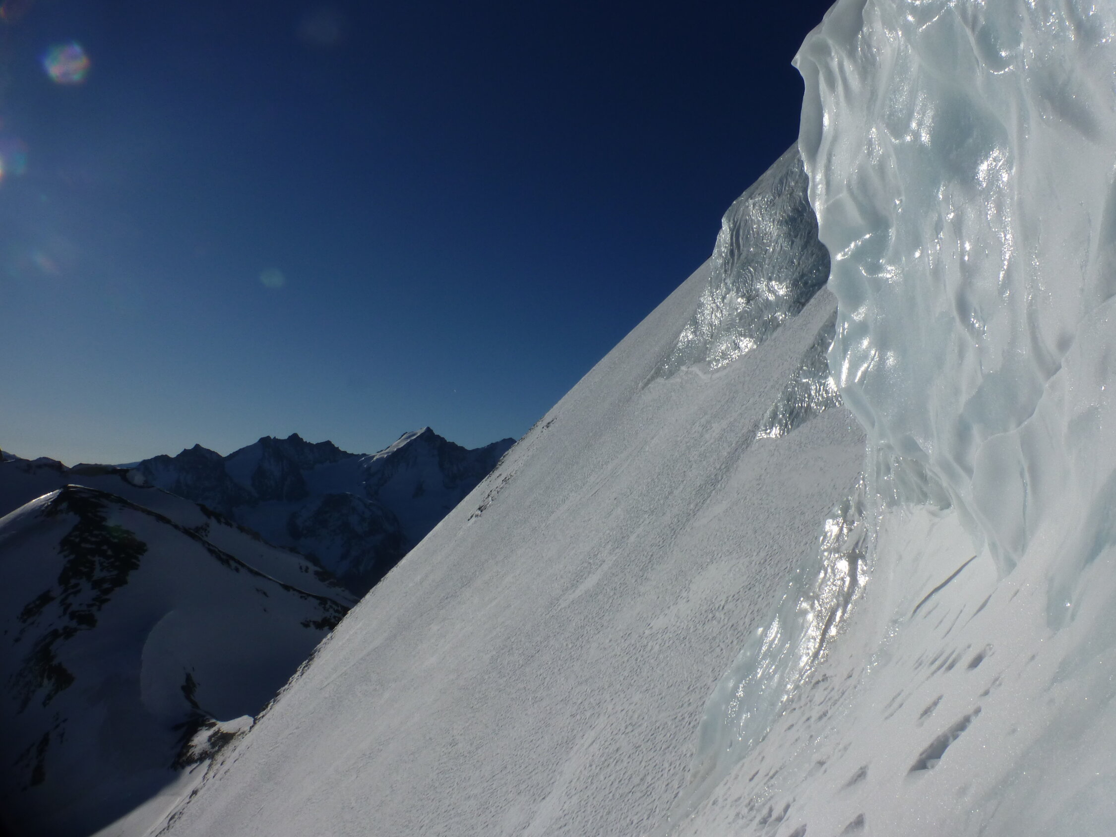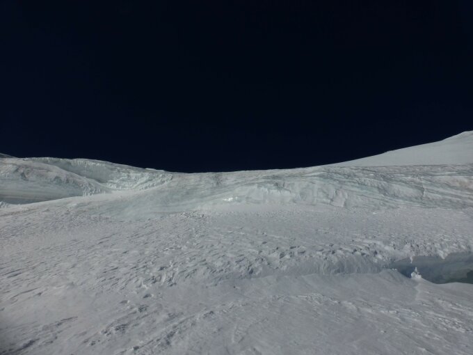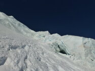 Besser geht's nicht. Rauf in Wandmitte durch die Seraczone, wo einmal kurz Eisklettern angesagt ist. Ca. 20 m, 65 bis 70 Grad. Danach Pulver. Unterhalb der Seracs ebenfalls Pulver. Bei der Abfahrt wird Zone rechts umfahren. Selten so guten Schnee in der Neigung gesehen.