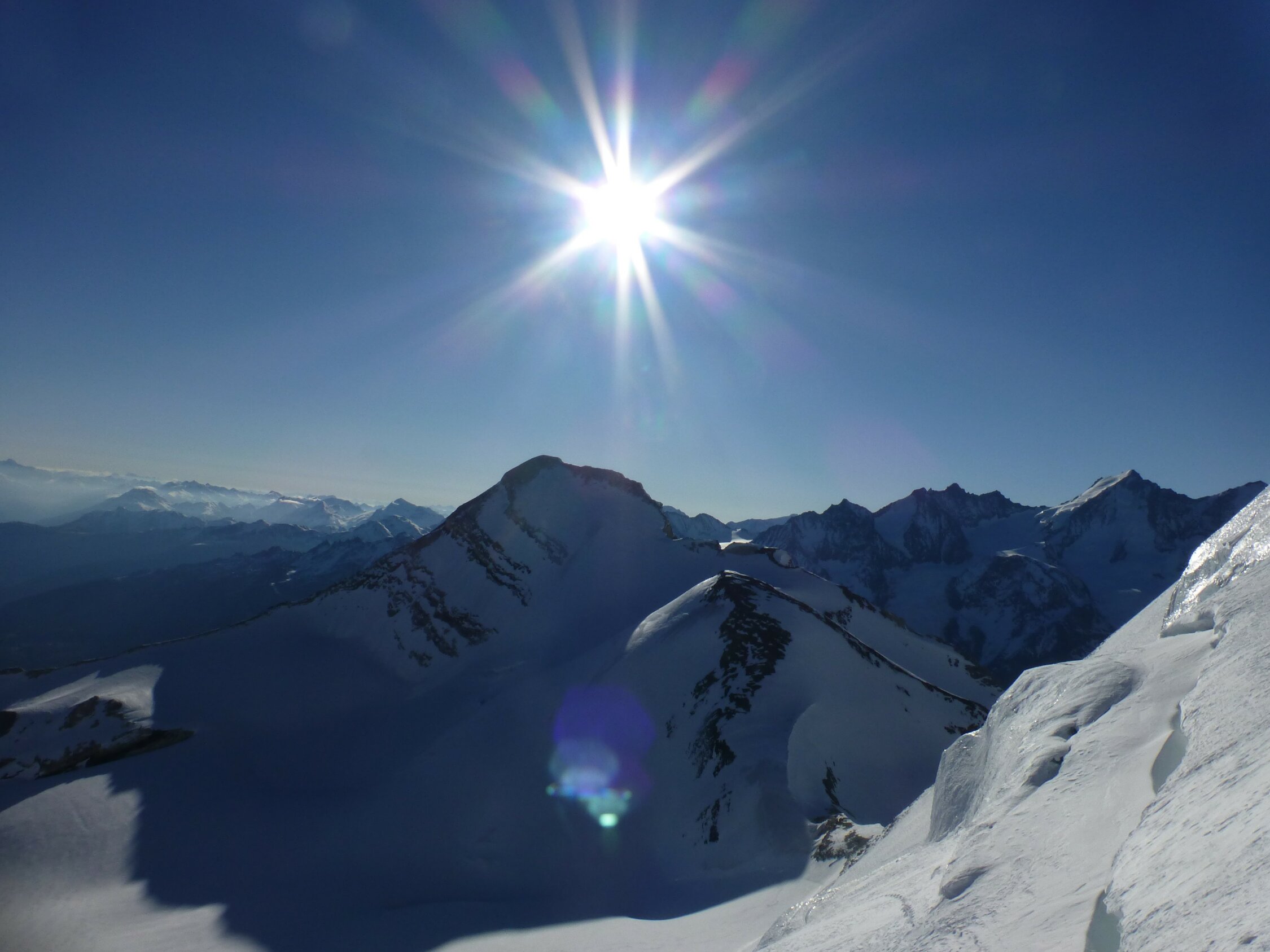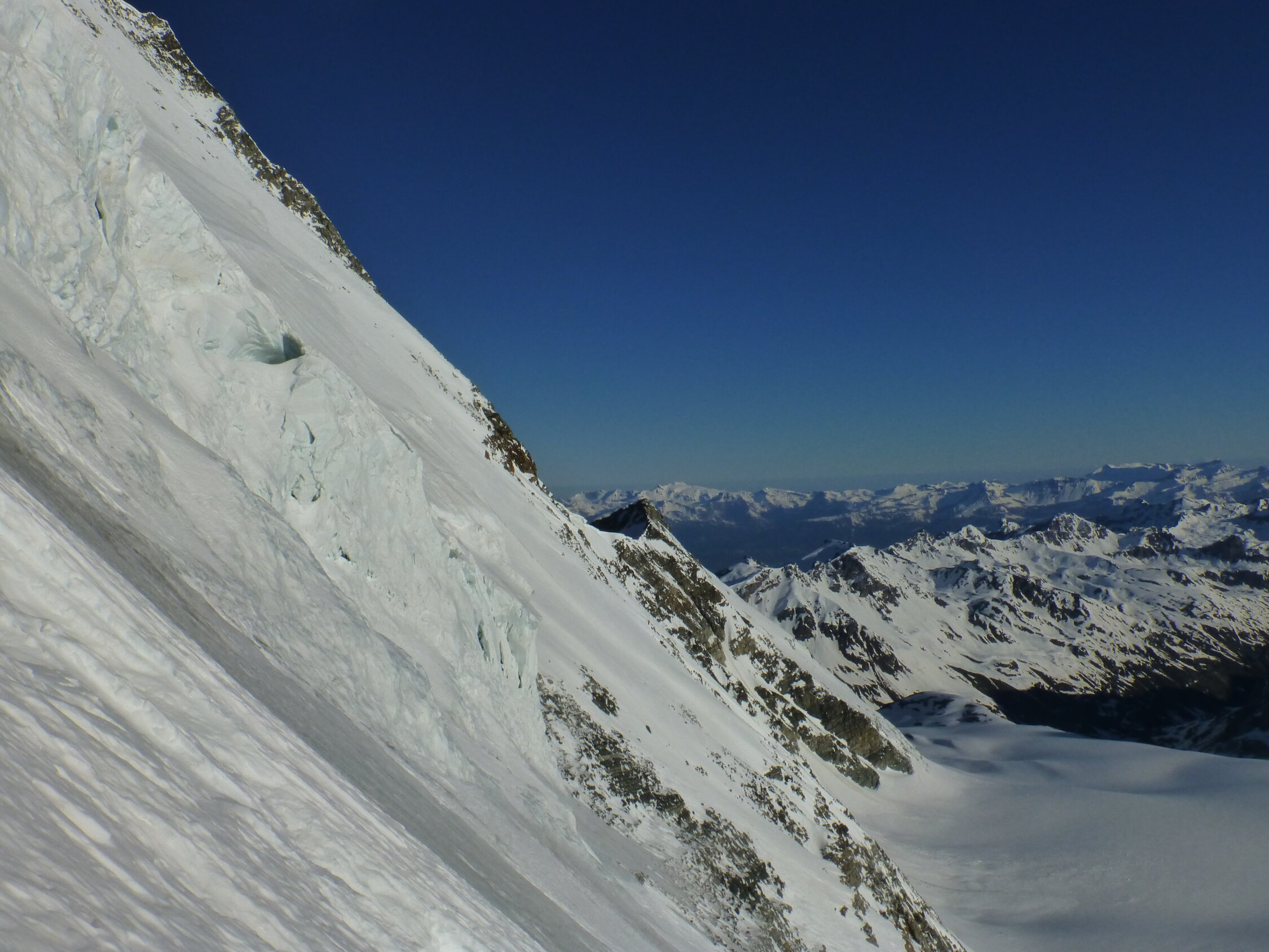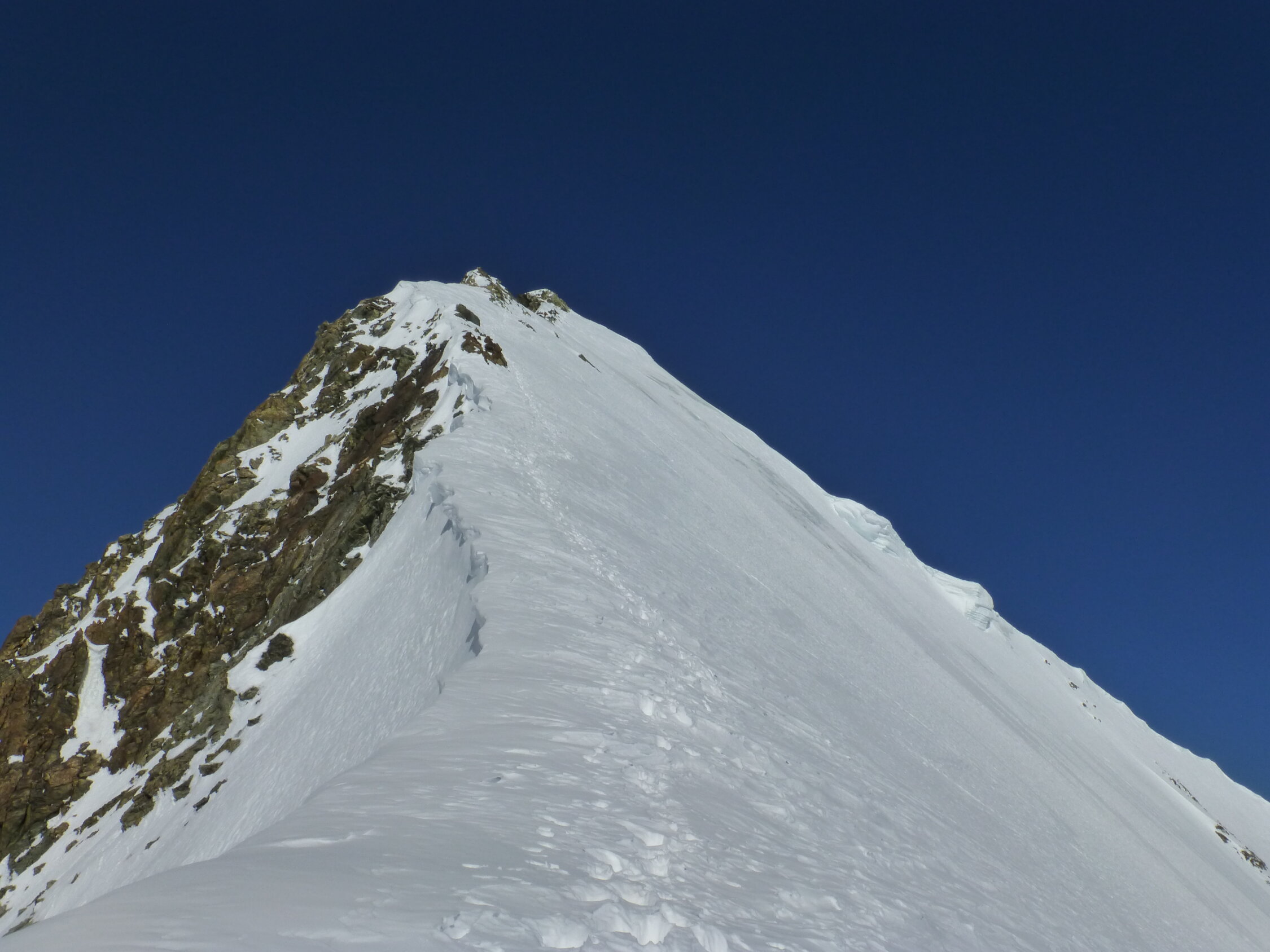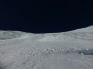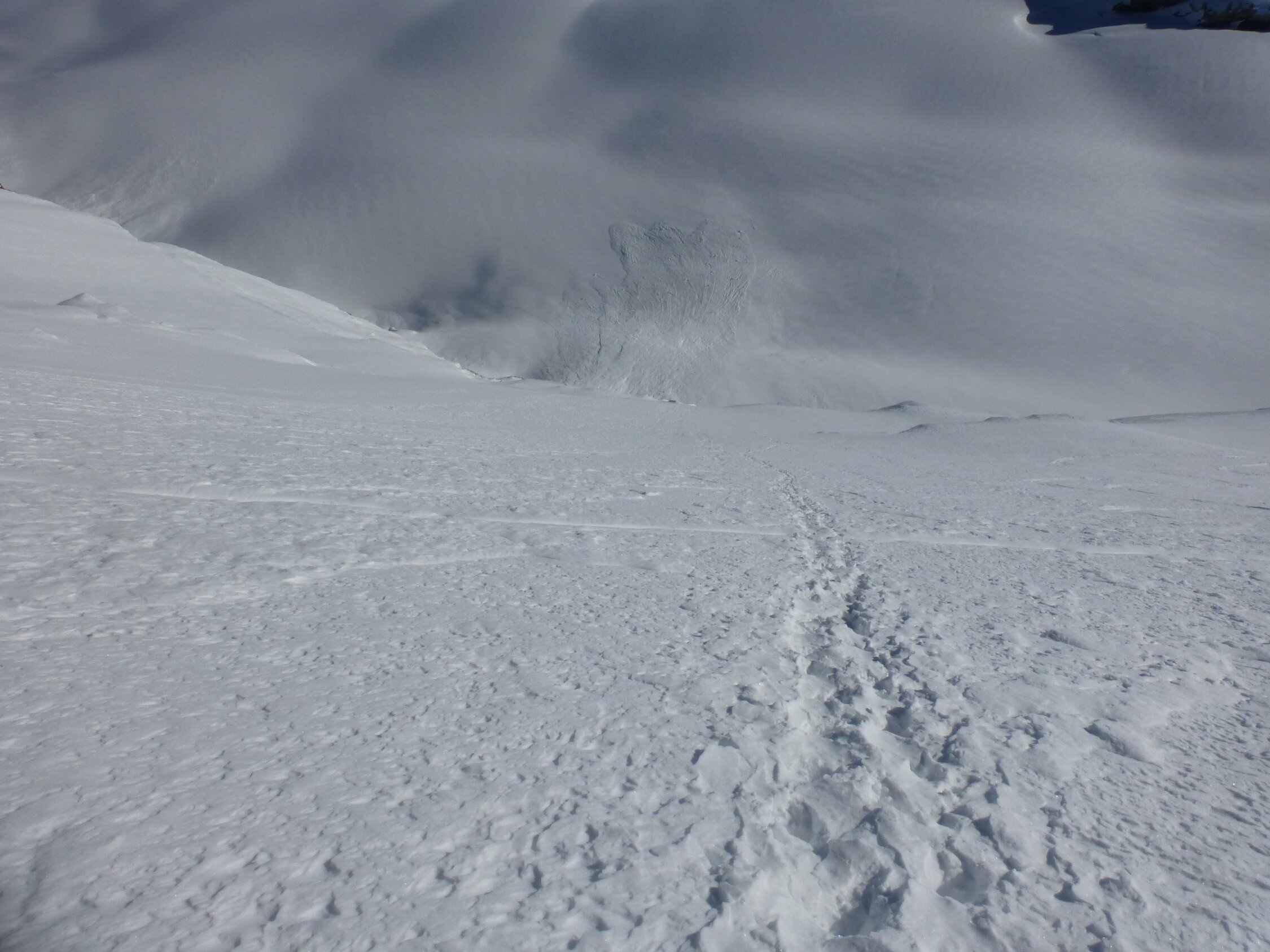 Solange Nullgradgrenze relativ tief ist, sollte Schnee noch gut sein, auch wenn die Einfahrt am Gipfelgrat eisiger wird.
