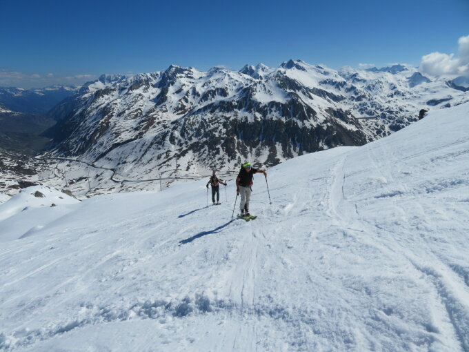 08.30 Uhr Aufstieg, der Schnee war gefrohren. Abfahrt um ca. 11.00 Schöner Sulz auf fester Unterlage. Wo die Sonne nicht direkt einstrahlte war es immer noch hart.