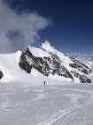 Der Sattelaufstieg schön griffig mit tiefen Spuren, der Grat aper. Alle Gletscher im Gebiet tief zugeschneit. Vormittags harte Kruste, nachmittags Sulz.