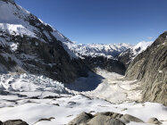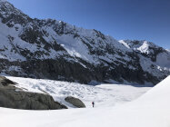 Wir haben in der Finsteraarhornhütte übernachtet. Von dort aus am Morgen über den Fieschergletscher bis ca. 1'900m, dann in Turnschuhen über einen flachen Travers bis zum Staudamm, nachher Wanderpfad nach Fiesch. Von der Hütte bis nach Fiesch brauchten wir 4 Stunden in einem Gelände, das vom feinsten Gletscher über gefährliche Abbrüche bis zur Mondlandschaft reicht.