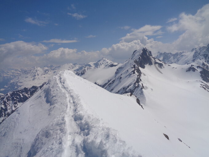 Durchgehende Schneedecke ab Parkplatz Dürrboden. Im Aufstieg tragender Büsserschnee mit gefrorener Kruste, kurz vor Scalettapass dann pickelhart und Schneedecke glatt. Ab hier Harscheisen zu empfehlen, spätenstens aber beim Einstieg in den Nordwestgrat. Von dort steil und hart, ohne Harscheisen fast unmöglich, und auch eine gute Spitzkehrentechnik ist gefordert. Bin bis zum Skidepot 15m unter dem Gipfel, dann zu Fuss auf den höchsten Punkt. Abfahrt um ca. 11.00 genial bis nach Scalettapass mit feinem Sulz, ab dort dann Schnee immer weicher und durchbrechend.