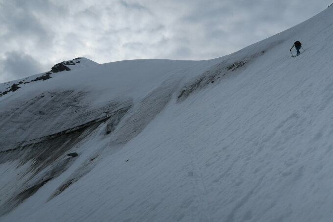 Schi bis kurz oberhalb der Mischbachalm getragen, ab dort durchgängig Schnee. Keine Abstrahlung, weicher (aber nicht tiefer) Frühjahrsschnee. Ab 2900m dünner, gut zu durchbrechender Harschdeckel, der einen Aufstieg mit Fellen bis zum Schidepot ermöglichte. Steigeisen, Pickel ode Harscheisen kamen nicht zum Einsatz, aber der Helm ist bereits im Aufstieg neben dem Habischtschnabel sinnvoll. Fast durchgängig gut zu fahrender Schnee.