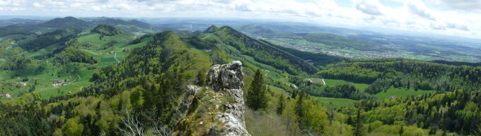 Ungeahnter Panorama-Aussichtsberg von dem man die anderen beiden Belchen sieht im Hochschwarzwald und in den Vogesen, sowie nach Süden das Alpen-Panorama. Früher haben die Kelten wohl diese Felskuppel als Markierungspunkt benutzt, um die Sonnenstände zu bestimmen.
