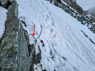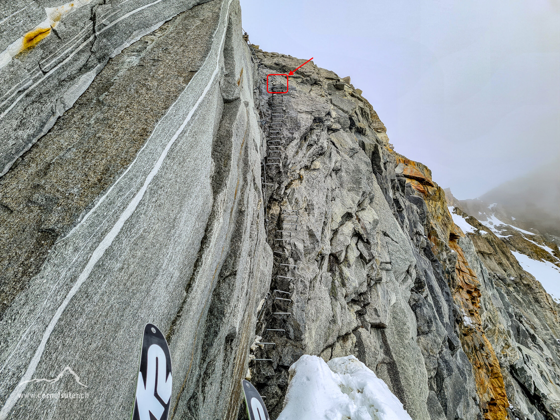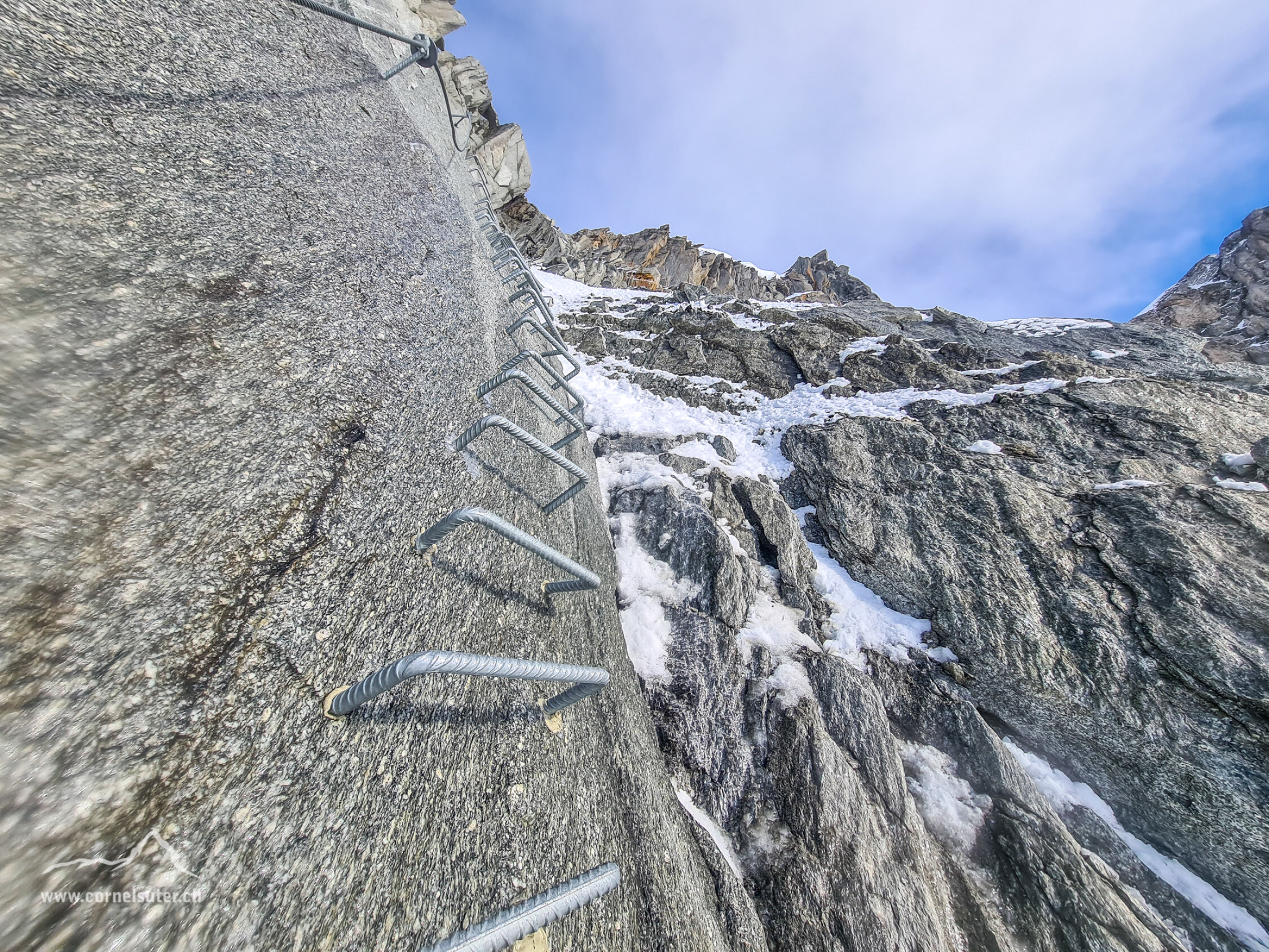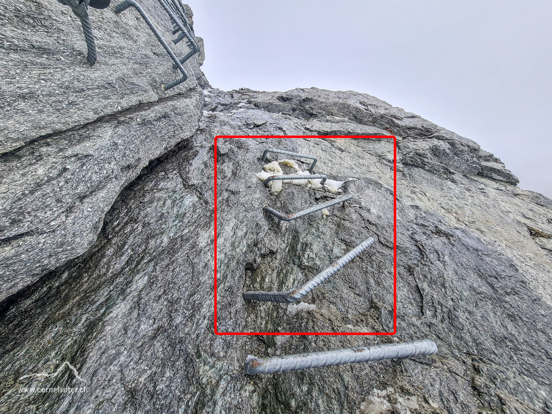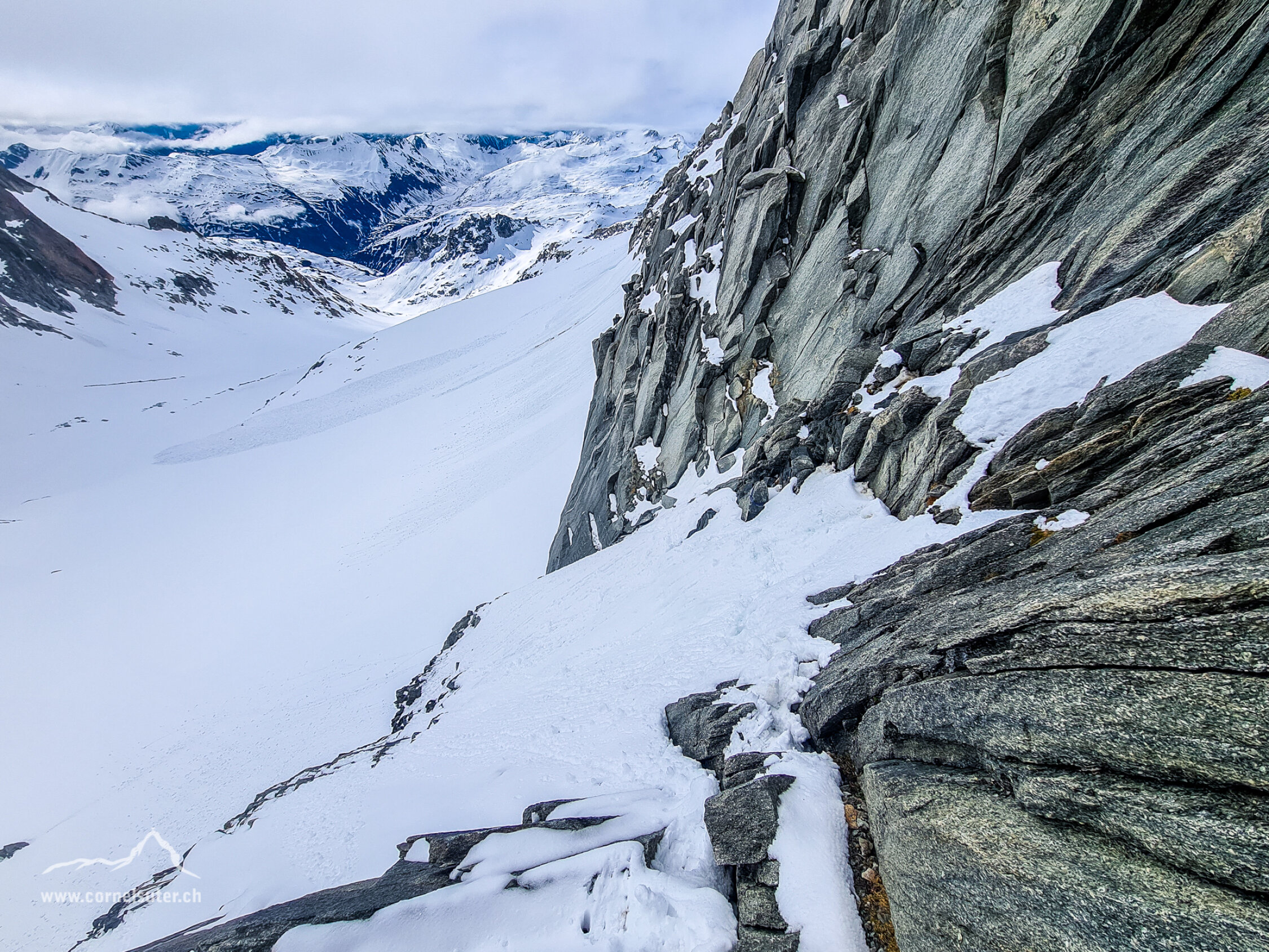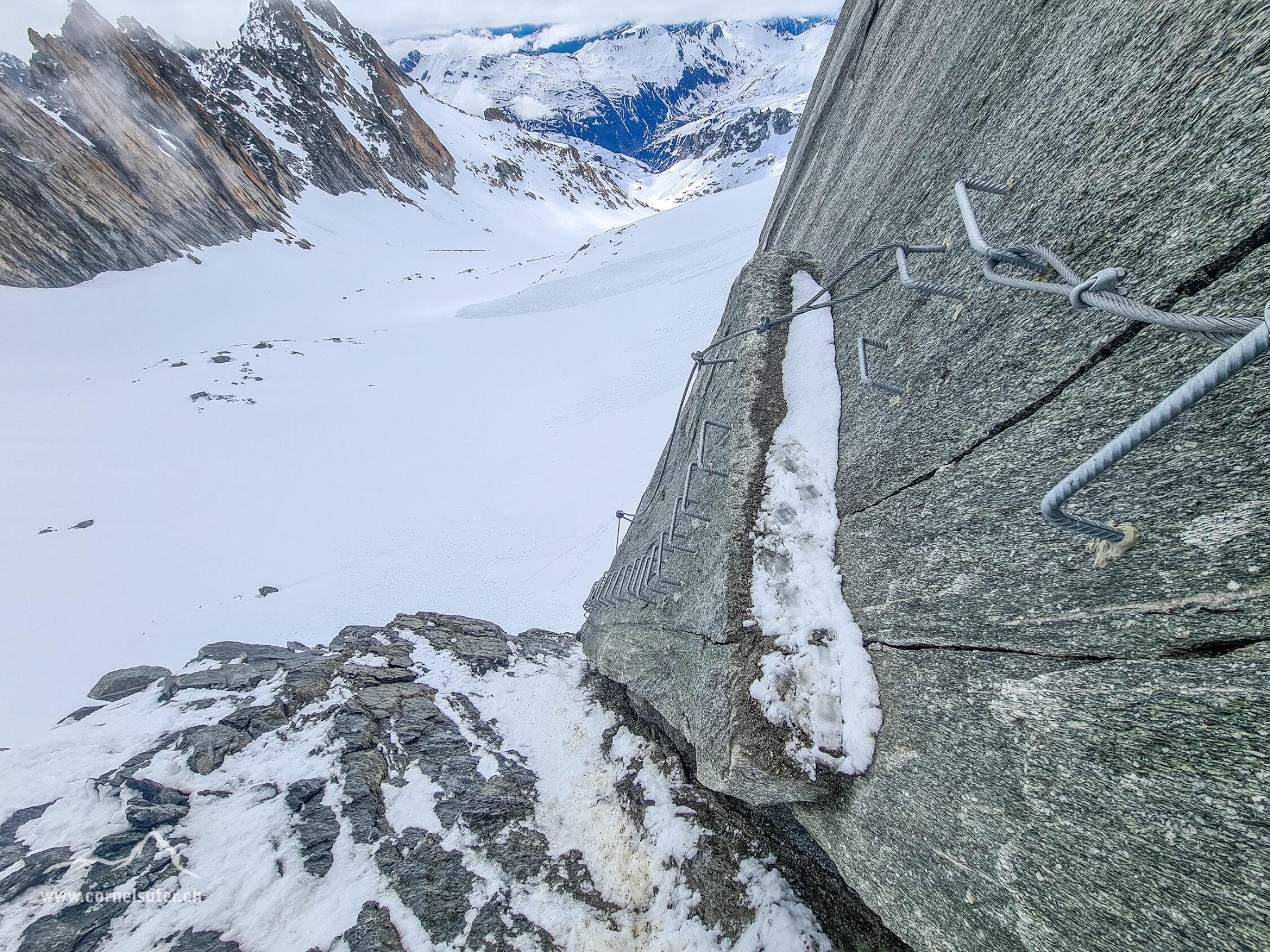 Aufstieg zum Nördlichen Tiefensattel viel Schnee, heute kein Trittschnee, weich und nass, ein paar Eisenbügel wurden ziemlich traktiert und gekrümt.