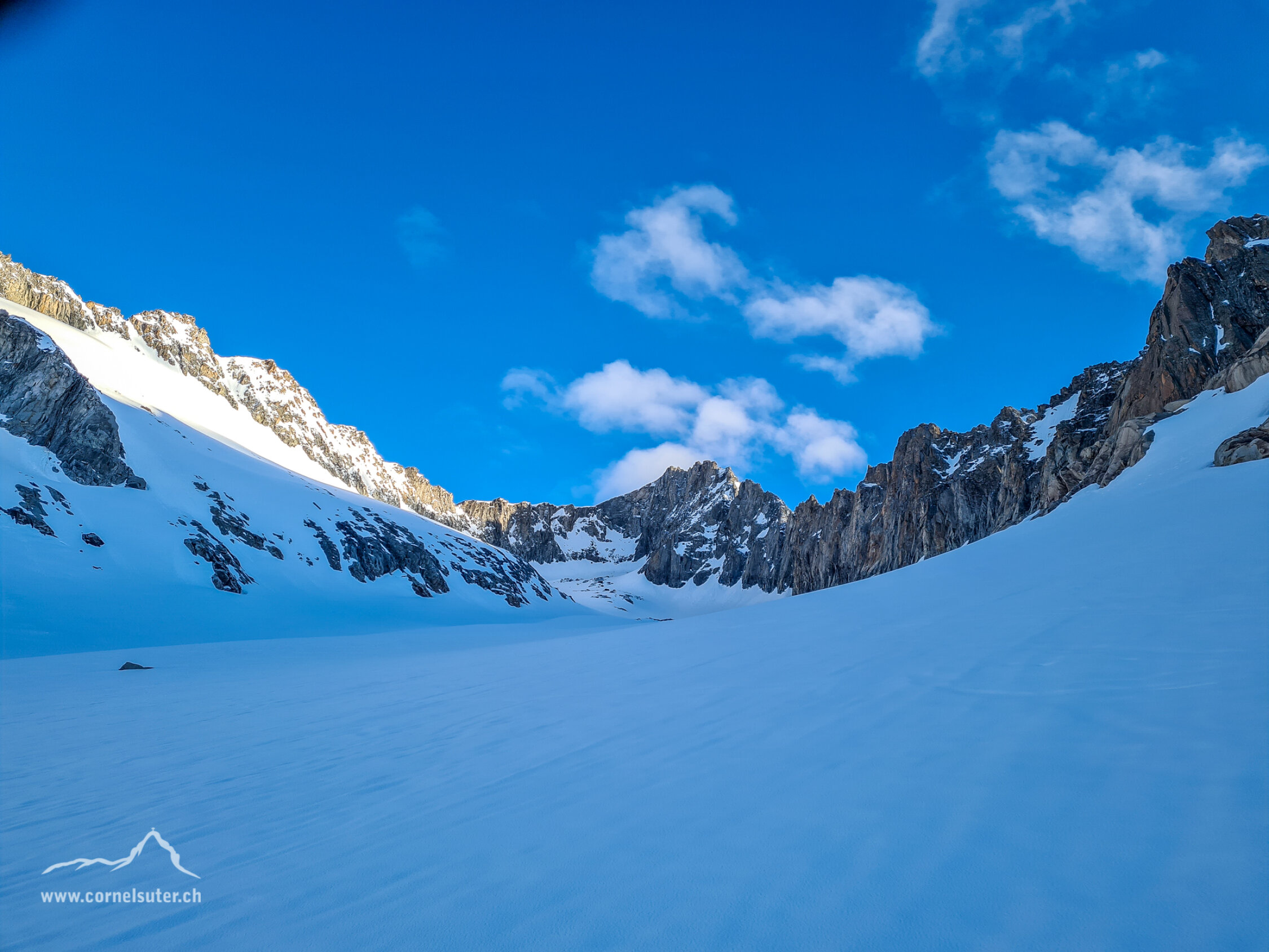 Keine Abstrahlung in der Nacht, daher war der Schnee bis zum Tiefengletscher nicht tragend, ab ca 2700m tragend, ab ca 3000m wenig Neuschnee.