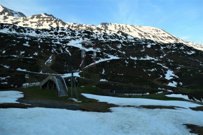 Bleibt sicher noch einige Zeit so wie es ist. Lediglich der Beginn wird eine längere Tragezeit voraussetzen. Start dann am Beginn des Steilhanges. Derzeit ist ein Tourstart noch fast bei der Alpe Rauz möglich. Zwischen Haus und Stall hindurch. Beim Weidezaun Fahrweg rechts hinauf und dann einige Meter über die Wiese fast eben zur Schipiste.