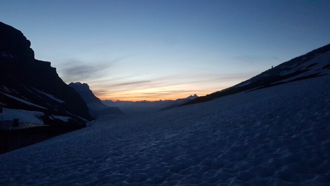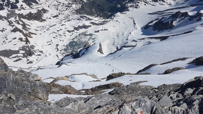 Abfahrt auf dem Gletscher super Sulz (ca 10.15h), unter dem Iiswändli nach und nach in gut fahrbaren Nassschnee übergehend.