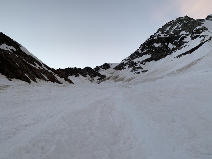Im Aufstieg sind wir in der Engstelle bei P2636 entlang des Wasserfalls an den östlichen Begr3nzungsfelsen aufgestiegen. Im Schein der Stirnlampen sehr eindrücklich. In der Abfahrt sind wir dann fast bis zu den westlichen Begrenzungsfelsen gequert, dort war es dann noch am ehesten fahrbar - siehe Bild Übersicht.