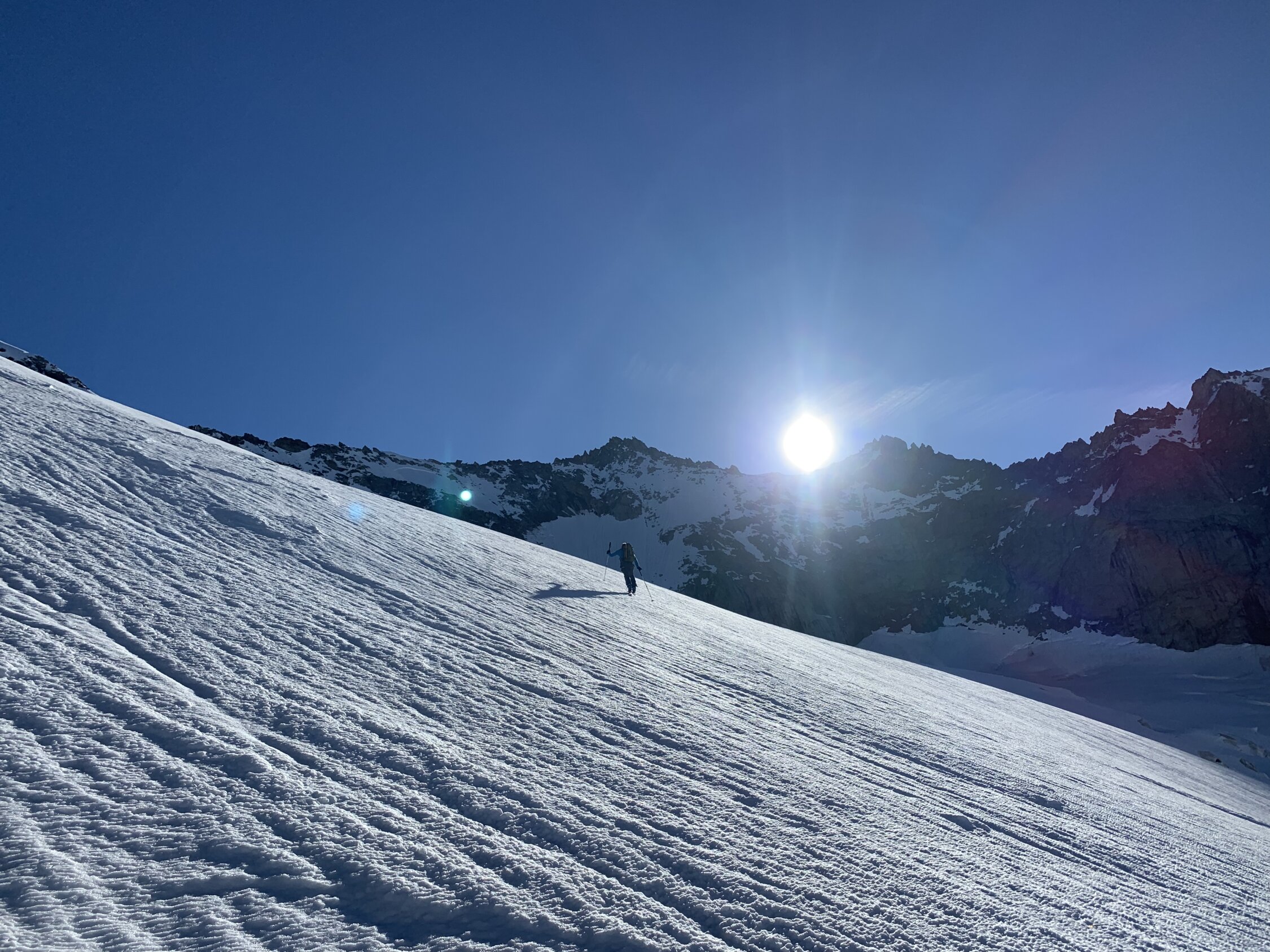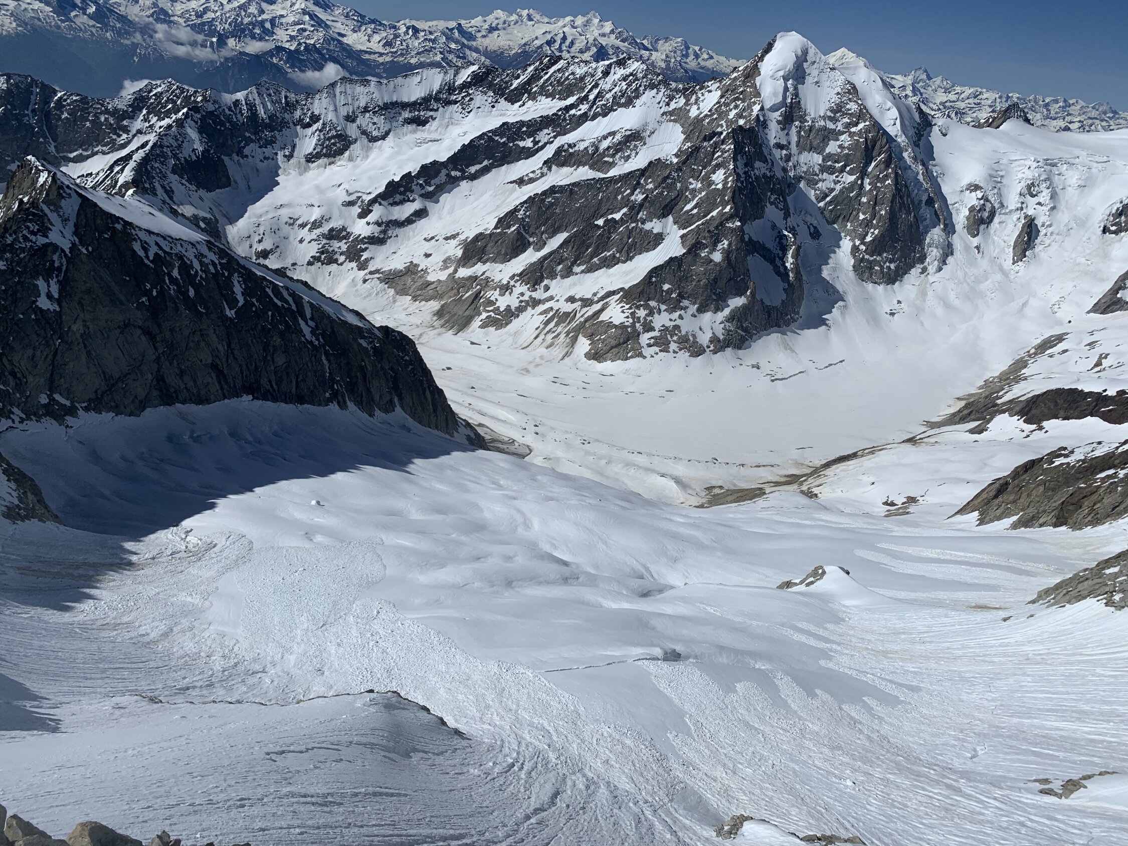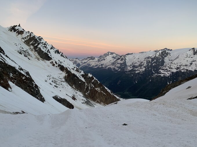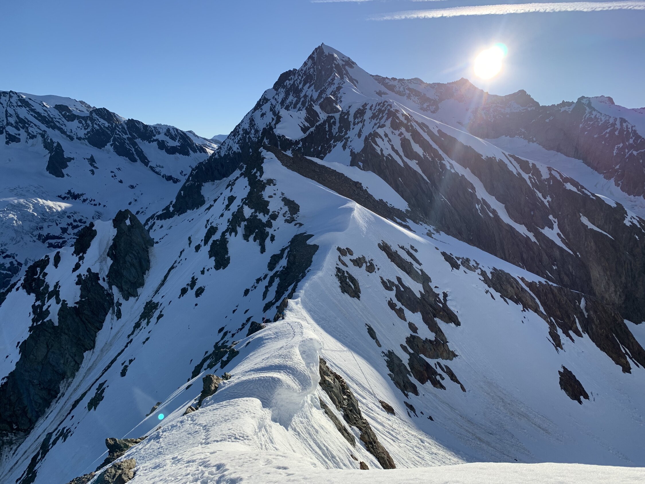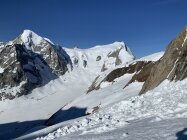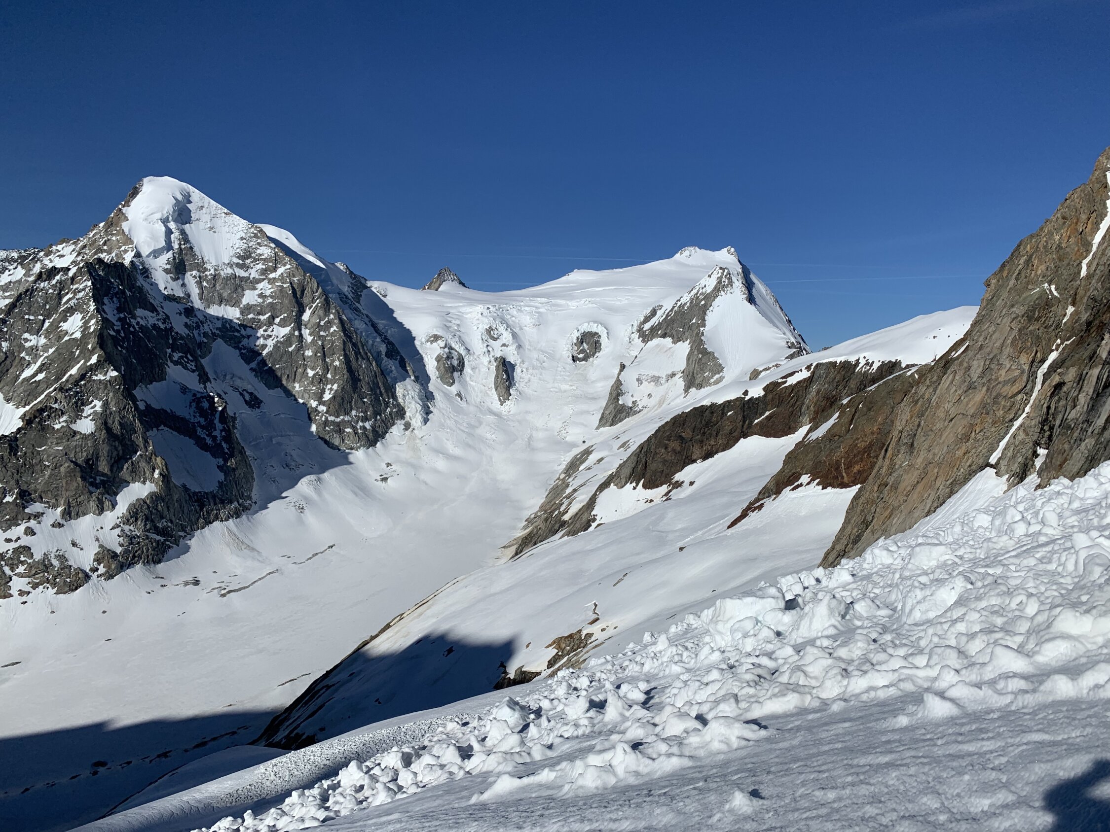 Je nach Sichtweise kann man alles zwischen ausgezeichnet und machbar geben. Ausgezeichnet, weil man Mitte Juni nach 30 min Skitragen bereits auf Ski umsteigen kann, das Wetter perfekt war (stahlblauer Himmel, gute Abstrahlung, praktisch windstill) und alle südseitigen Gletscher morgens perfekt tragend waren. Keinerlei heikle Spaltenbrücken, Gipfelaufbau in sehr gutem Trittschnee machbar. Ausser Pickel & Leichtsteigeisen war kein zusätzliches Material notwendig.